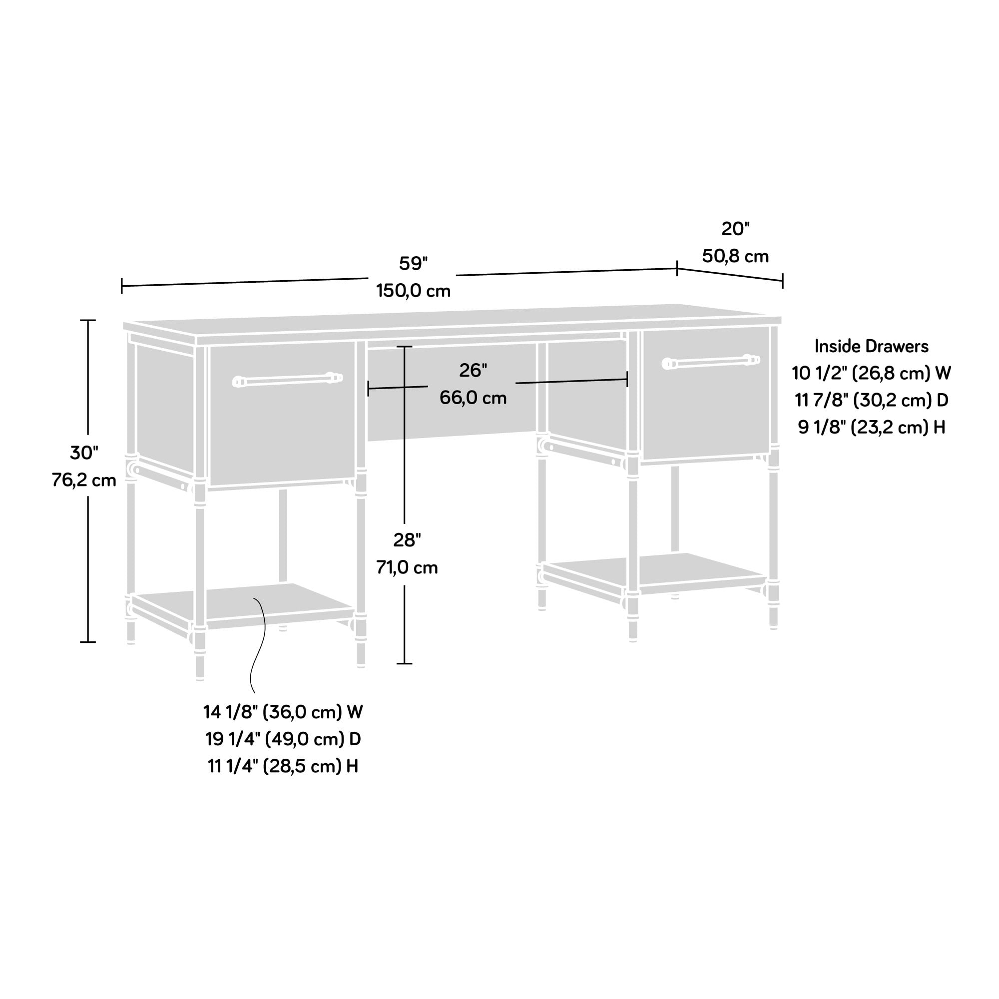 Assembled Dimensions: 59.06″ L x 20.0″ W x 30.0″ H Item features strong and lightweight panel construction”easy to assemble and move Drawers with full extension slides hold letter-size hanging files Two lower shelves for additional storage and display of your items Finished on all sides for versatile placement in any room of your home Designed with a textured, powder coated metal pipe frame Finished in a traditional Checked Oak Model #: 427134 Box Dimensions: 64.69″ L x 22.64″ W x 7.68″ H For additional questions or any issues, please contact the manufacturer at 1-800-523-3987. Be sure to check out the Sauder Iron City collection for more great items!