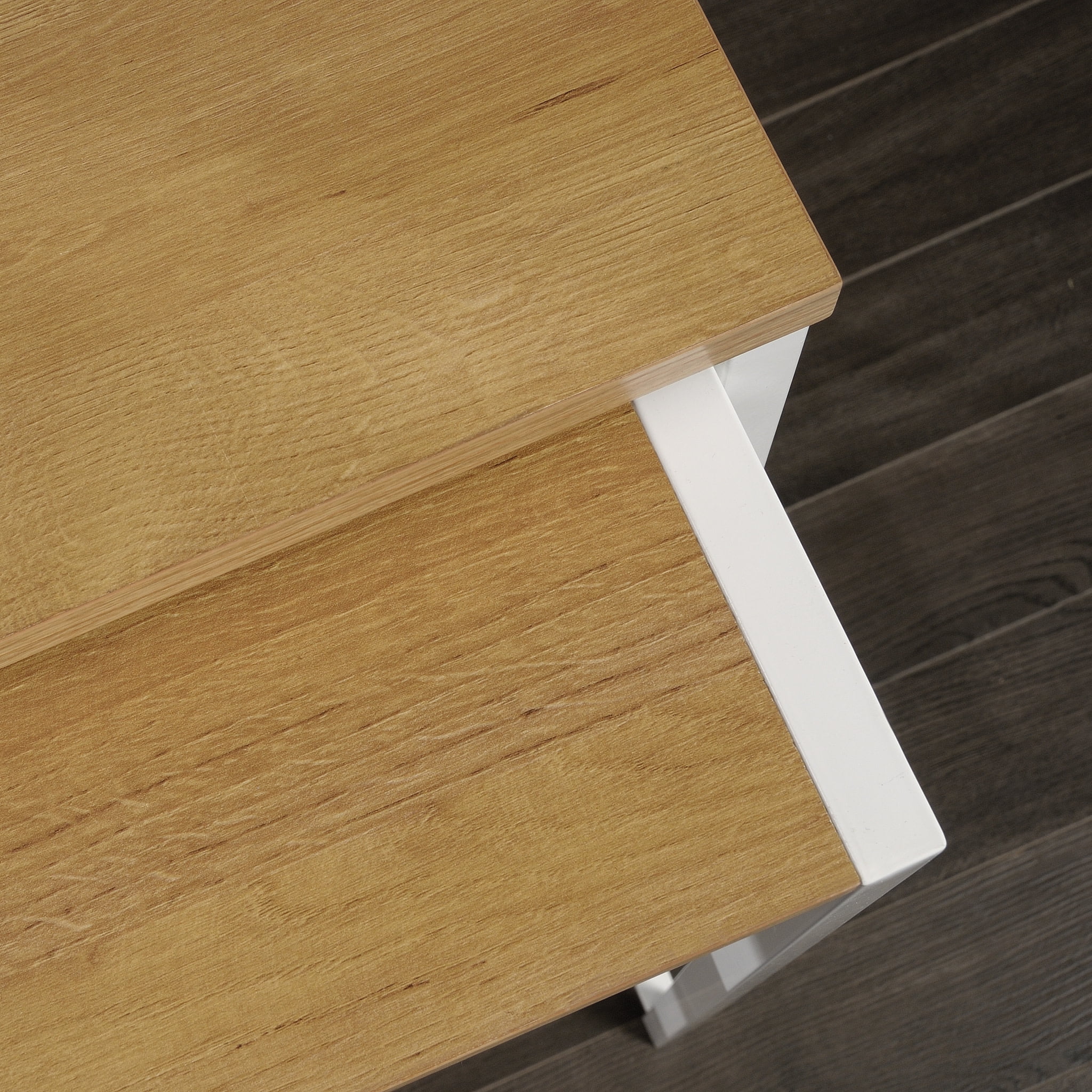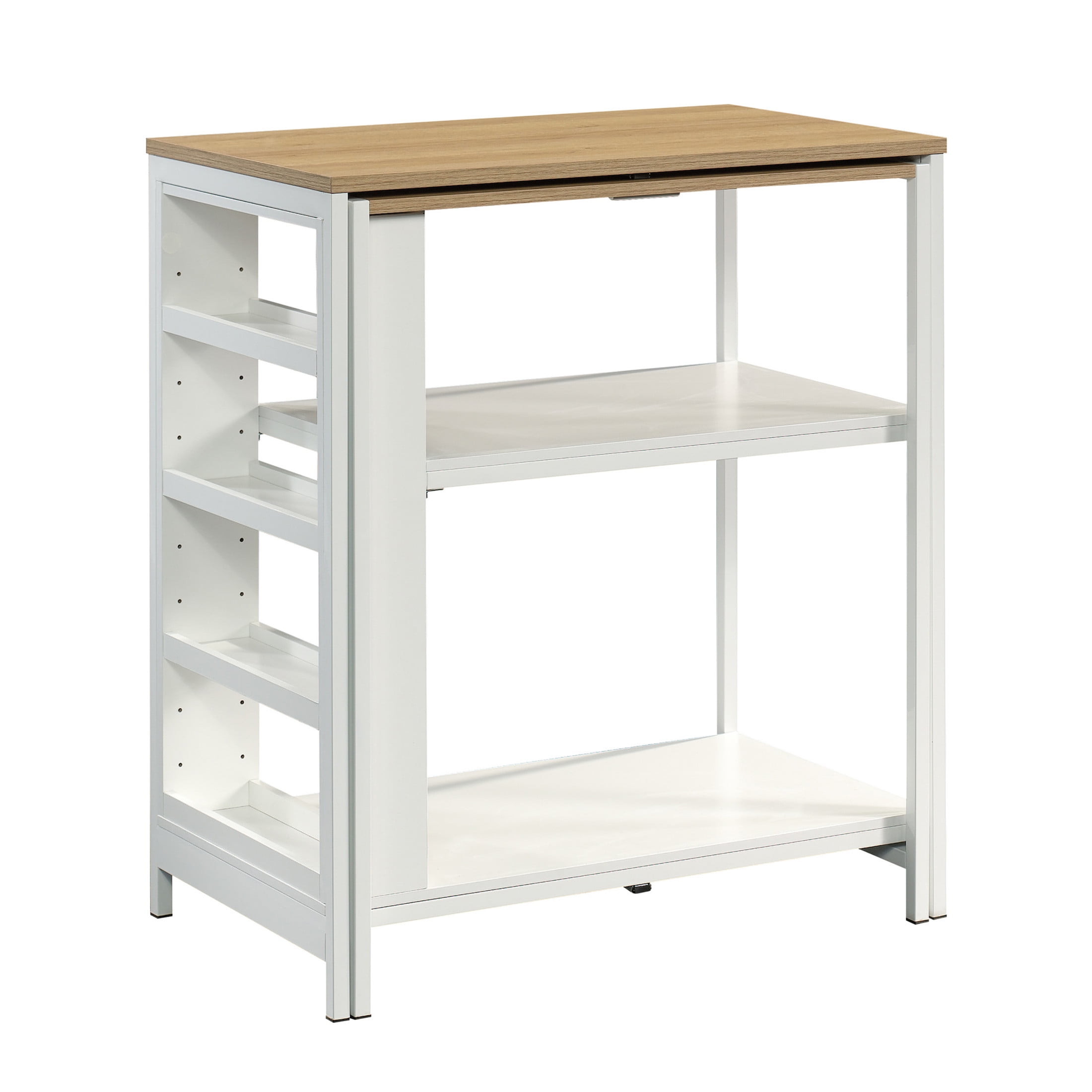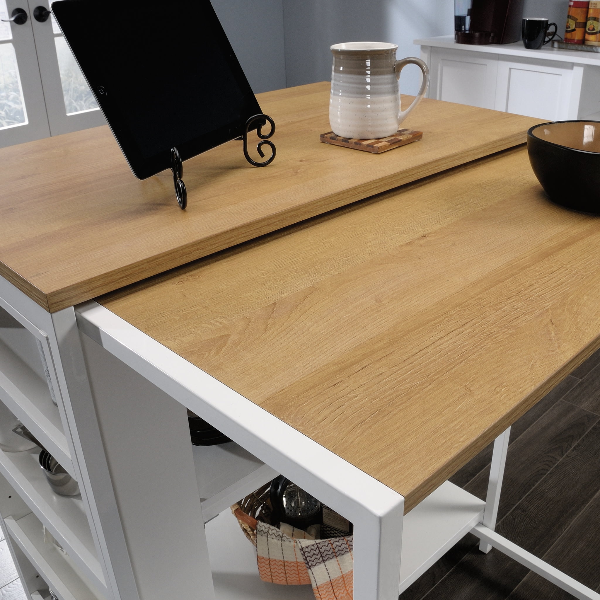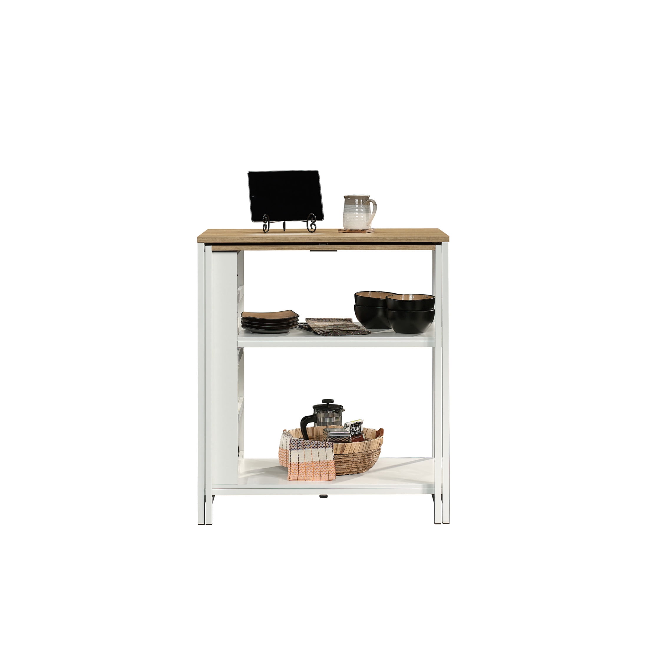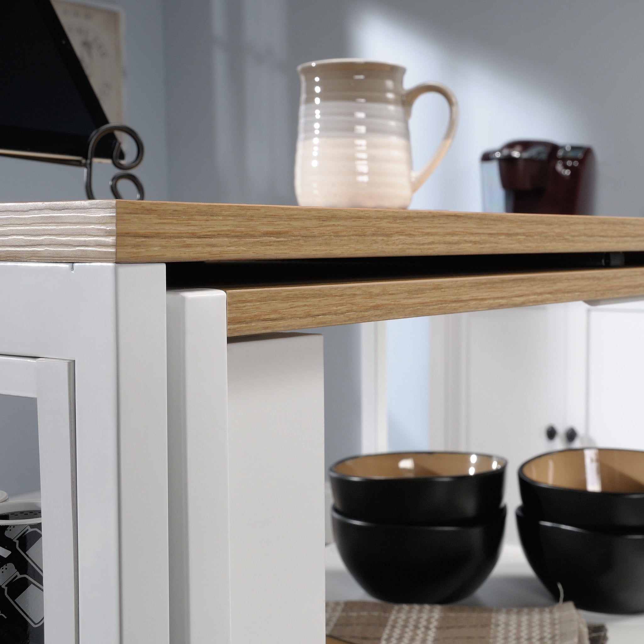 Need extra counter space in your kitchen? Are your cupboards looking a little full? No need for a complete remodel when there is this kitchen island from the Sauder Select collection. This metal kitchen island is counter-height and can have multiple functions in your kitchen: From acting as an island or multipurpose stand to storing kitchen appliances when they are not in use. A convenient hidden top extends on metal framing to provide additional prep surfacing when needed. Both the top and slide-out surface of this moveable kitchen island feature melamine top-coating which is heat, stain and scratch-resistant. This counter height table is the perfect place to sharpen your cooking skills! This kitchen island with storage features three adjustable shelves to accommodate a variety of kitchen items like spices, bottles, wine glasses and more. Constructed with a durable, white metal frame and a White finish with Baltic Oak accents, this multipurpose kitchen island adds needed storage space and style to your home.
