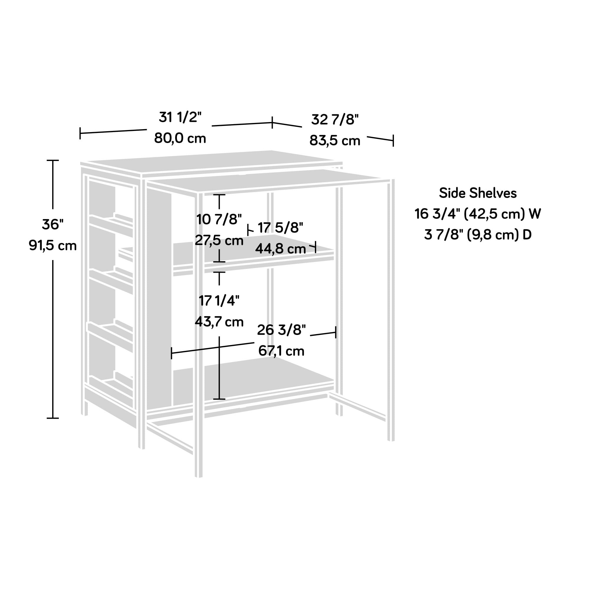 Assembled Dimensions: 31.5″ L x 32.84″ W x 36.02″ H Counter-height, multi-purpose table for kitchen storage and prep Top and slide-out surface feature melamine top-coating which is heat, stain and scratch-resistant Three adjustable shelves for spices, bottles, wine glasses, and more Durable, white metal frame White finish with Baltic Oak” accents Model #: 428253 Box Dimensions: 40.55″ L x 22.25″ W x 5.31″ H For additional questions or any issues, please contact the manufacturer at 1-800-523-3987. Be sure to check out the Sauder Miscellaneous Storage collection for more great items!