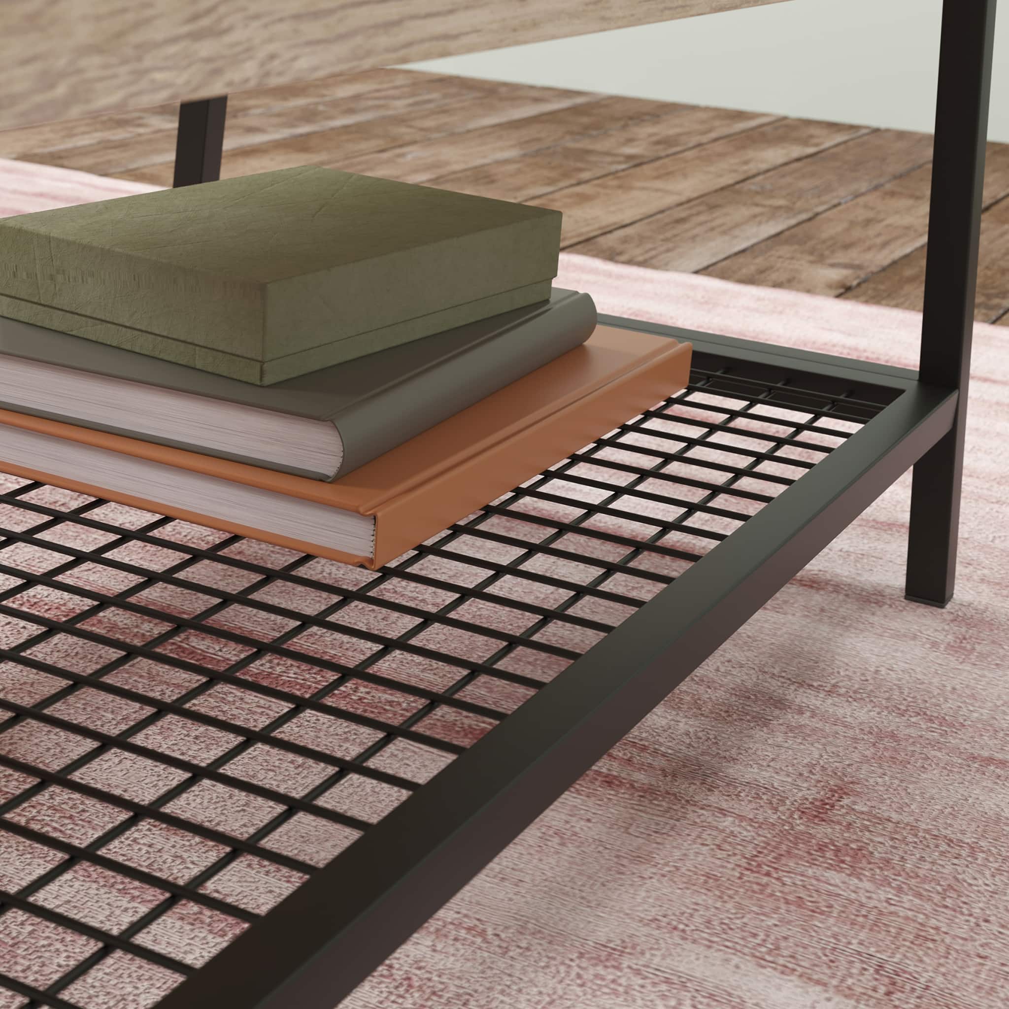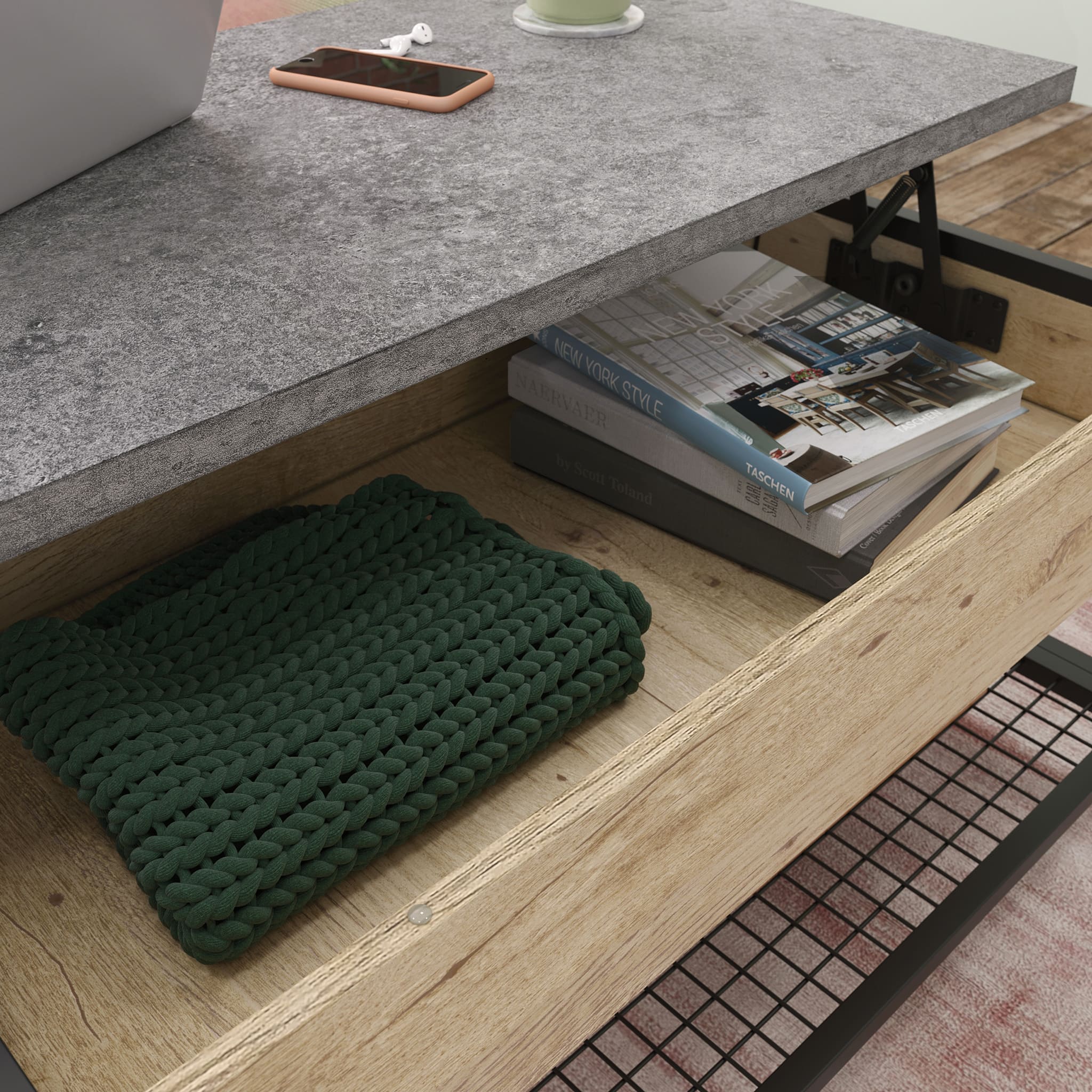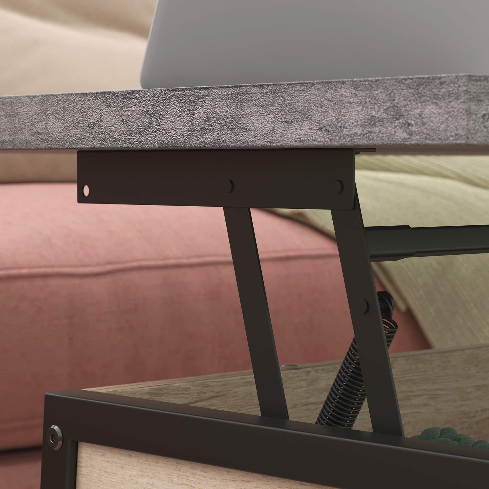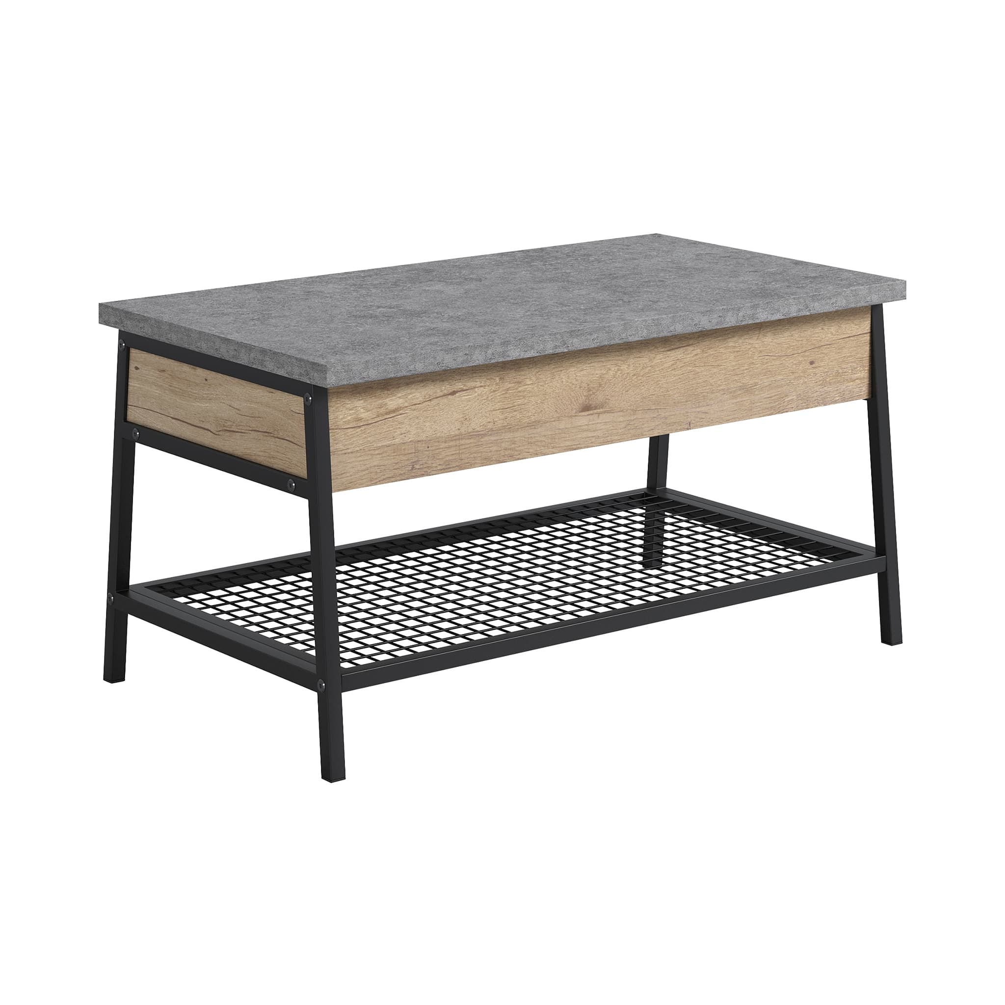 Is your couch too comfy to leave but you still have work to get done? We have a solution for you. This lift-top coffee table from the Market Commons collection is the best of both worlds. The top of this storage coffee table lifts up and forward creating a multipurpose surface so you can work, browse online, or eat dinner while relaxing on your couch. With a lightweight, 1″ panel construction, this lift-top coffee table with storage is easy to assemble and durable to last through years of movie marathons. Beneath the top surface of this coffee table with lift-top is a hidden storage area that is ideal for items like blankets, books, the remote, and more. The lower open wire mesh shelf provides you with even more space to store and display things like organizing bins, board games and home décor. This coffee table with storage is finished on all sides for versatile placement throughout your home. Finished in Prime Oak with Slate Gray accent, this lift-top coffee table is the perfect statement piece in any room.