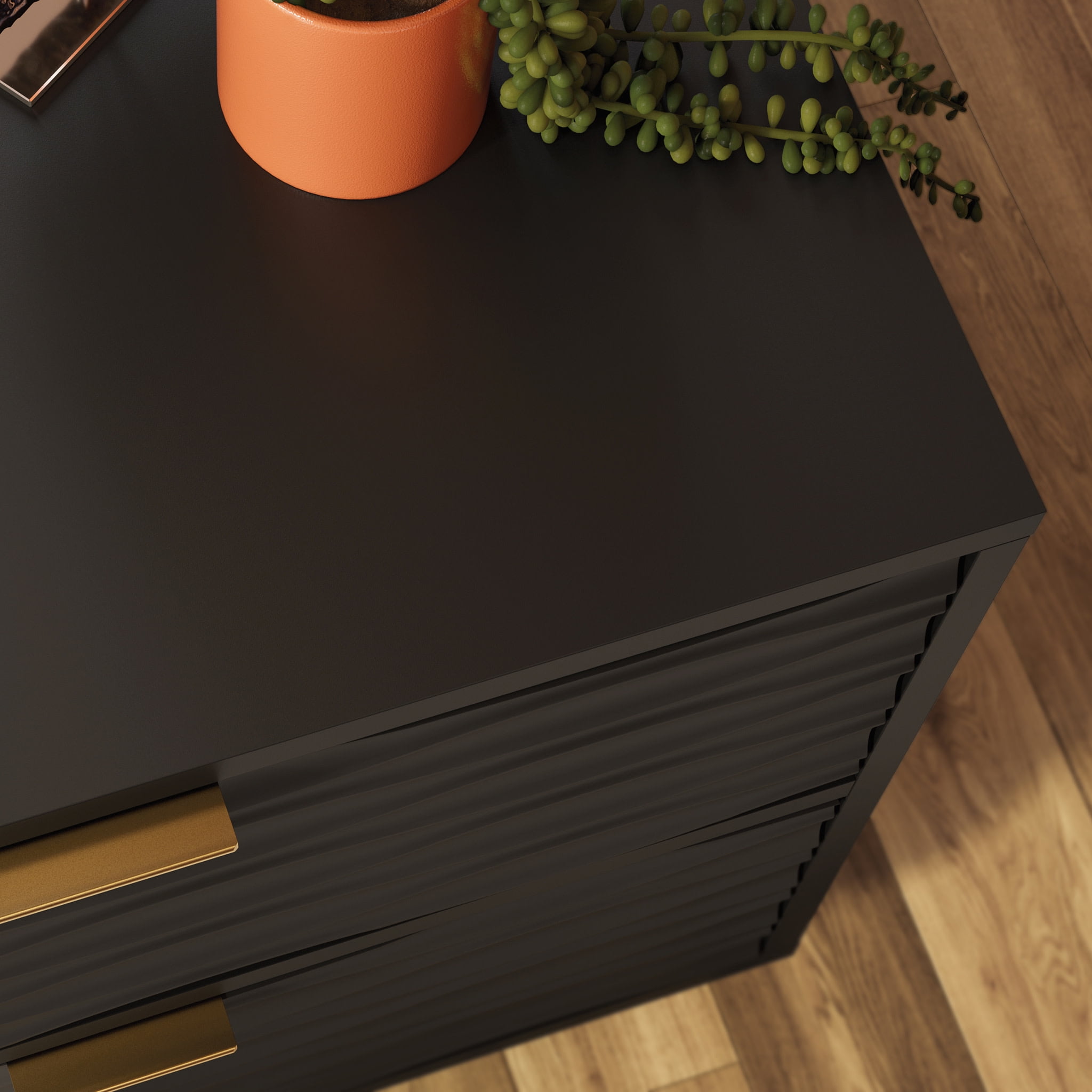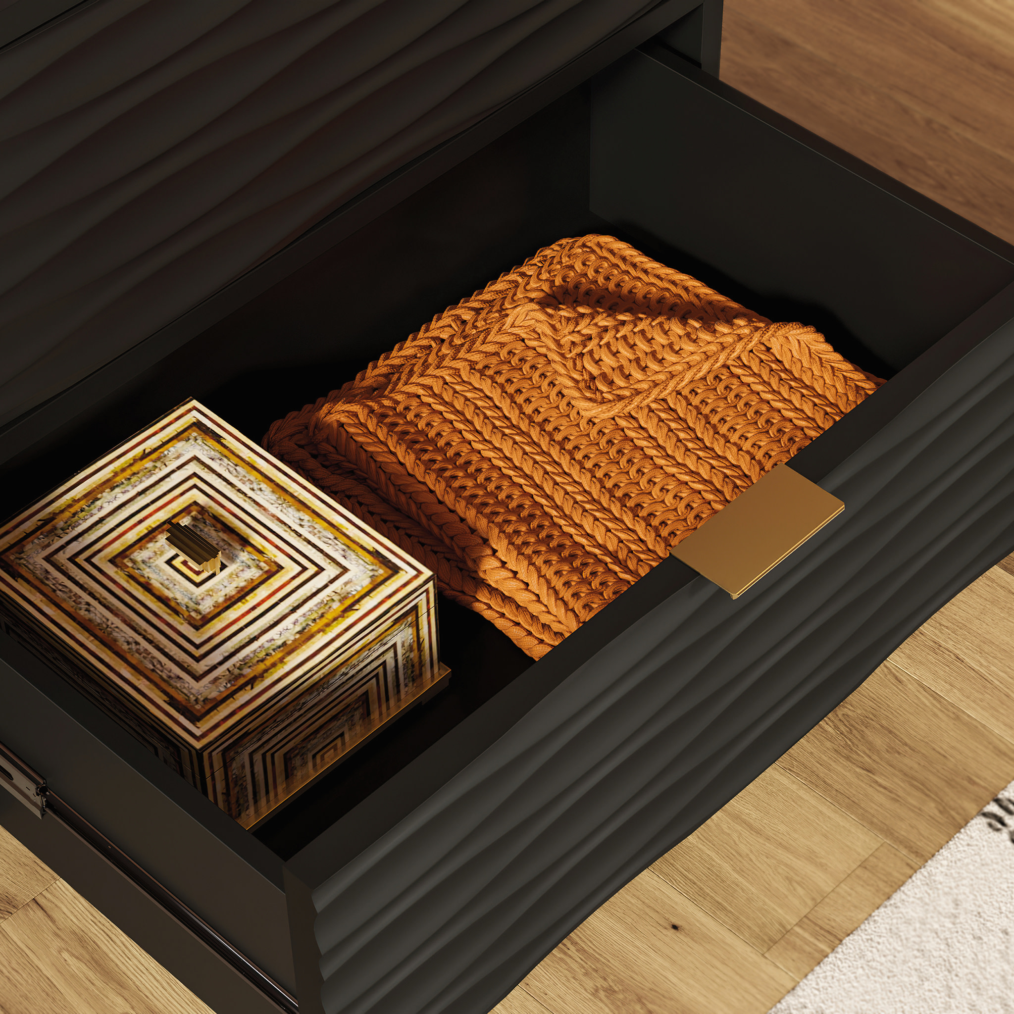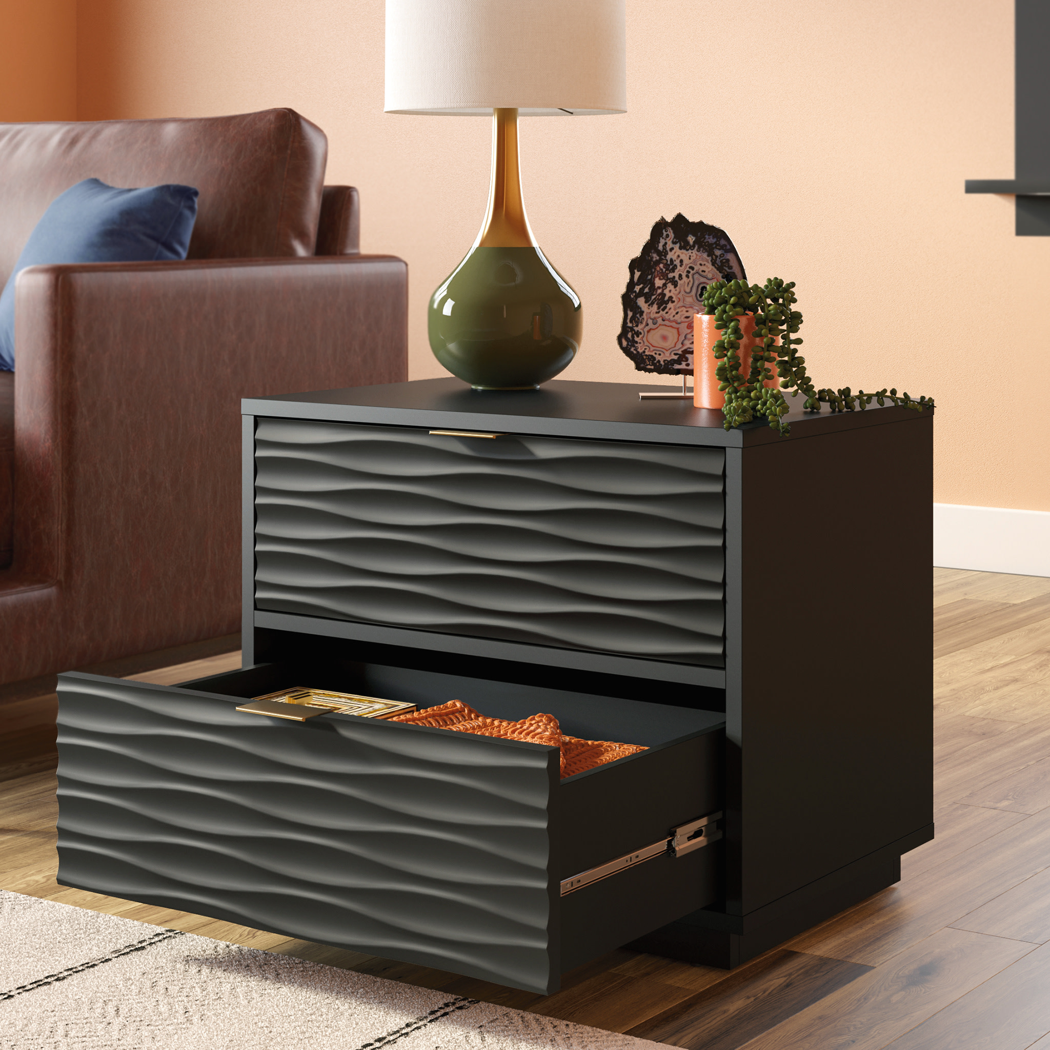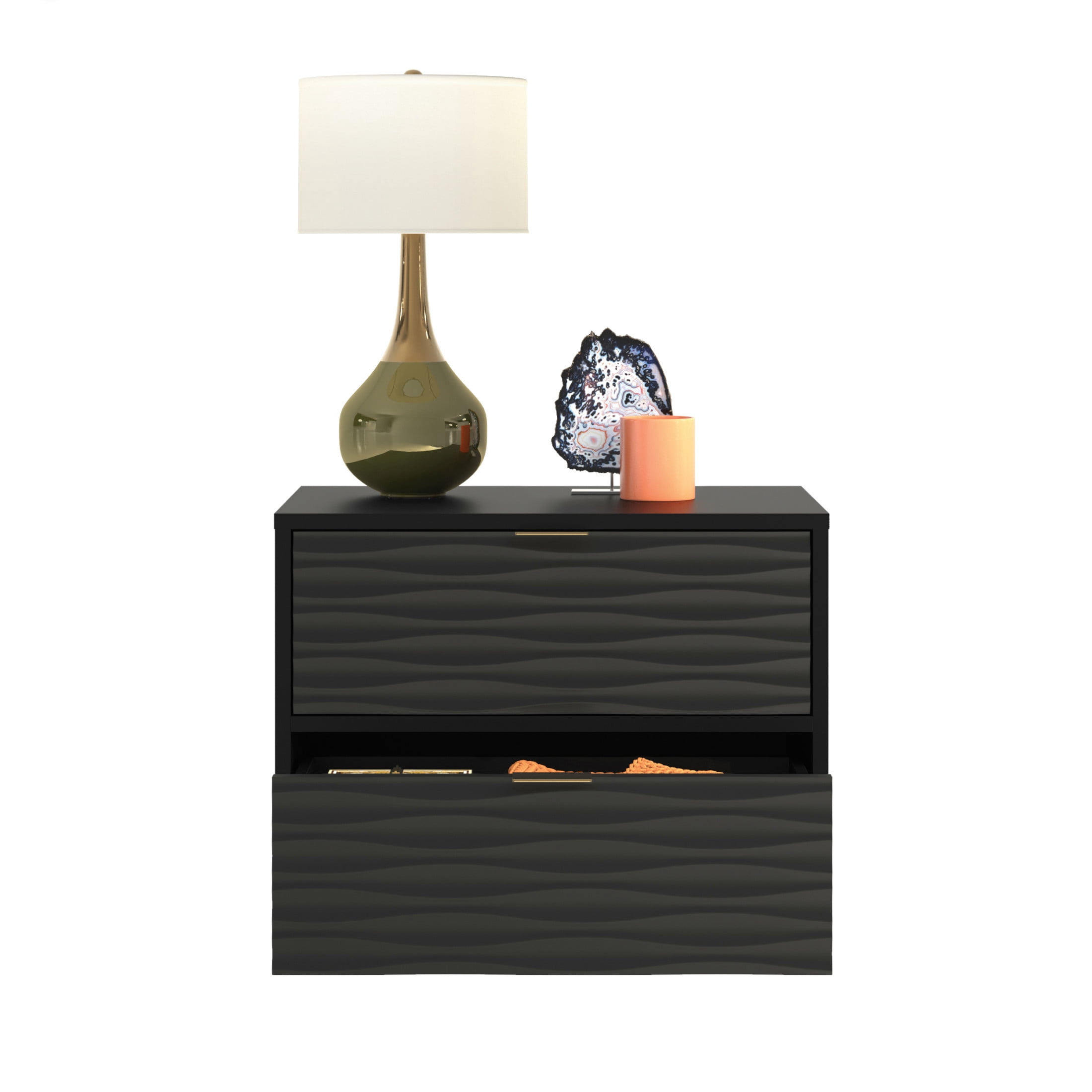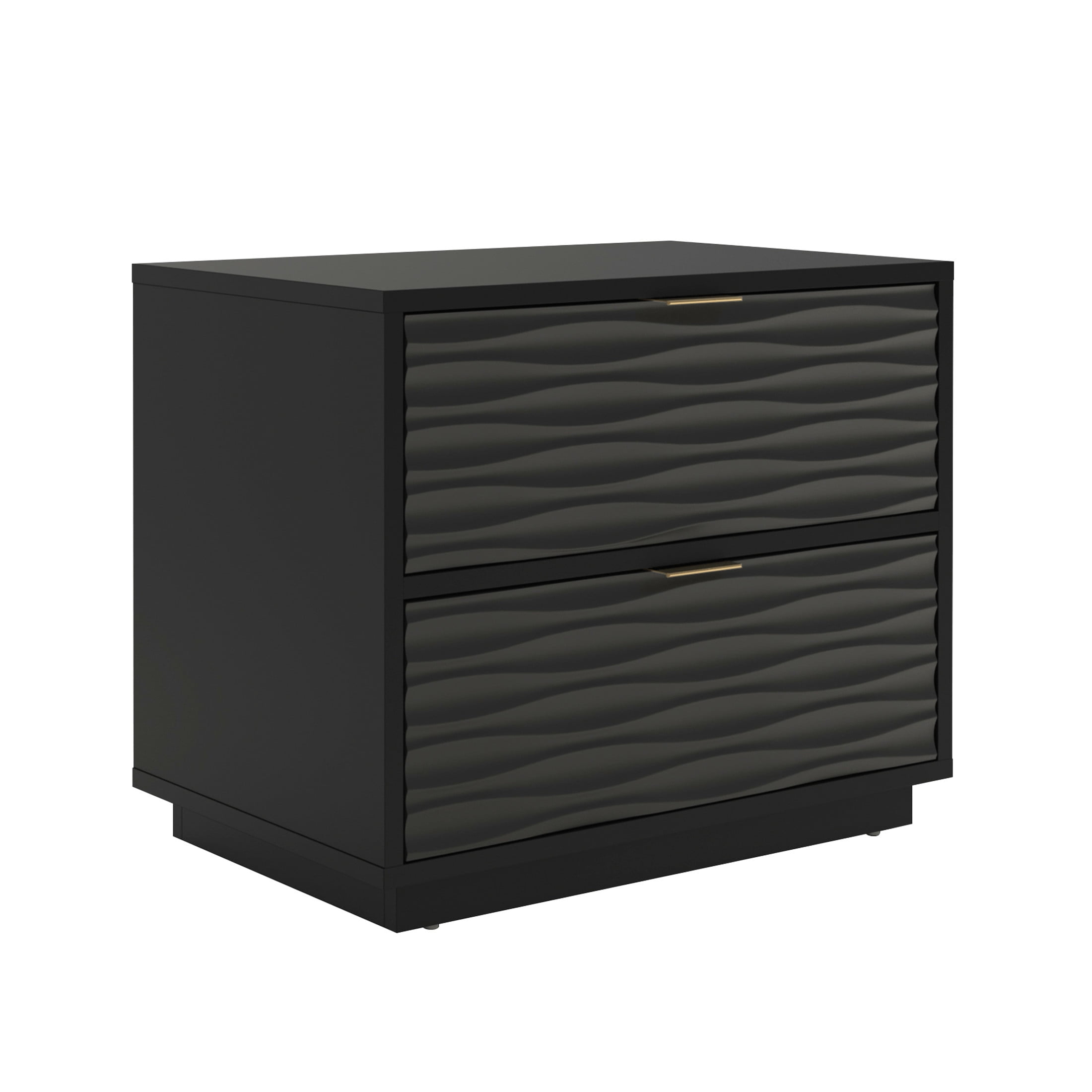 For a modern chic look in any bedroom, living room, or guest room, this 2-drawer side table from the Morgan Main collection offers that, and plentiful storage. This side table with storage features two spacious drawers with metal runners and safety stops, best for storing remotes, magazines, books, your journal, and more. Use the top surface of this side table with drawers as the perfect spot for a lamp, home decor, aromatherapy sprays, and your electronic chargers. A decorative wave pattern gives this 2-drawer end table a unique, modish look that is sure to catch the eye of guests and your family members. Finished on all sides for versatile placement, this end table with drawers will look polished from every angle. A deep Black finish gives a complex design and unique aesthetic, which will surely enhance any room in your home.