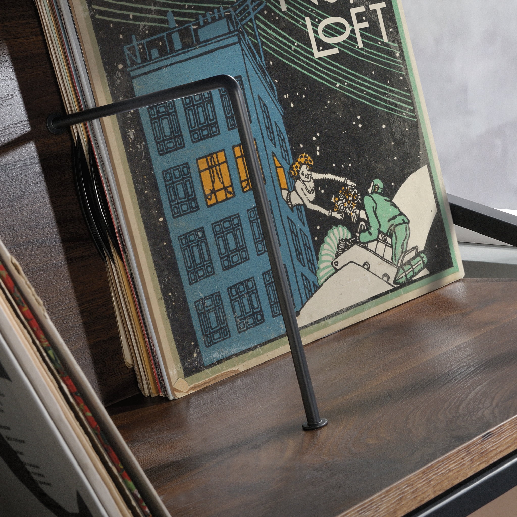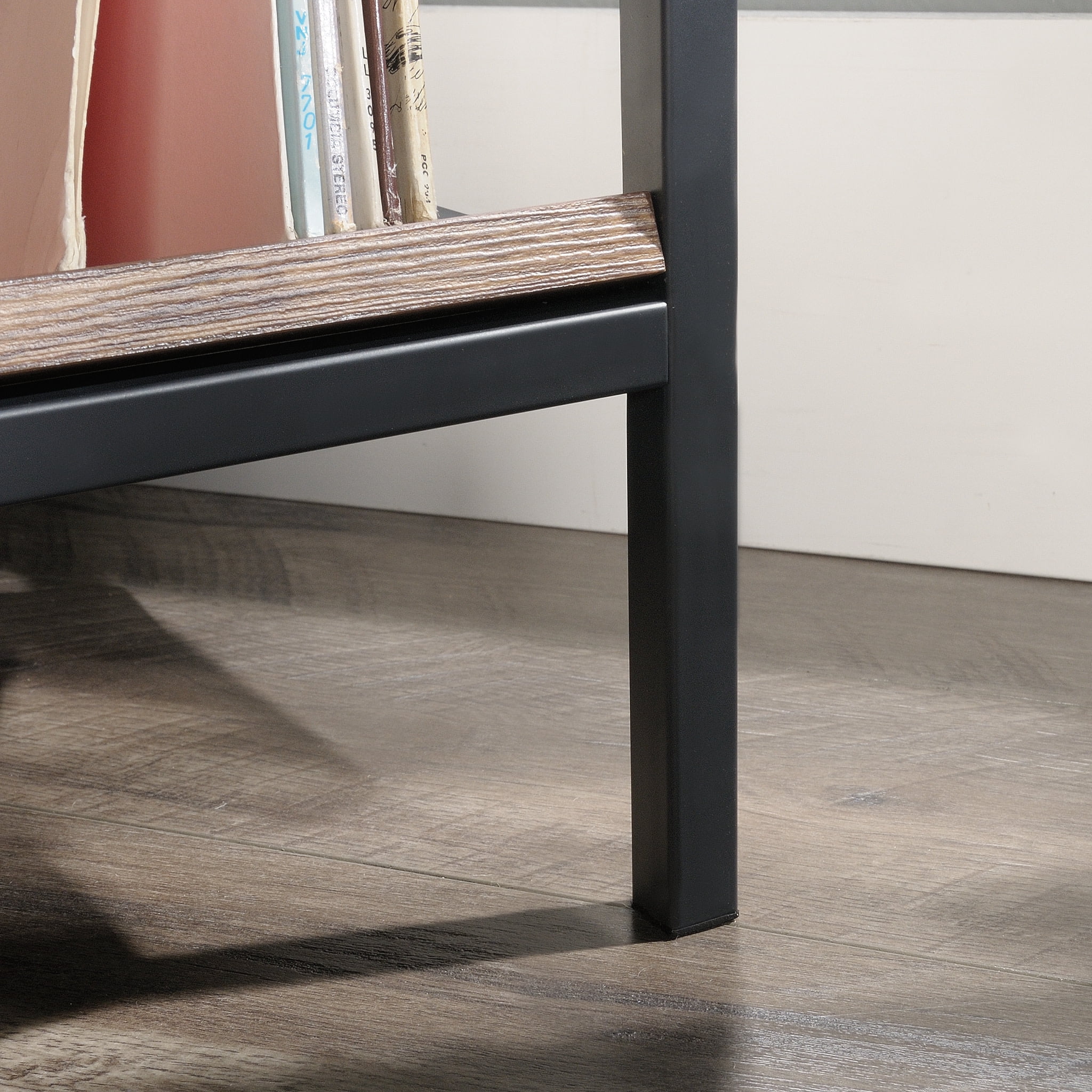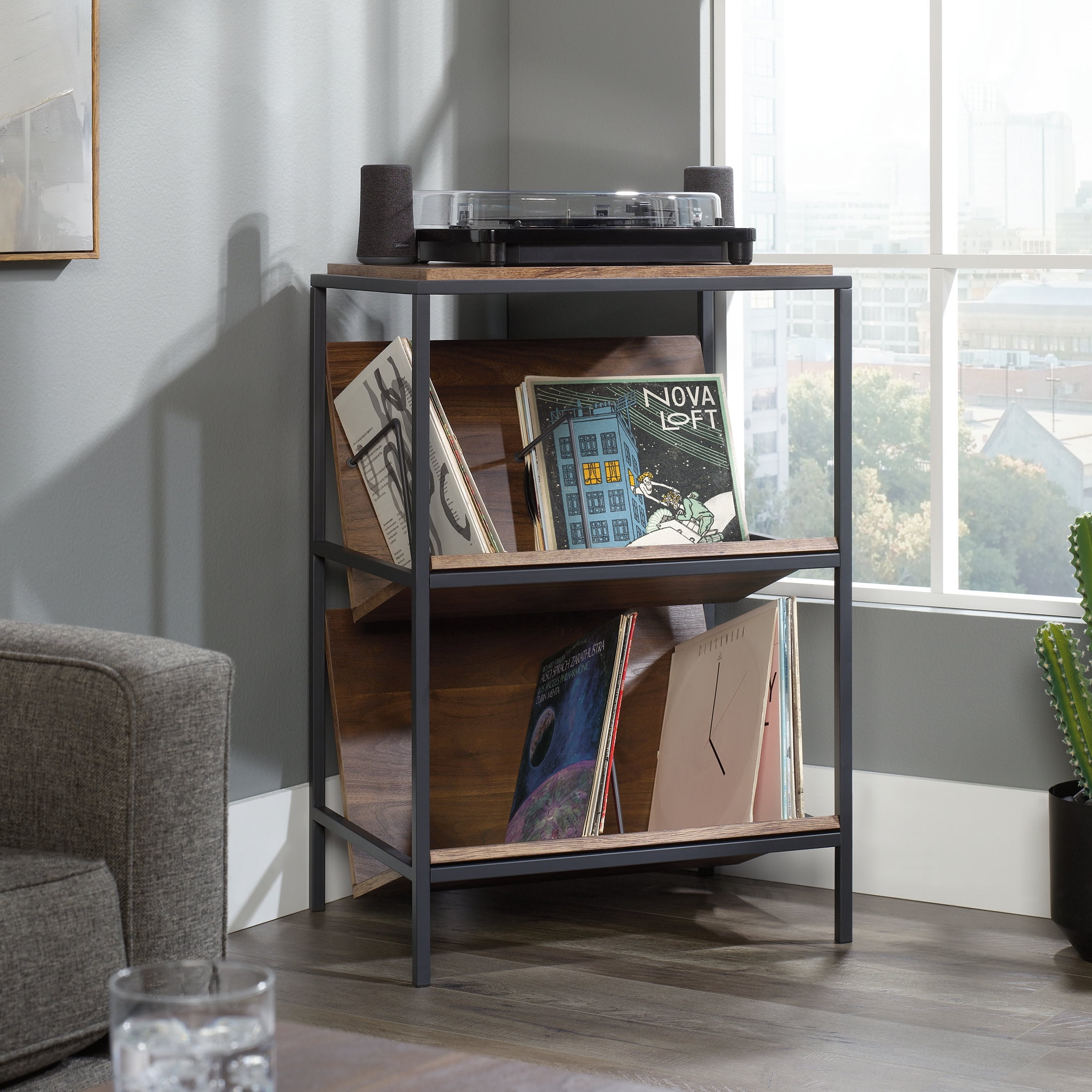 Assembled Dimensions: 25.12″ L X 18.50″ W X 36.81″ H Tilted shelves ideal for vinyl record albums, books, or magazines Finished on all sides for versatile placement anywhere in your home Powder coated metal frame for durability Grand Walnut finish Model #: 423714 Box Dimensions: 39.78″ L x 27.77″ W x 10.84″ H For additional questions or any issues, please contact the manufacturer at 1-800-523-3987. Be sure to check out the Sauder Nova Loft collection for more great items!