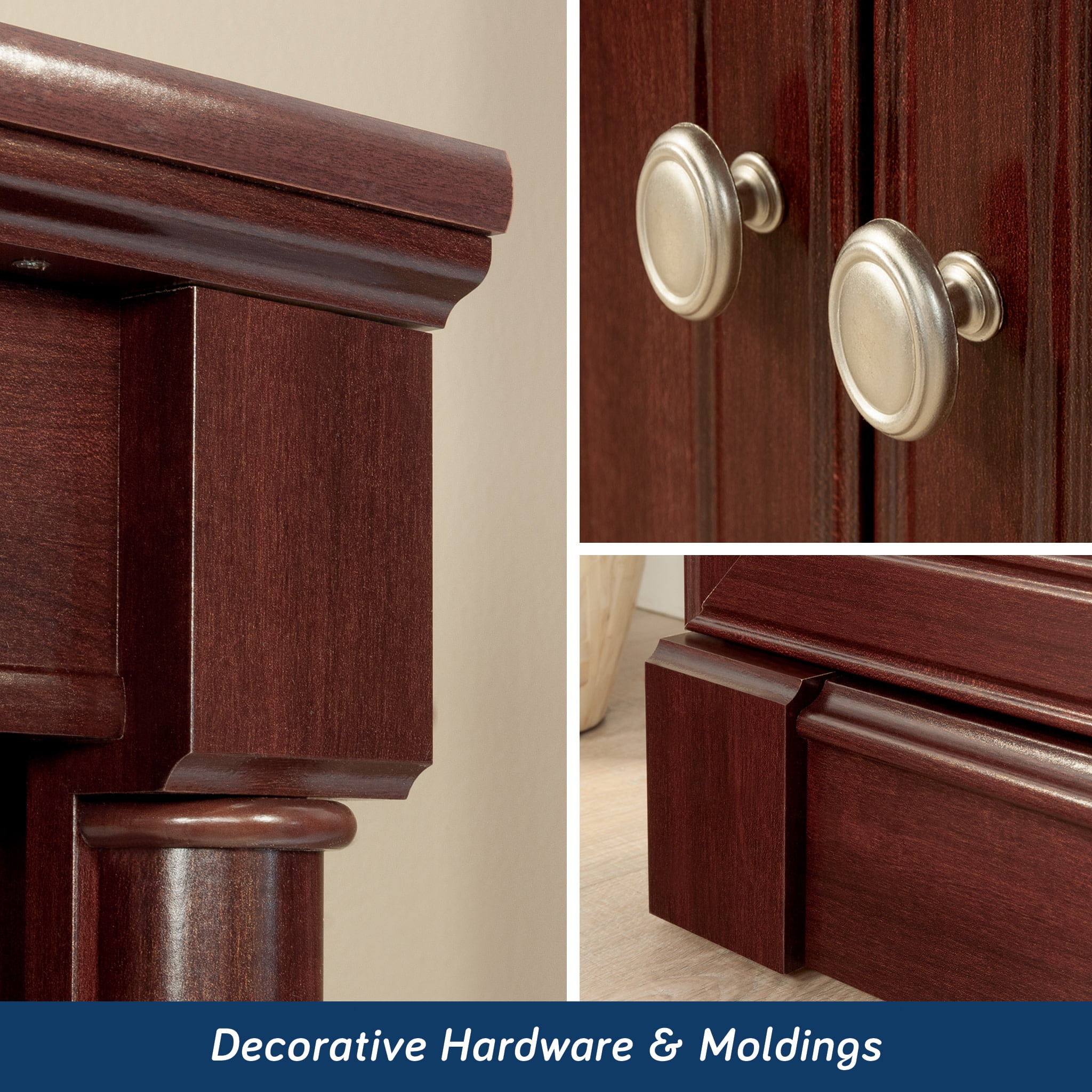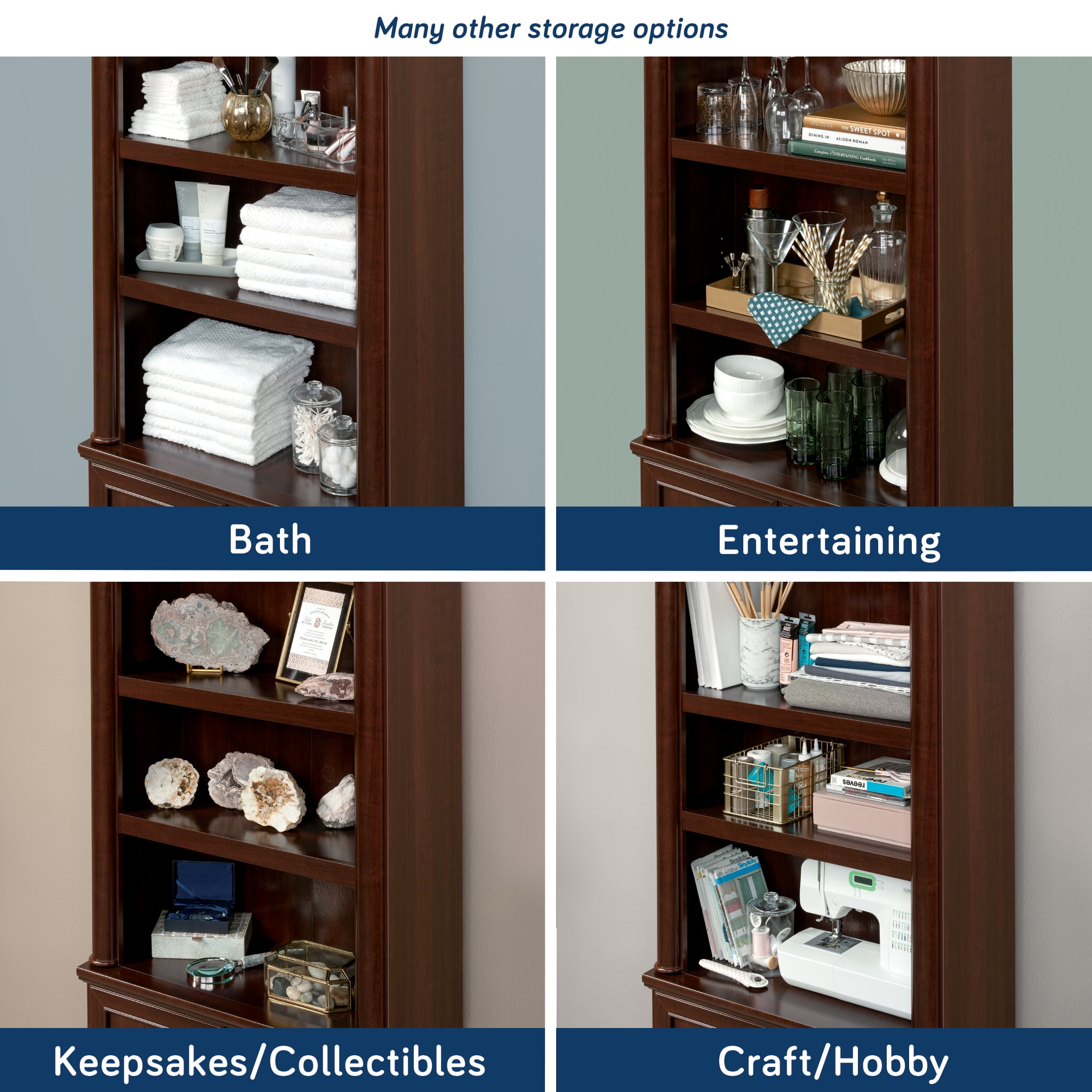 Storage that makes a statement – that is the essence of this beautiful library bookcase from the Palladia collection. This library with doors features three spacious, open shelves ideal for storing and displaying collectibles and keepsakes to show off to friends and family. With two of those being adjustable shelves to create flexible storage options, this 5-shelf bookcase is ideal for at-home entertaining, craft supply organization or bathroom storage. From bottles of wine to bottles of shampoo, there’s sufficient space for everything. Behind the double doors, a hidden storage area includes a large adjustable shelf perfect for general storage or organization of office essentials. It also includes cord access through the enclosed back panel to keep wires organized and out of the way. This tall bookshelf has detailed, framed panel doors and nickel hardware to give it an extra touch of classic beauty. Finished in Select Cherry, this stunning bookcase with doors makes a great addition to any room of the home.