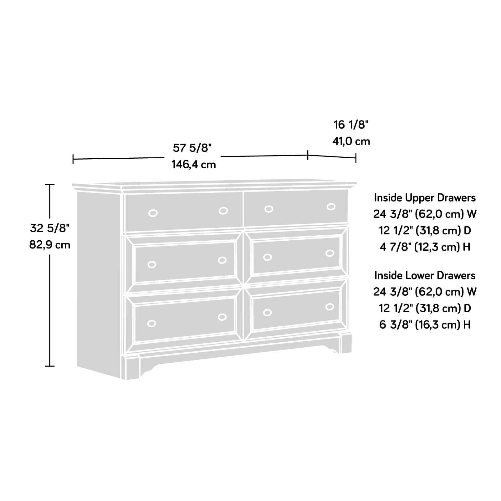 Assembled Dimensions: 57.64″ L x 16.14″ W x 32.64″ H Safety tested for stability to help reduce tip-over accidents Drawers with metal runners and safety stops keep you and your family safe Four lower drawers are extra deep for storage of bulky clothes Quick and easy assembly with patented T-slot drawer system This dresser complies with ASTM F2057-23 Standard Safety Specifications for Clothing Storage Units as required by the STURDY Act. Select Cherry finish Model #: 411830 Box Dimensions: 64.19″ L x 18.88″ W x 8.25″ H For additional questions or any issues, please contact the manufacturer at 1-800-523-3987. Be sure to check out the Sauder Palladia collection for more great items!