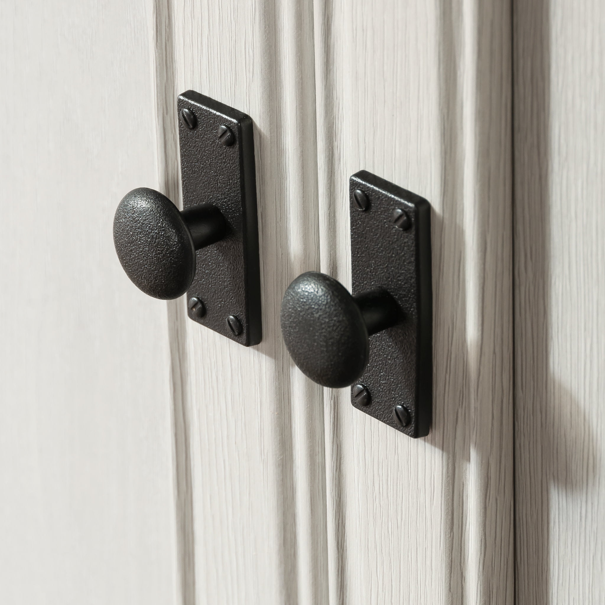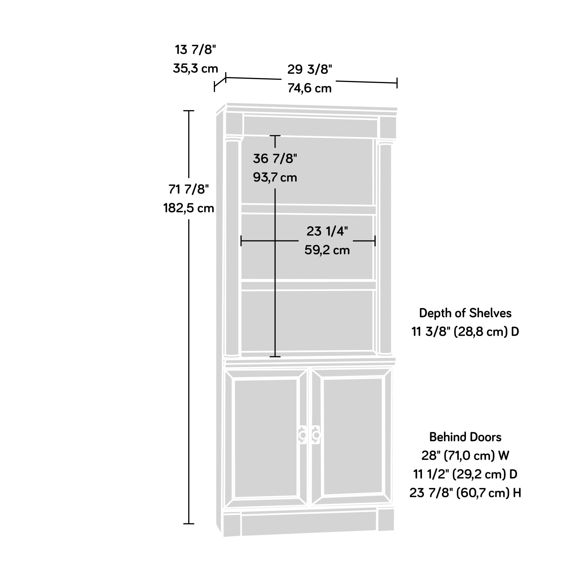 Assembled Dimensions: 29.37″ L x 13.9″ W x 71.85″ H Three adjustable shelves provide versatility Hidden storage behind doors hides clutter and chaos Enclosed back panel has cord access Quick and easy assembly with slide-on moldings Glacier Oak finish with Rosso Slate finish accent Model #: 432729 Box Dimensions: 75.5″ L x 15.37″ W x 5.13″ H For additional questions or any issues, please contact the manufacturer at 1-800-523-3987. Be sure to check out the Sauder Palladia collection for more great items!