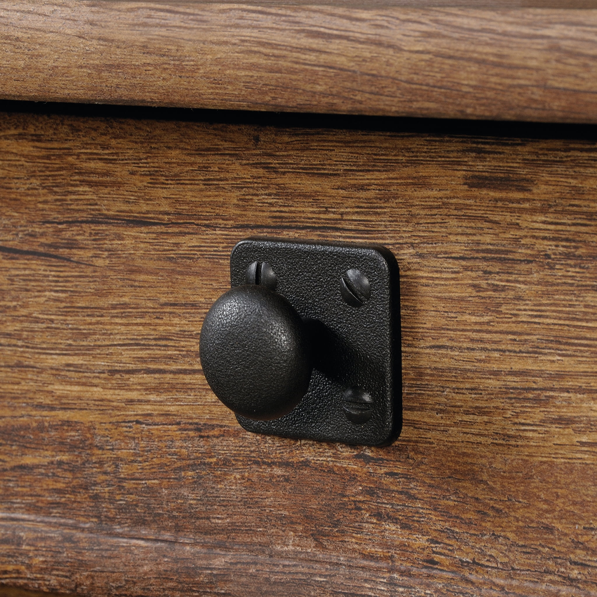 Working from home has never looked so good. Update your office or workspace with this computer desk from the Palladia collection. Find room for all your office supplies on its spacious tabletop surface – computer, notepads, stapler and much more. It features a large easy gliding drawer/shelf with a flip-down panel to house your keyboard and mouse. It features two additional storage drawers that open and close on smooth metal runners which are perfect for easy access storage of go-to office supplies like pens, scissors and paper. There is also a lower drawer with full extension slides that accommodates letter-size hanging files to help keep you organized to the max. Behind its framed door is a hidden storage area that contains an adjustable shelf and also holds a vertical CPU tower. Its handy hutch provides you with convenient storage space for all your miscellaneous office papers with its cubbyhole and vertical storage compartments. If that all isn’t enough, it also includes a cord management system to keep your wires neat and out of sight. Finished in a beautiful Vintage Oak and accented with black hardware, this computer desk will give your office a fresh new look.