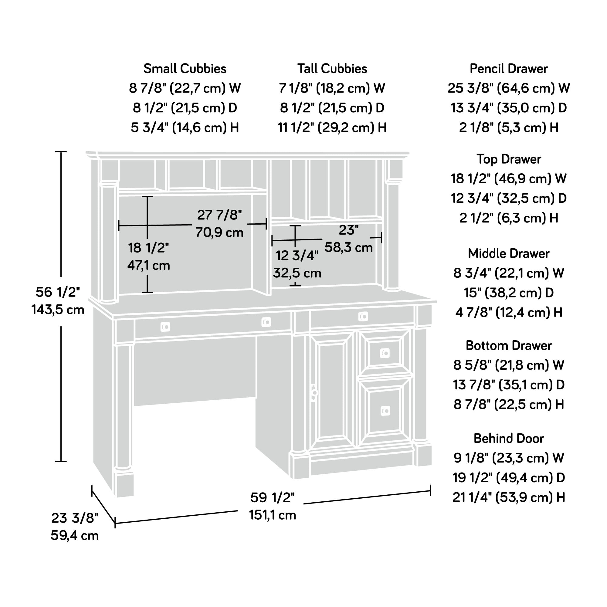 Assembled Dimensions: 59.49″ L x 23.54″ W x 56.50″ H Pedestal desk with hutch, large drawer/shelf with metal runners and safety stops featuring flip-down panel for keyboard/mouse Two additional drawers with metal runners and safety stops Lower drawer with full extension slides holds letter-size hanging files Storage area behind door holds vertical CPU tower and has an adjustable shelf Hutch has cubbyhole storage and vertical storage compartments for miscellaneous items Enclosed back cut-outs allow a convenient path for cables and cords Vintage Oak finish Model #: 418072 Box Dimensions: 59.5″ L x 20.0″ W x 4.06″ H For additional questions or any issues, please contact the manufacturer at 1-800-523-3987. Be sure to check out the Sauder Cottage Road collection for more great items!