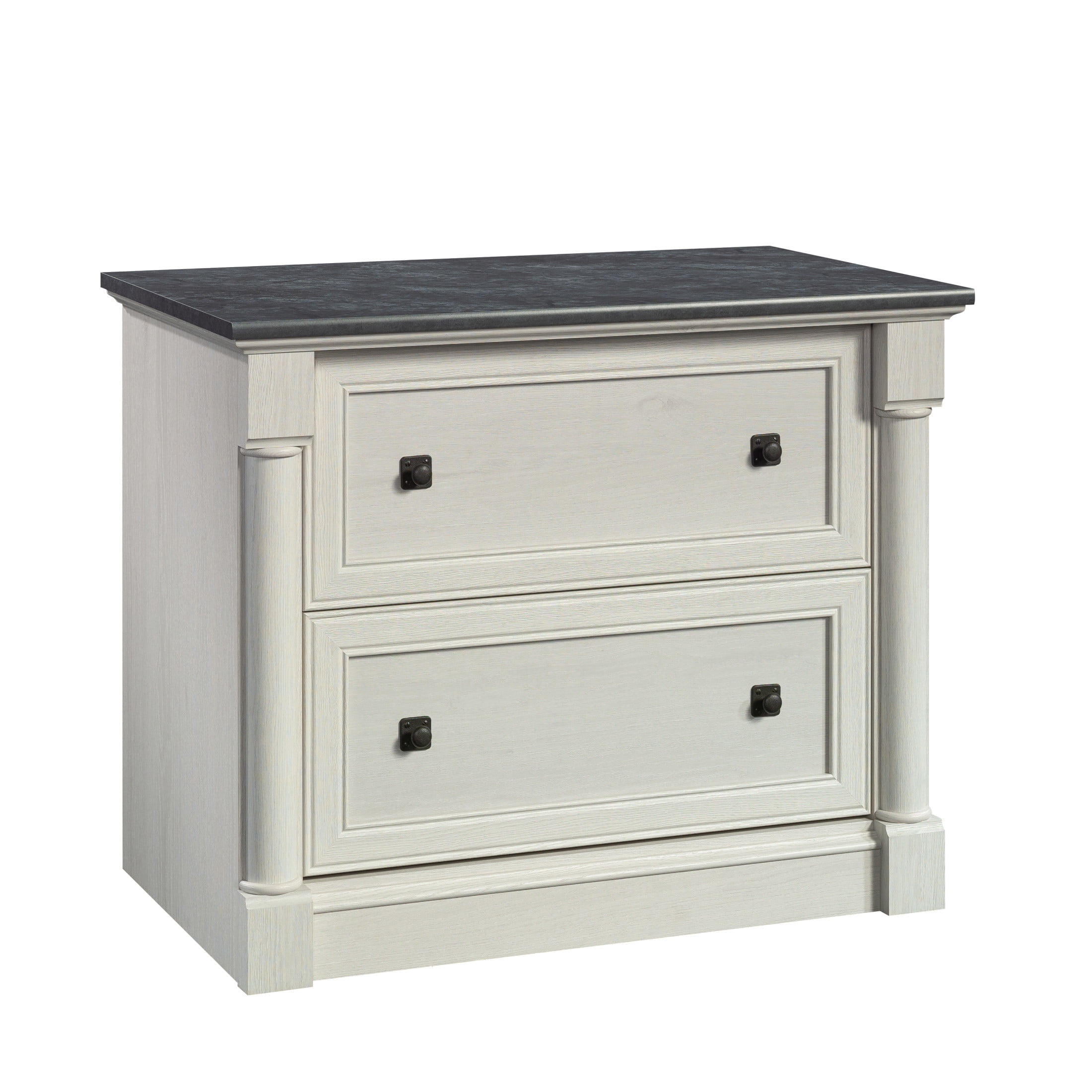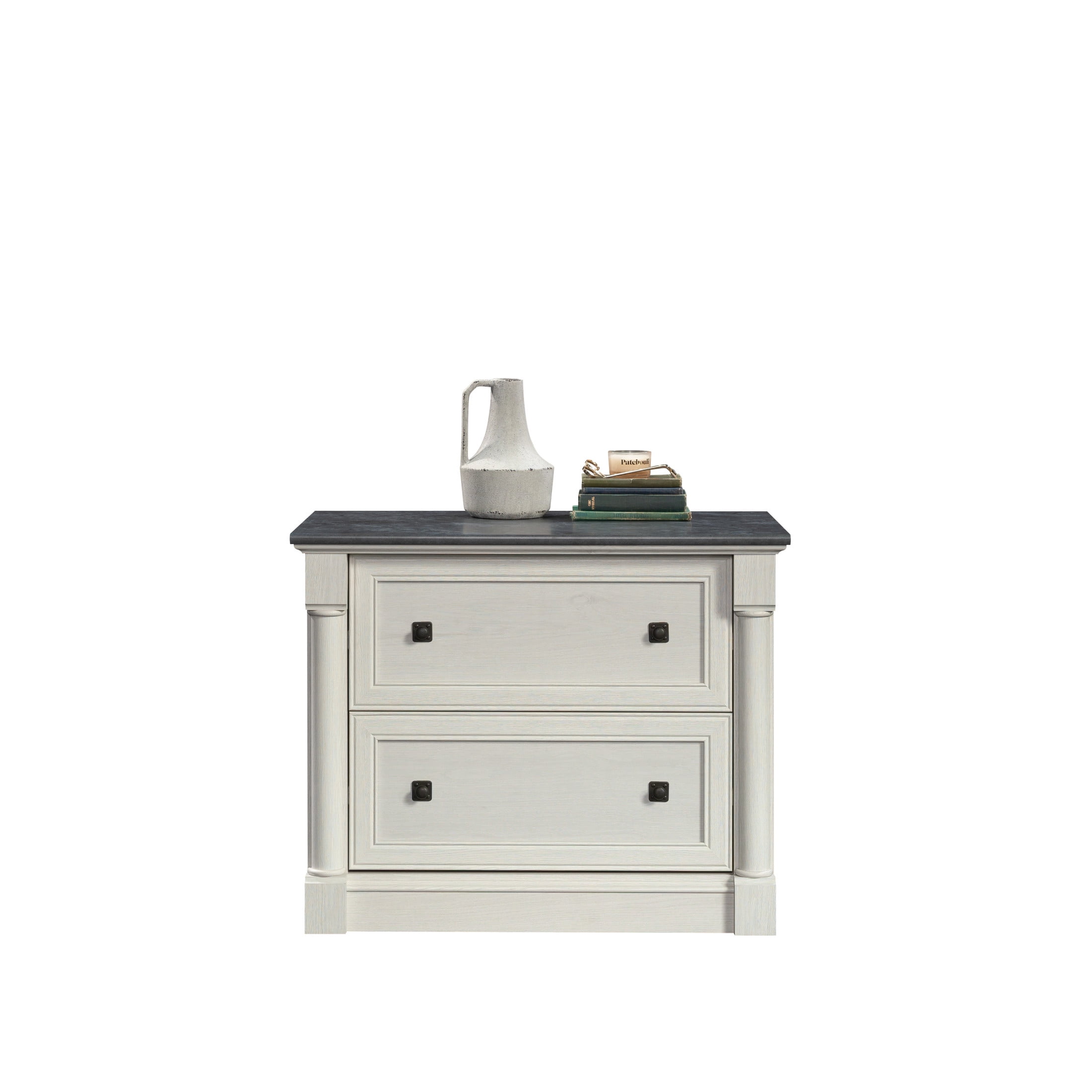 The ornate details and light finish of this lateral file from the Palladia collection will have you storing your files in style. This lateral filing cabinet features two large drawers with full extension slides to hold letter, legal, or European size hanging files. There are options for all your filing needs! This 2-drawer lateral file cabinet also features an interlocking safety mechanism that allows only one drawer to open at a time for extra safety precautions. This wood lateral file cabinet offers a spacious top surface that provides you with space for office supplies and home décor items like a printer, decorative plants, a lamp, and photos of your family. This legal size file cabinet will look good no matter where it stands, in your office or in the living room. Finished in Glacier Oak with a contrasting dark Rosso Slate finish accent, this stunning 2-drawer filing cabinet will have you feeling organized in no time.
