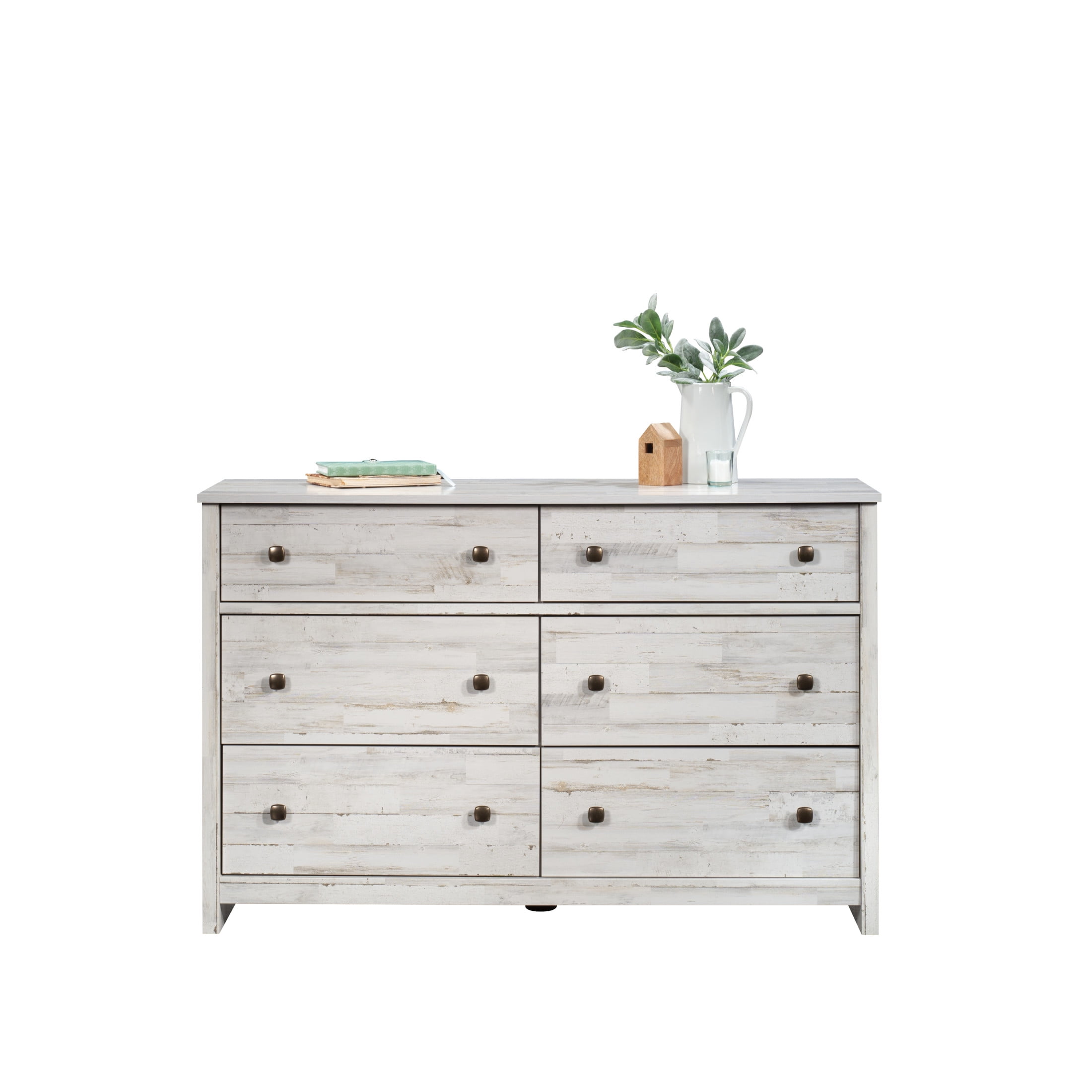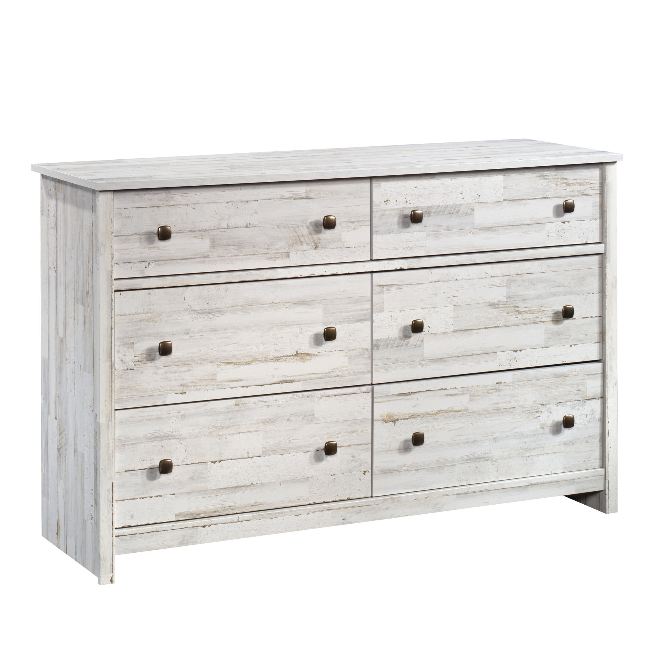 Add stunning style and versatile storage with this dresser from the River Ranch collection. This 6-drawer dresser features drawers with metal runners and safety stops for ease of use. The four lower drawers of this rustic dresser are extra deep, designed to store denim, sweaters, linens, and more. This dresser with drawers is ideal for all of your favorite pairs of socks, light jackets, or t-shirts. Safety is always on our minds, thats why this double dresser comes with a tip restraint safety strap. Assembly of this bedroom dresser is quick and easy with a T-slot drawer system and slide-on moldings, so you can spend less time assembling and more time storing. Whether you need additional storage for the master bedroom, guest room, or even a spare room, this dresser accommodates any decor you have. Finished in a White Plank, this 6-drawer dresser is exactly what youve been looking for. We hope you like what you see. Our designers travel the world and bring back the best and latest in style, finish, and color trends. This inspiring world travel is evident in the cutting edge and innovative furniture solutions we offer to you! Other affordable furnishings from the collection (sold separately) are available to complete the look. For assistance after the purchase, you can to reach out to our award-winning and friendly Midwest based customer service. They are ready to help you every step of the way with any questions you might have about the product. Please contact us at 1-800-523-3987.