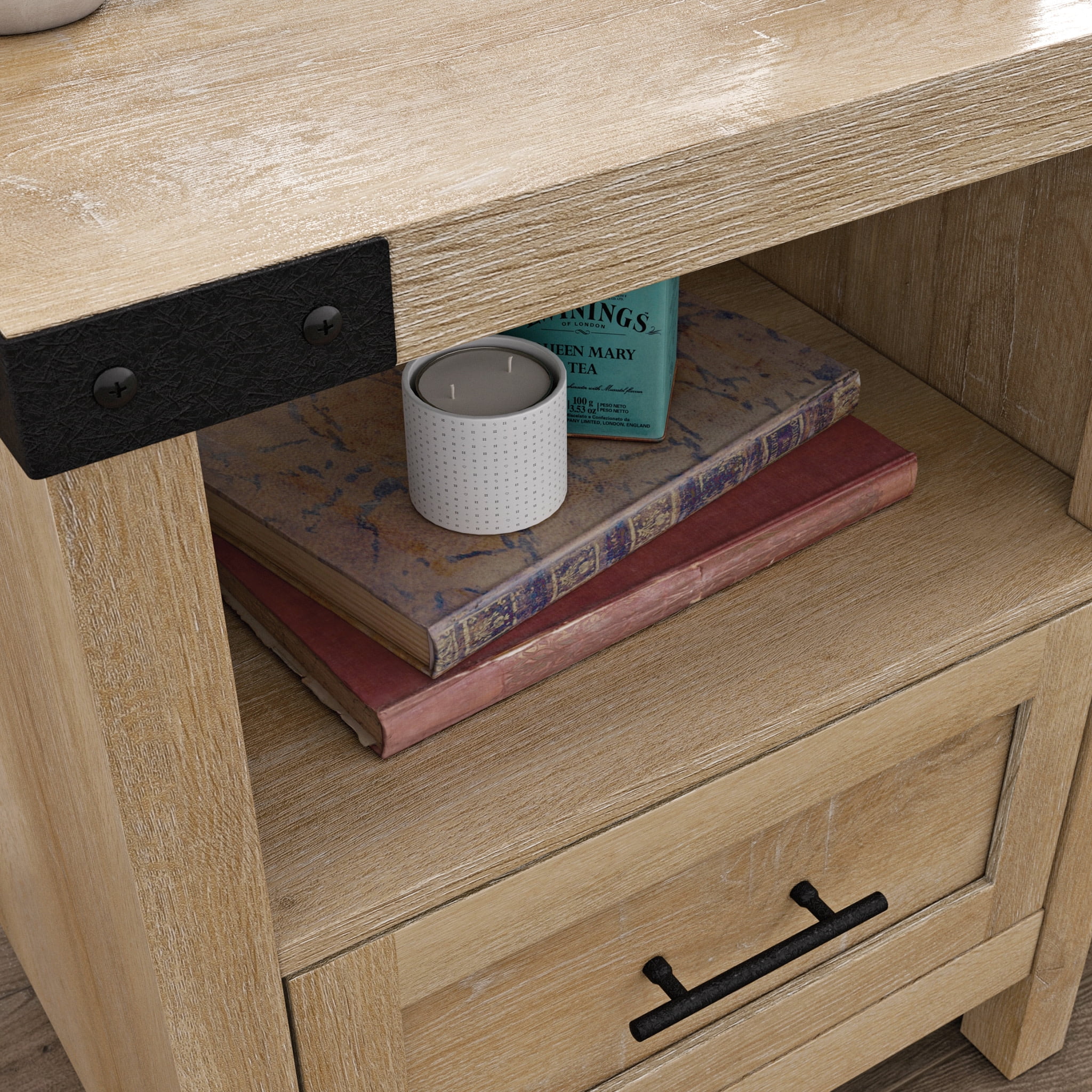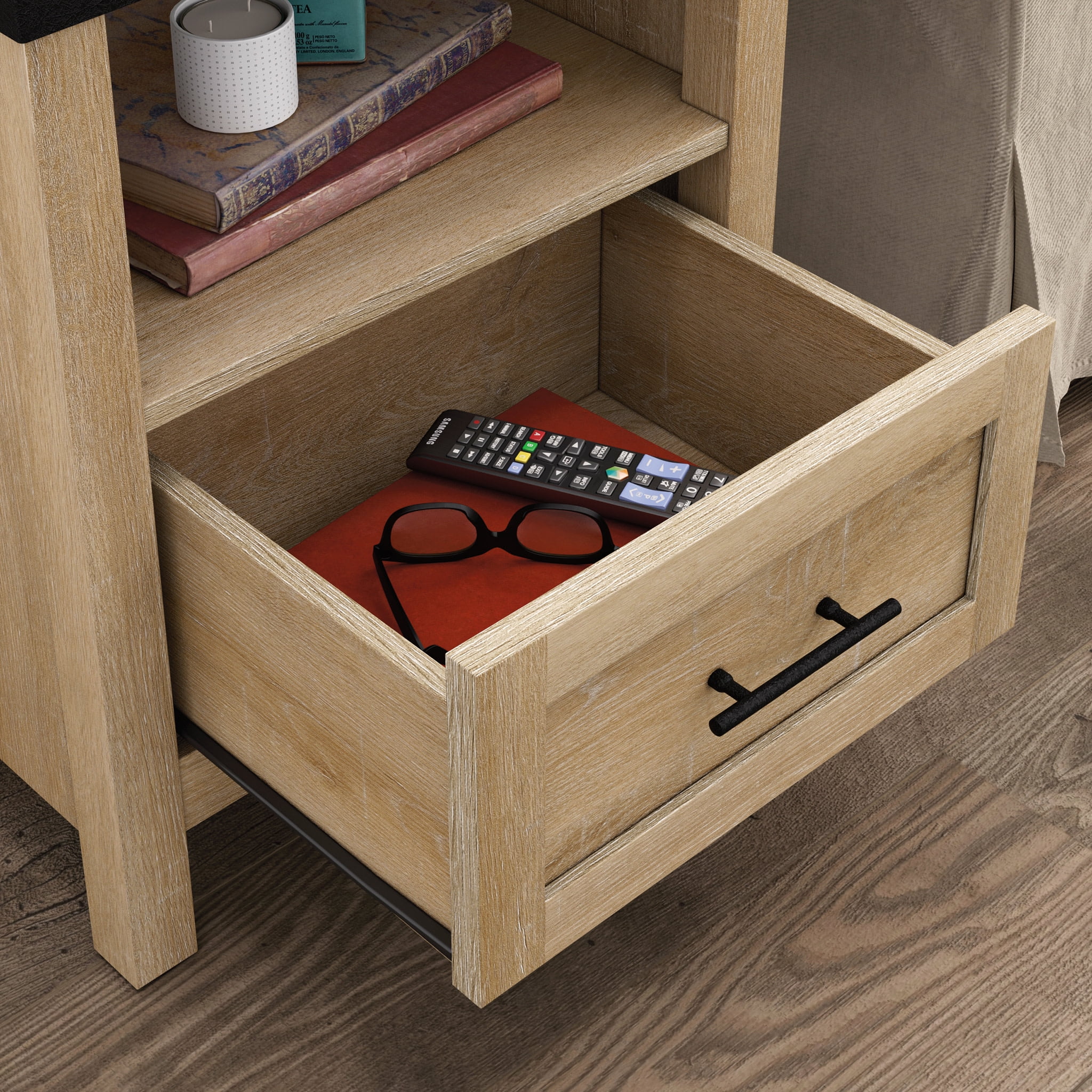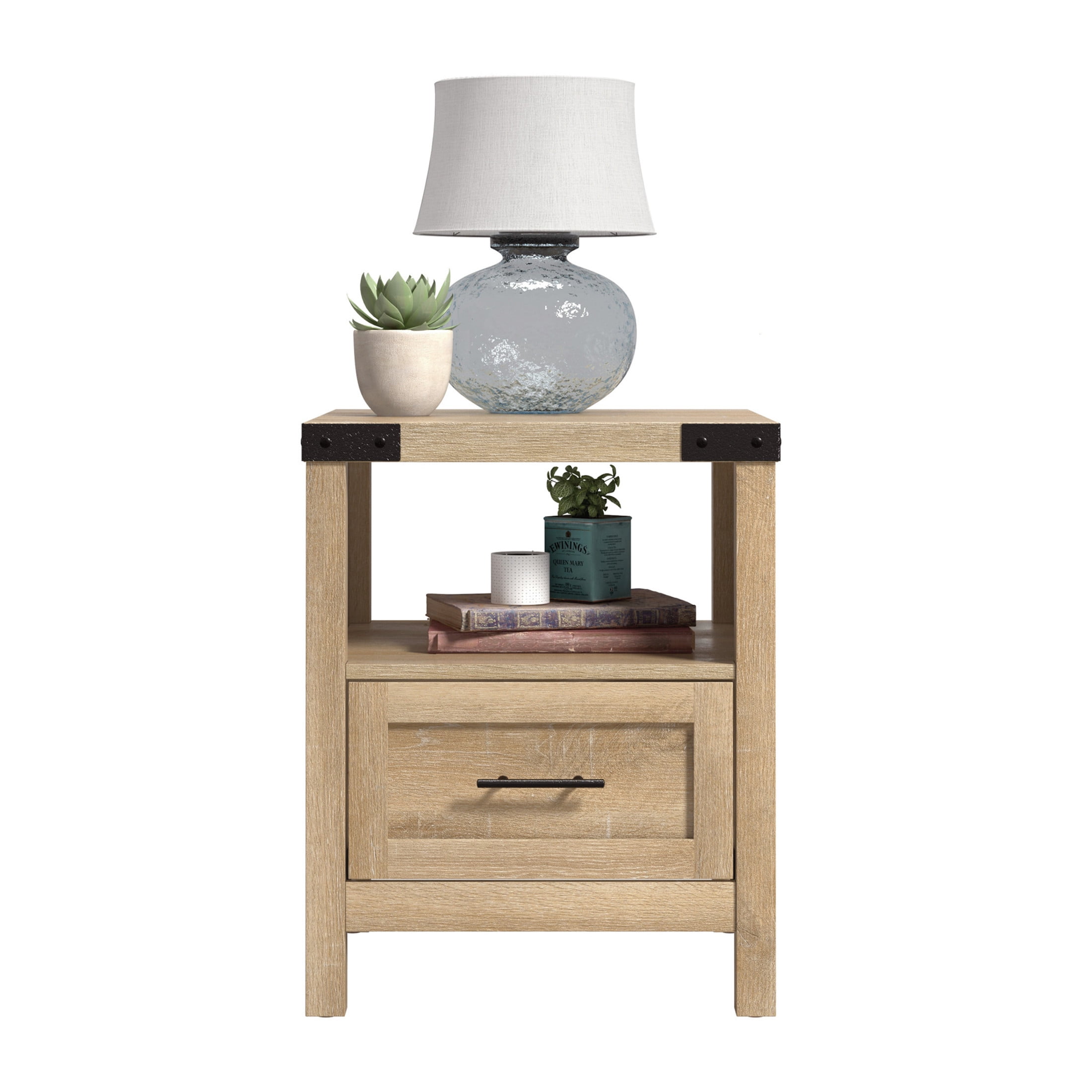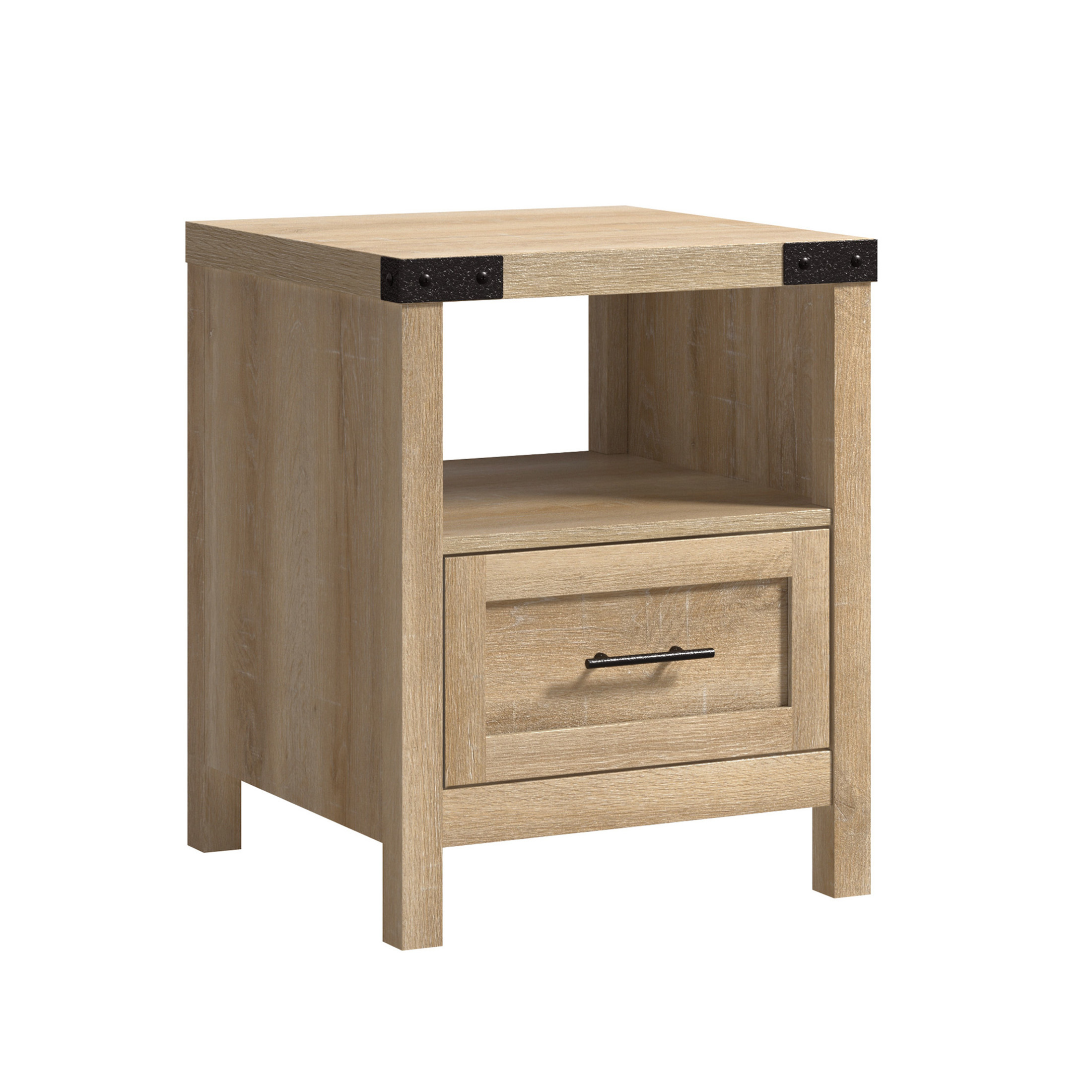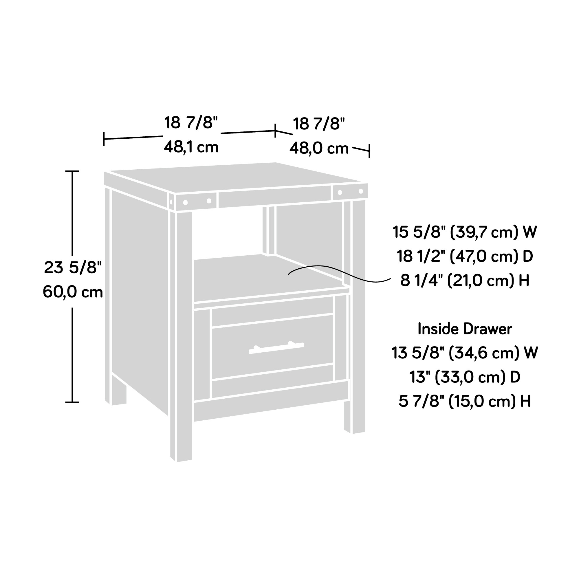 Assembled Dimensions: 18.94″ L x 18.9″ W x 23.62″ H Durable, 1 1/2″ thick top to display items like home dcor, or a lamp Drawer features metal runners and safety stops for added ease Open shelf for additional storage of remotes, organizing bins, and more Finished on all sides for versatile placement in any room of your home Finished in Orchard Oak Model #: 429489 Box Dimensions: 27.17″ L x 22.64″ W x 5.91″ H For additional questions or any issues, please contact the manufacturer at 1-800-523-3987. Be sure to check out the Sauder Saddler Way collection for more great items!