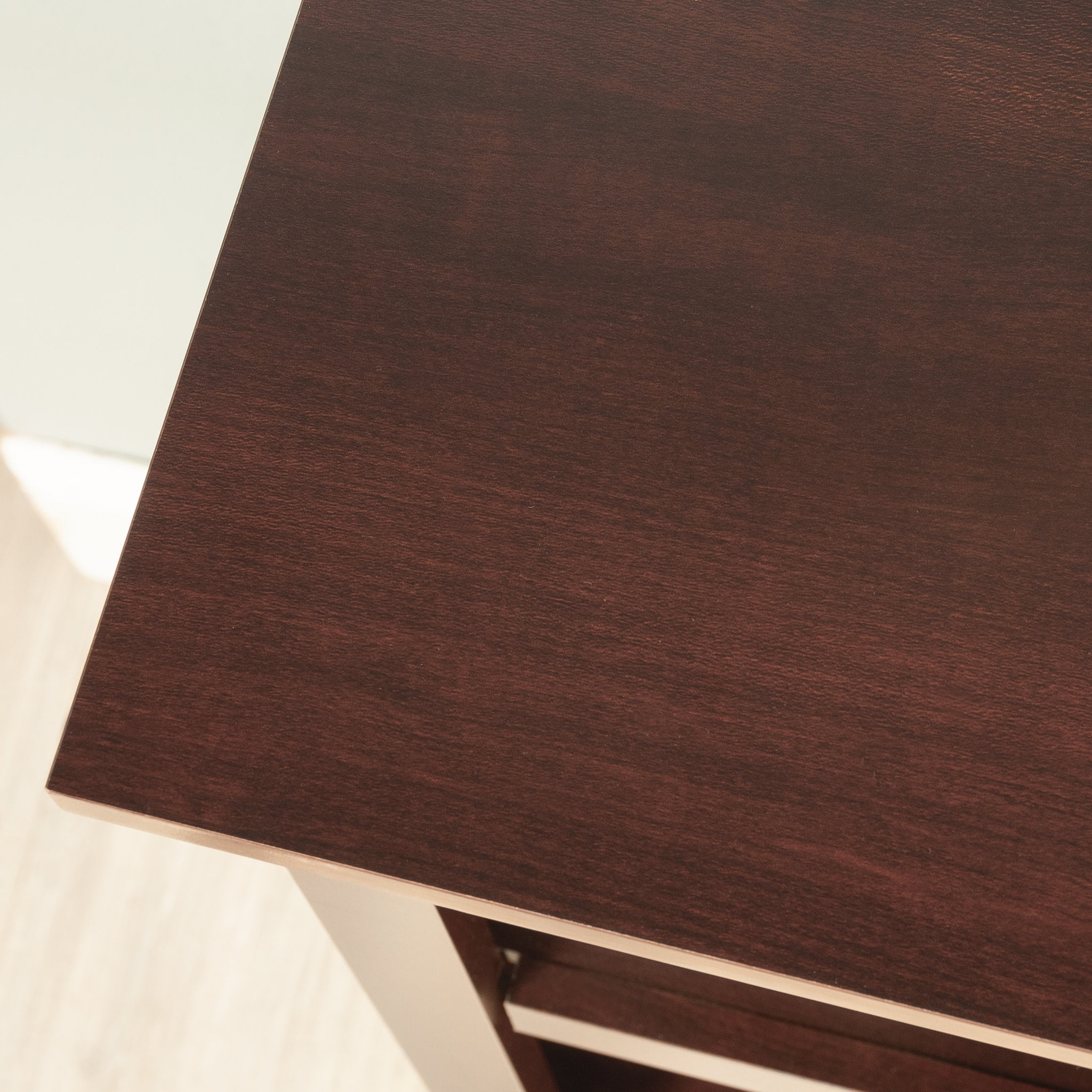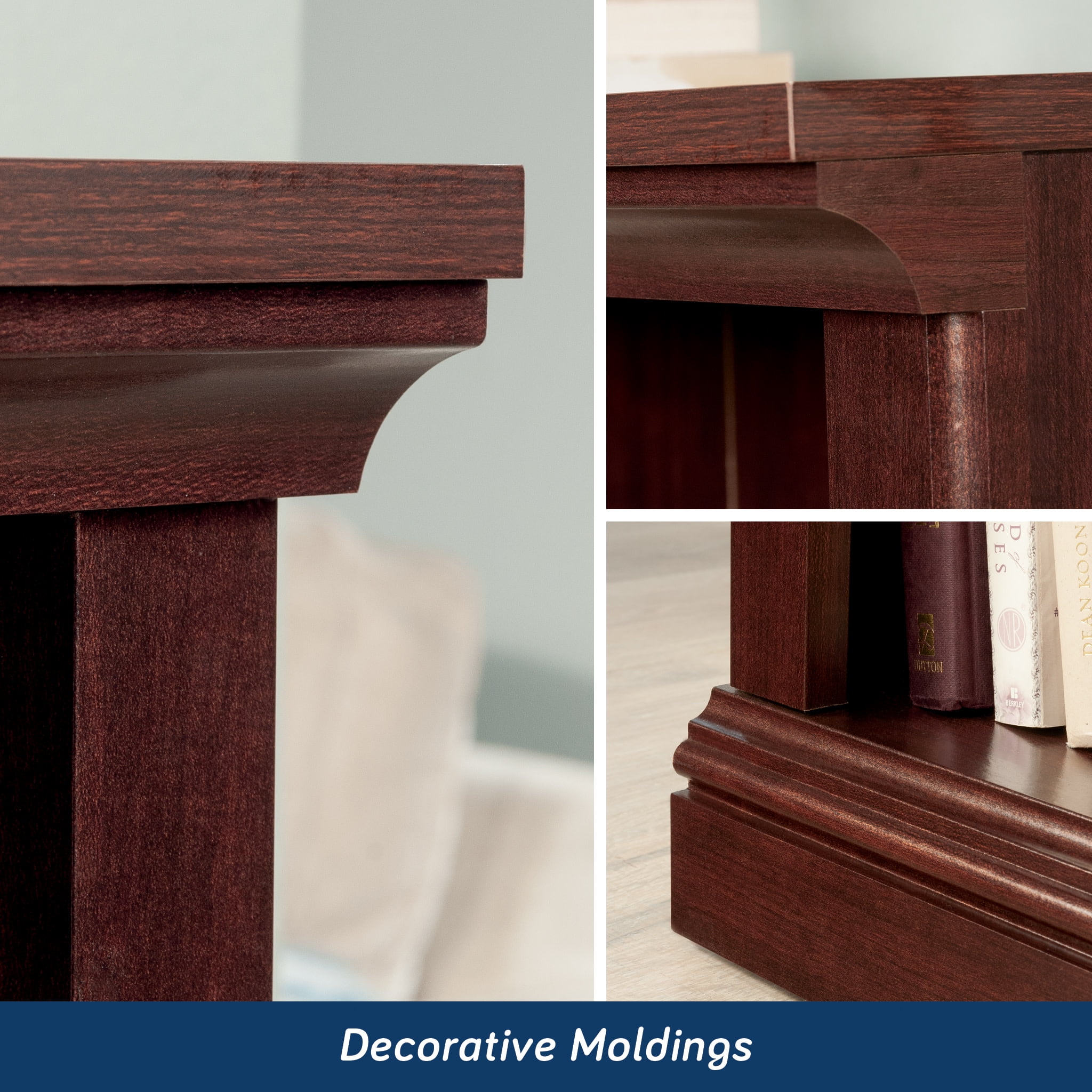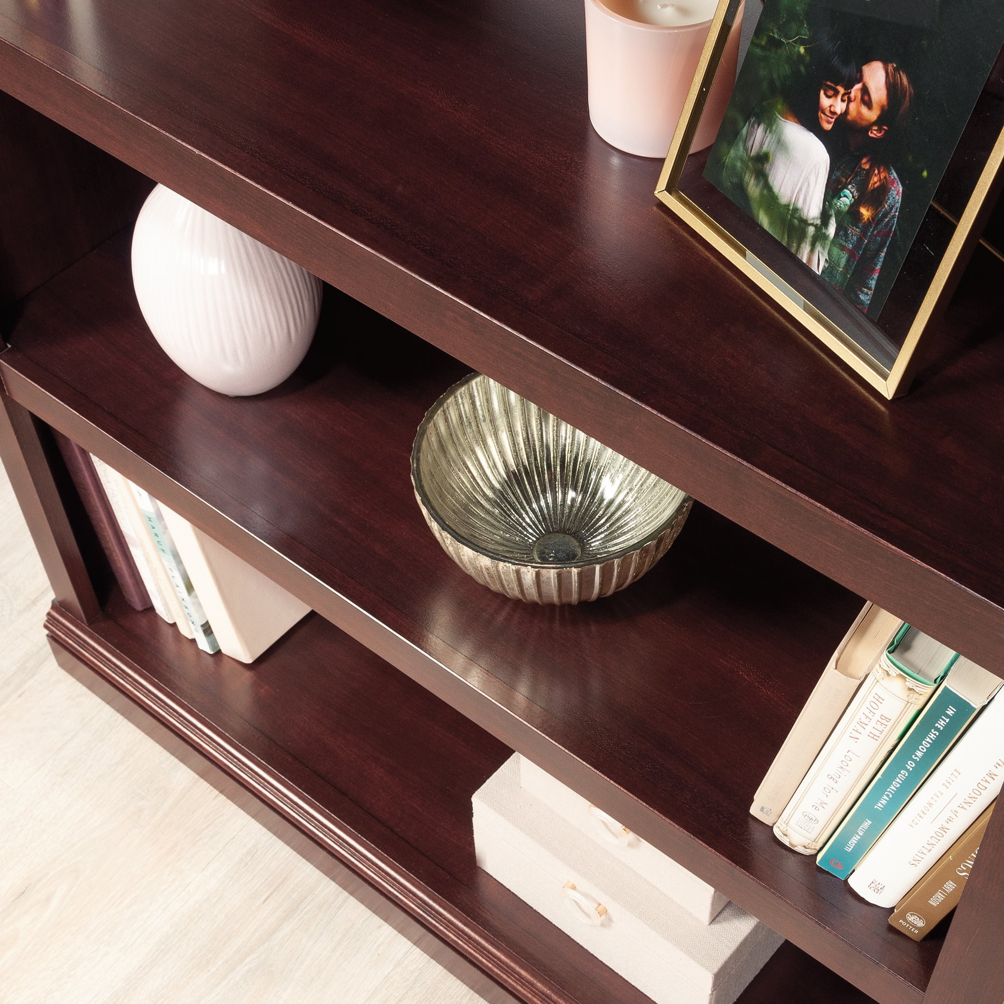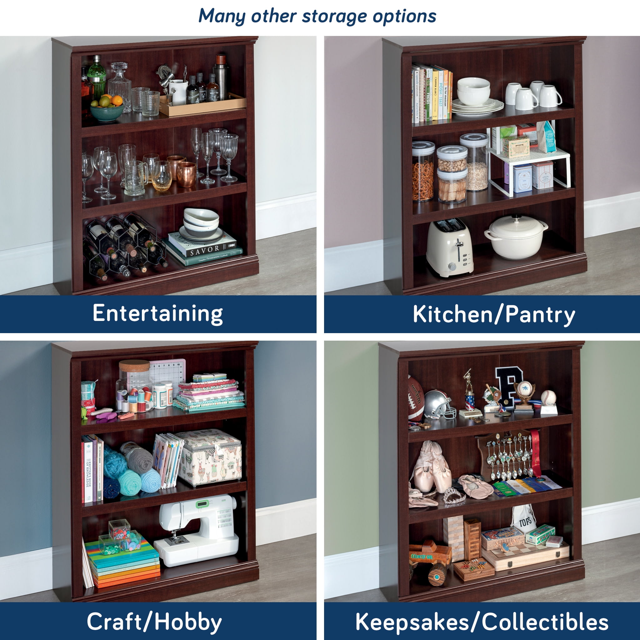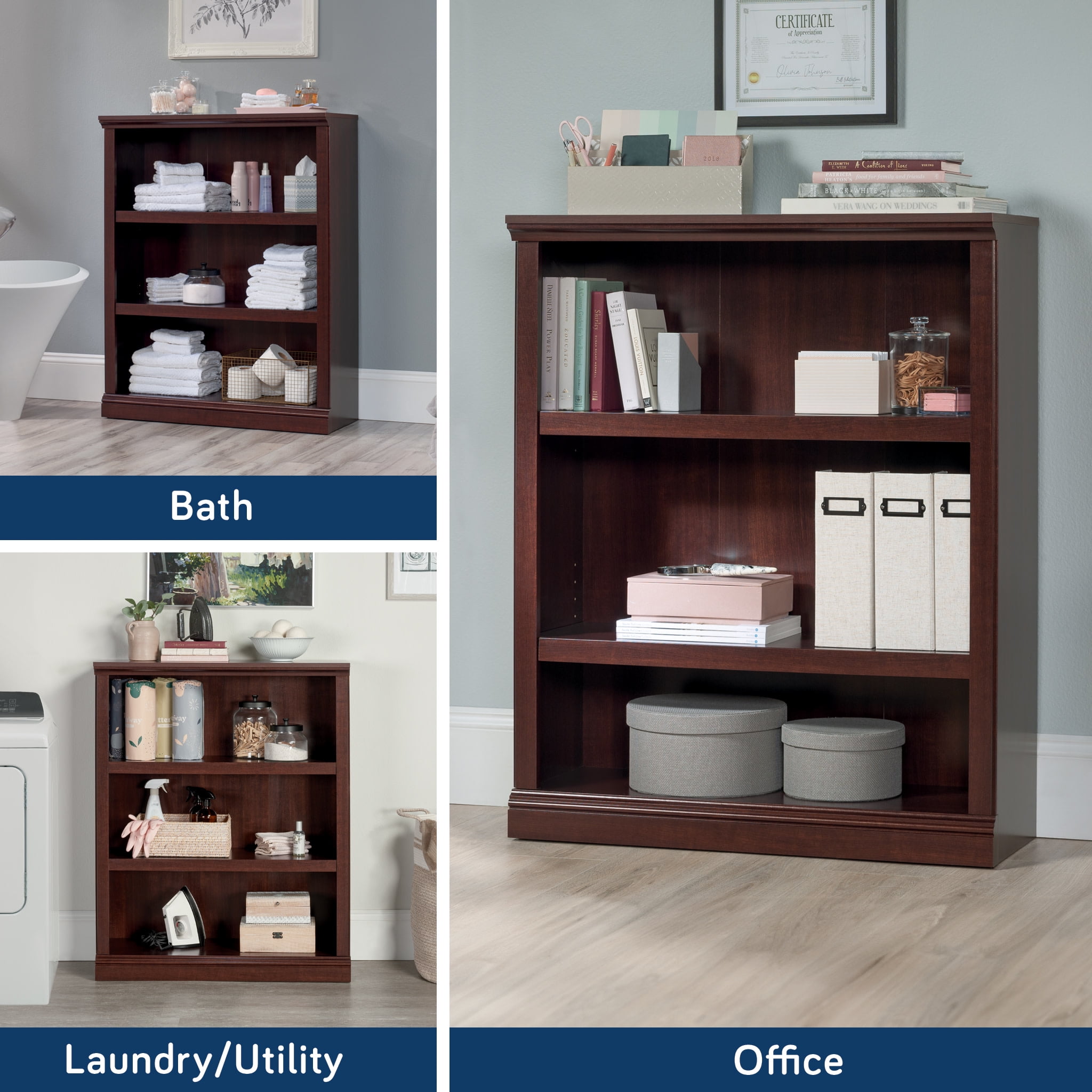 This 3-shelf bookcase from the Sauder Select collection, finished in Select Cherry is the ultimate home organization tool. This stylish display bookcase can be used for entertaining, as the ideal place to display bottles and glasses of all shapes and sizes. Featuring three spacious shelves, this short bookcase has room for a variety of home office supplies, from file boxes to binders. The large shelves make a great place to store and display kitchen pantry items like cereal boxes or dishes. This living room bookcase has two adjustable shelves for flexible storage and display of family keepsakes and collectibles. Use this engineered wood bookcase in the bathroom to store cosmetics, linens, or baskets of toiletries. It could be the perfect vertical storage unit for arranging art supplies in a craft room or keeping laundry soaps and fabric softeners organized in the utility room. Stack it, store it, or style this versatile storage solution.