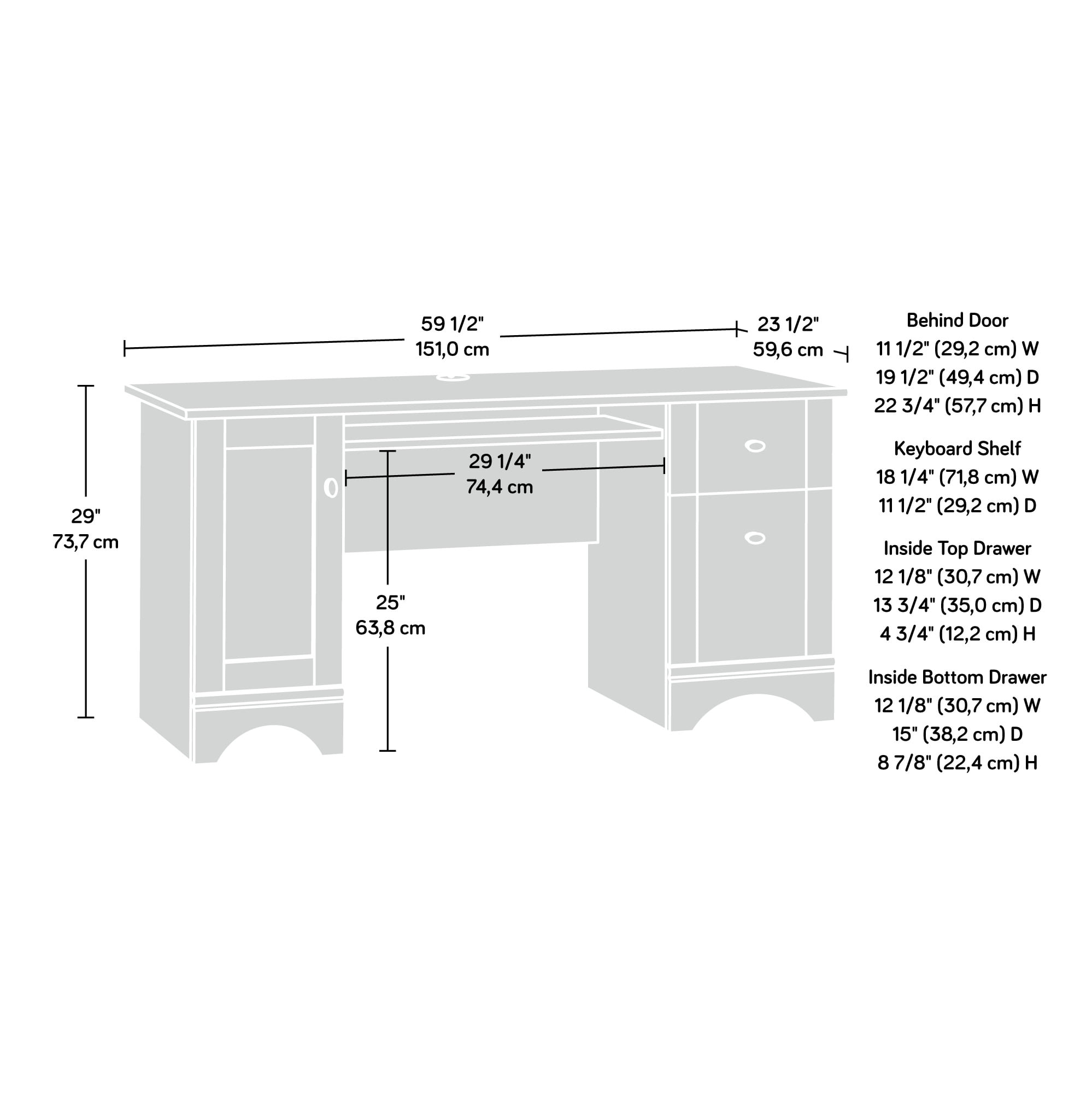Assembled Dimensions: 59.45″ L x 23.47″ W x 29.02″ H Slide-out keyboard/mouse shelf with metal runners and safety stops Storage area behind door holds vertical CPU tower and has an adjustable shelf Two drawers with metal runners and safety stops; file drawer holds letter or European size hanging files Desk top grommet hole for electrical cord access Quick and easy assembly with patented T-slot drawer assembly Brushed Maple finish Model #: 402375 Box Dimensions: 63.94″ L x 25.06″ W x 5.19″ H For additional questions or any issues, please contact the manufacturer at 1-800-523-3987. Be sure to check out the Sauder Miscellaneous Office collection for more great items!