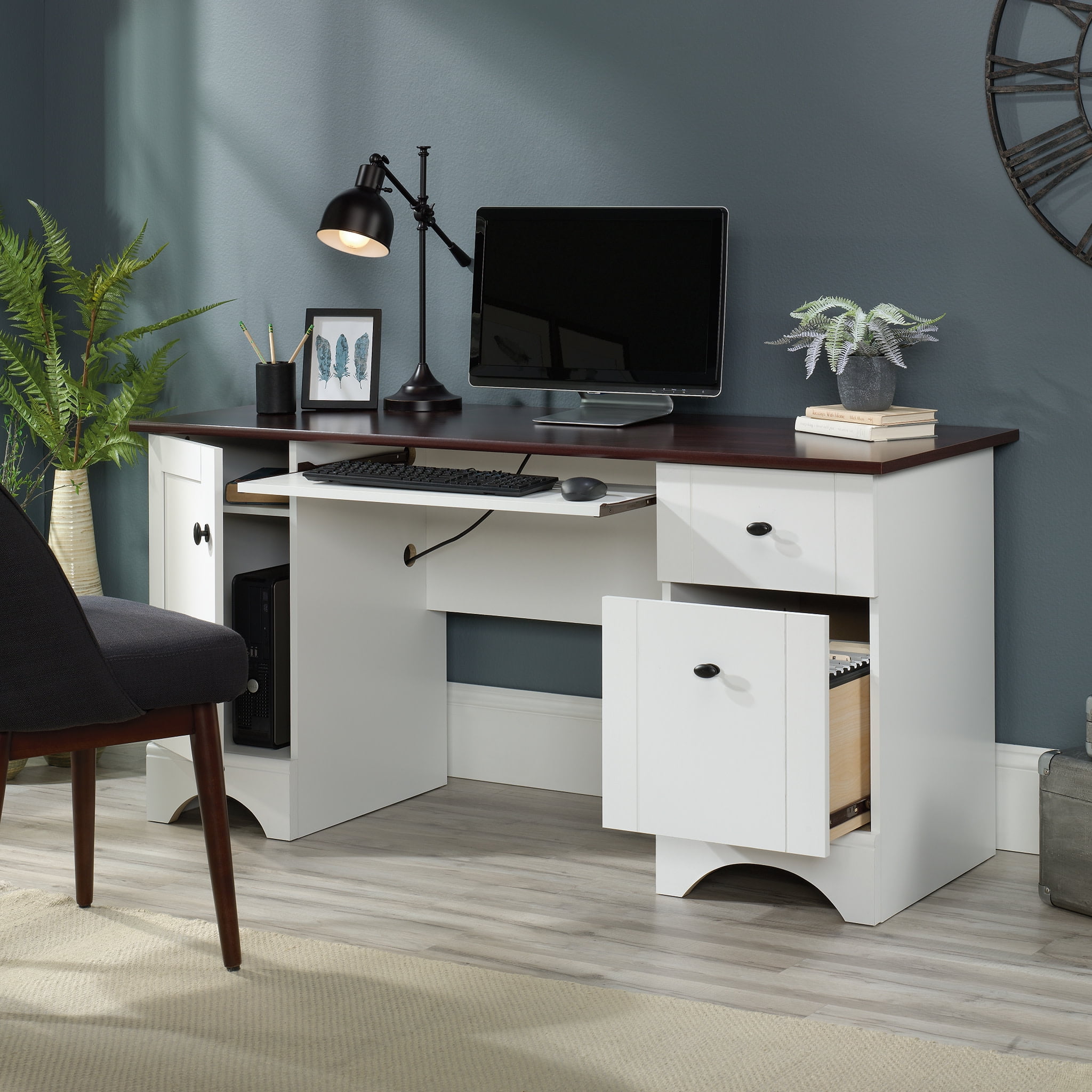 There’s no fooling around here—this computer desk from the Sauder Select collection means business. This home office desk is equipped with a slide-out keyboard/mouse shelf with metal runners and safety stops that keep your work from home ergonomics tip top while preserving your top surface space. The top surface is big enough for all your home office essentials: a computer, an accent lamp, and photos of your family. This computer desk with drawers features a storage area behind the door that holds a vertical CPU tower and includes an adjustable shelf to customize to your liking. This computer desk with storage features two drawers with metal runners and safety stops for ease of use. The lower drawer functions as a file drawer, holding letter or European size hanging files. This home office desk includes a desk top grommet hole for electrical cord access—because we all hate that cord clutter. A patented T-slot drawer system makes assembly a little quicker and easier too. Finished in a crisp Soft White with a beautifully accented Select Cherry top, this wood home office desk is the perfect addition to your home office: whatever that may look like.