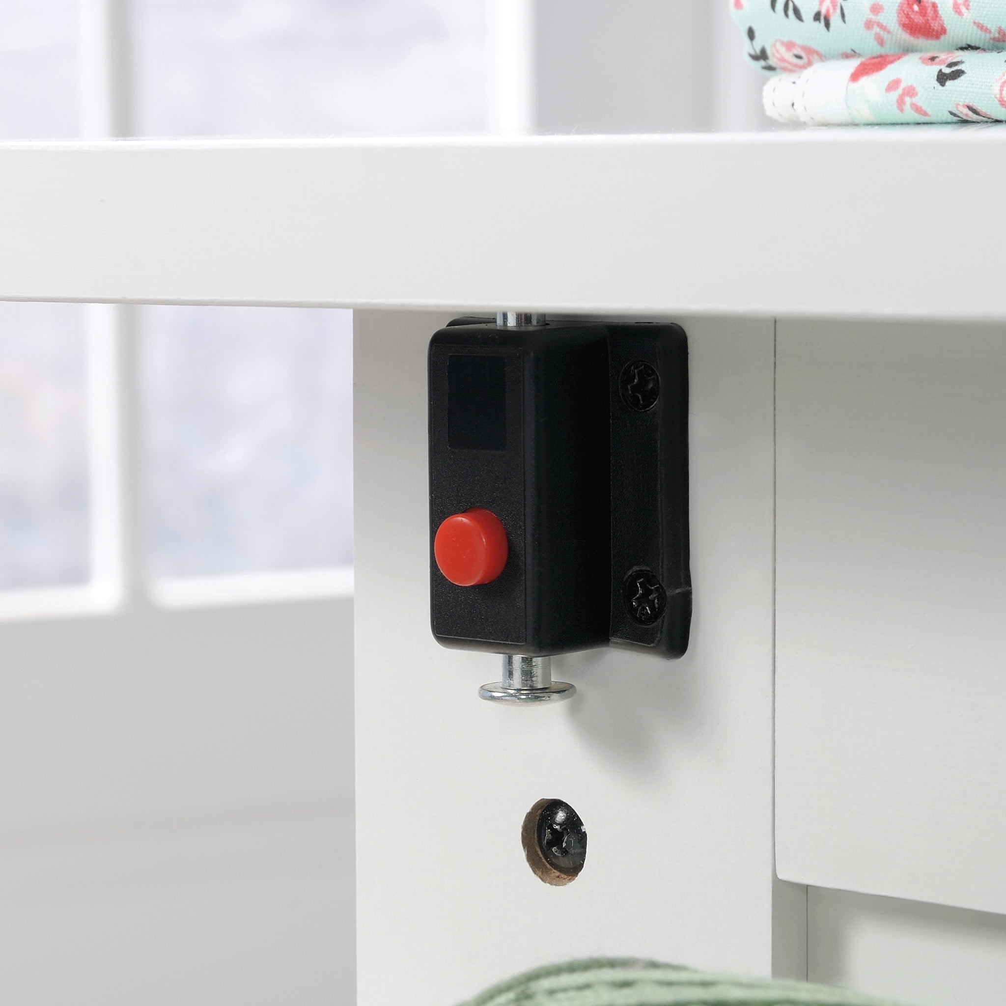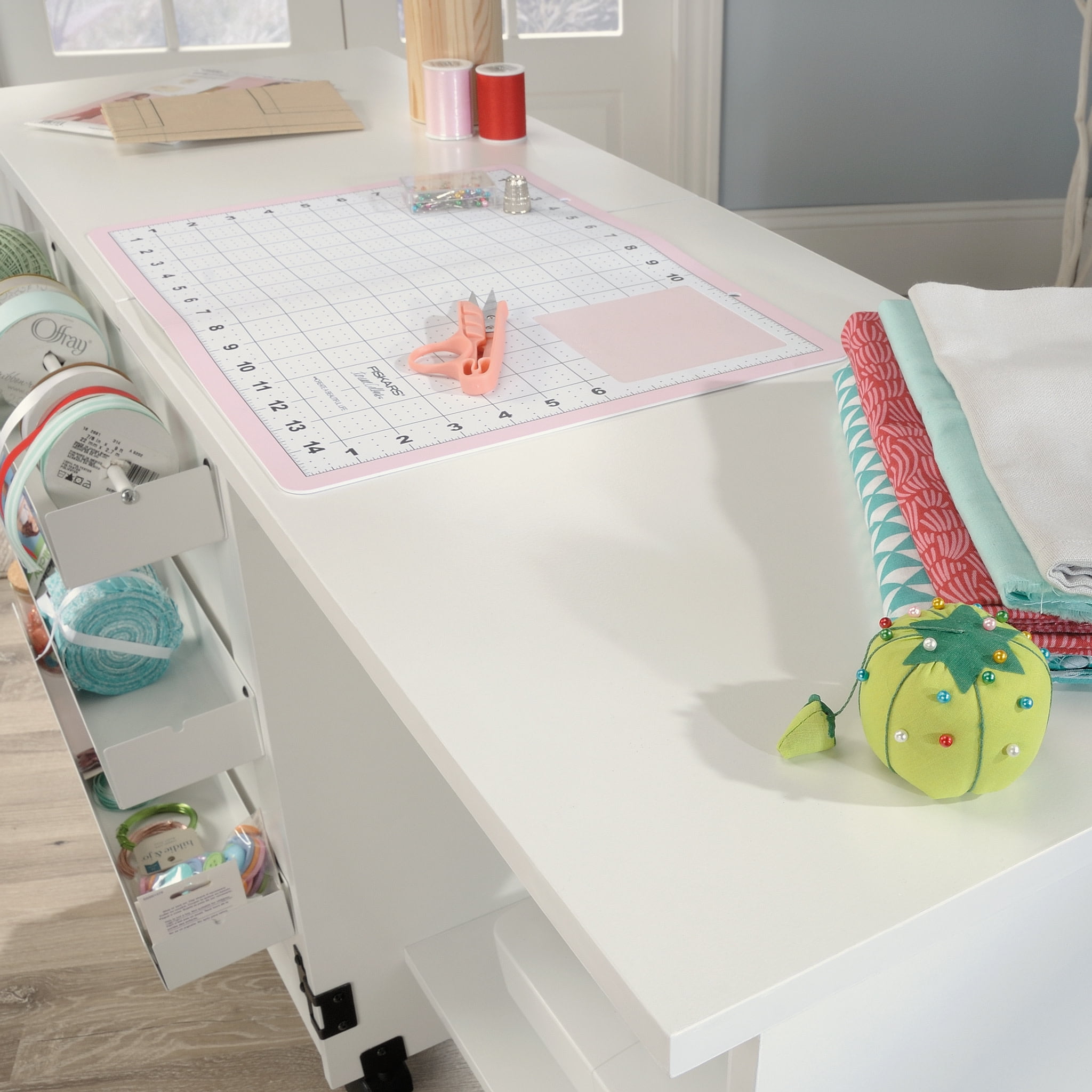 Update your craft area with this multifunctional and adaptive sewing cart. This craft storage cart features a drop leaf that provides extra work space for sewing, crafts with the family, scrapbooking and any other hobby you dare to try. This rolling craft cart includes three storage trays behind the roll-open door for spools of yarn and thread, scissors, tape, and more. This sewing and craft cart also includes a dedicated hidden shelf for a sewing machine, so your top surface can remain clutter free while keeping your sewing machine close by. Sewing storage furniture should be mobile who knows where the crafting will take you! This cart features easy-roll casters for simple rearranging in your home: From the spare room, to the basement, to the guest room. With a clean White finish, this sewing cart is the upgrade that your hobby and crafting ambitions need.