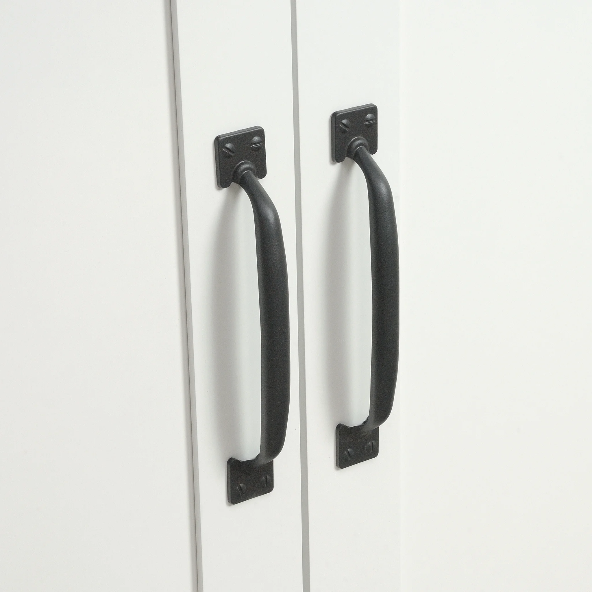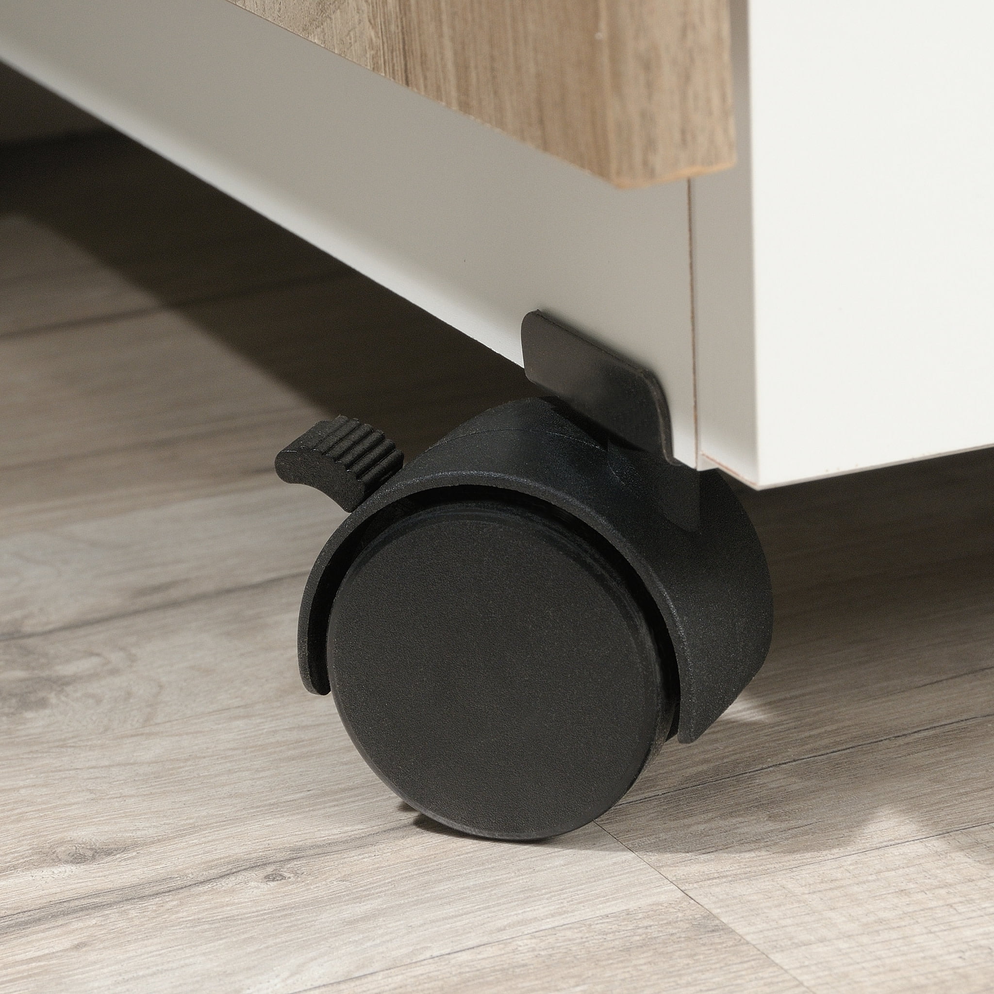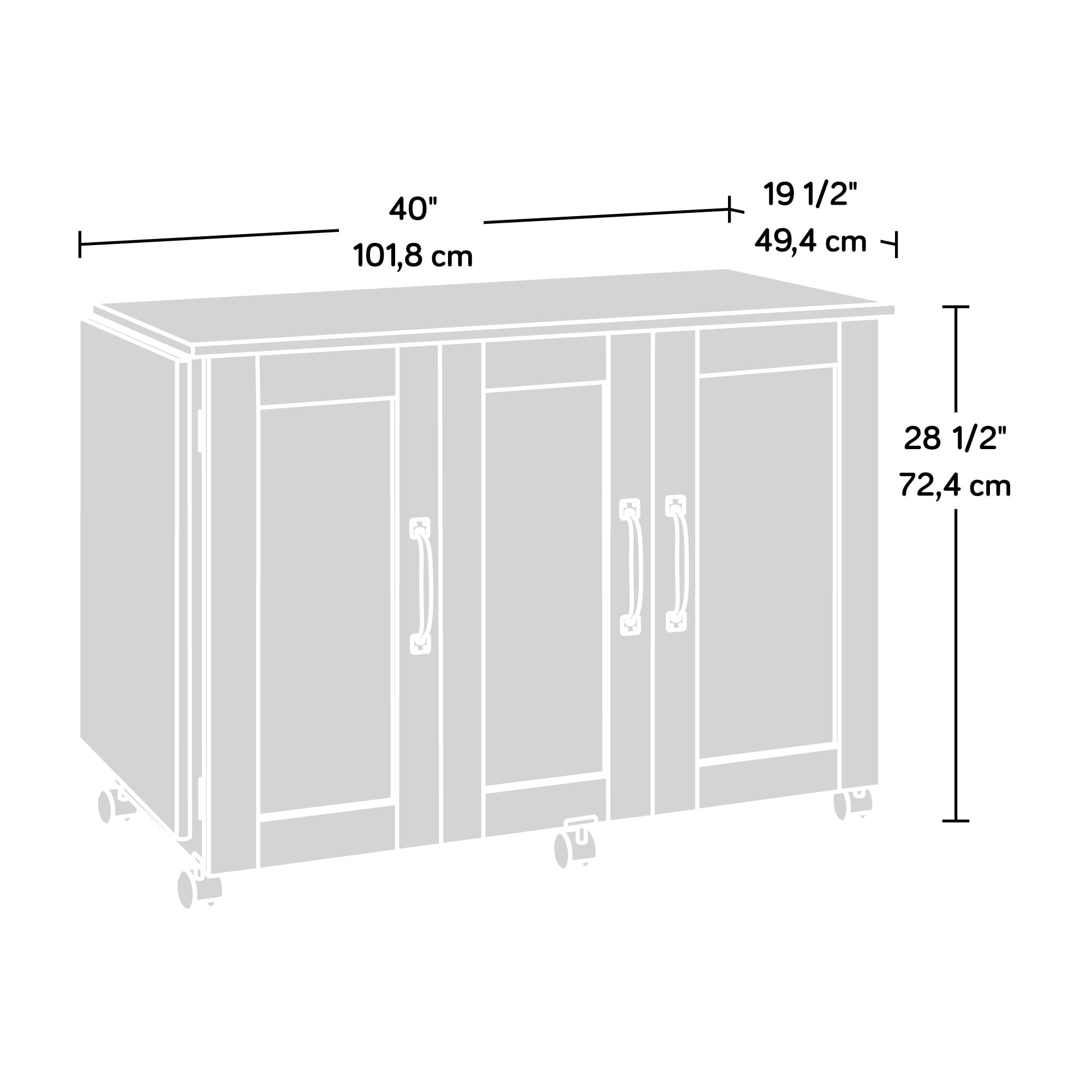 Let your crafting heart go wild! Create the perfect space in your home for all your sewing and crafting needs with this sewing and craft table from the Sauder Select collection. This rolling sewing table offers a spacious top surface that provides you with the room you need for all your supplies like your sewing machine, scrapbooks, spools of thread and organizing bins. Need additional work space? We got you covered. The drop leaf table top provides you with the extra space you need for sewing and crafting. This sewing table with storage features easy access storage behind its roll-open doors that includes two storage bins and a hidden shelf for your sewing machine. Behind the door it also features two adjustable shelves that can move to different heights to create flexible storage for items of all shapes and sizes. This rolling sewing table includes easy-roll casters so it can easily move to wherever your projects take you. Finished in Soft White with Lintel Oak accents, this handy sewing craft table will have you feeling ready to work.