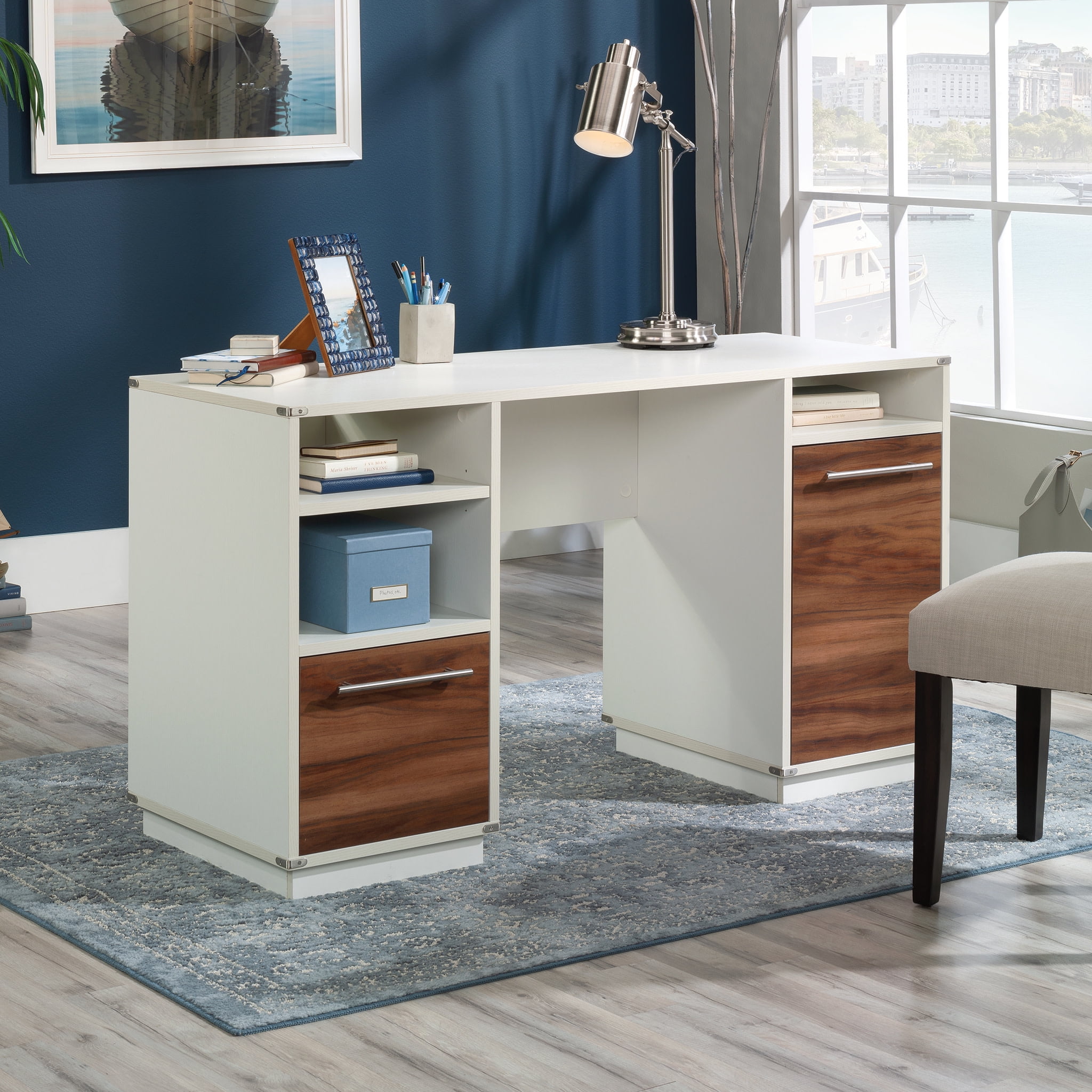 Taking care of business. This computer desk from the Shoal Creek collection provides you with all you need to tackle any at-home project. With a spacious workspace for all your office essentials, this home office desk top surface can hold your laptop, an accent lamp, photos of your family, and more. This writing desk includes a flip-down panel with a slide-out keyboard/mouse shelf for optimal top surface space. A small drawer that opens and closes on smooth metal runners and has a T-lock assembly system is perfect for storing pens, pencils, a stapler, sticky notes, and more. Finished in a sleek Soft White, this computer desk with drawer will make you want to work from home. We hope you like what you see. Sauder designers travel the world and bring back the best and latest in style, finish, and color trends. This inspiring world travel is evident in the cutting edge and innovative furniture solutions we offer to you!