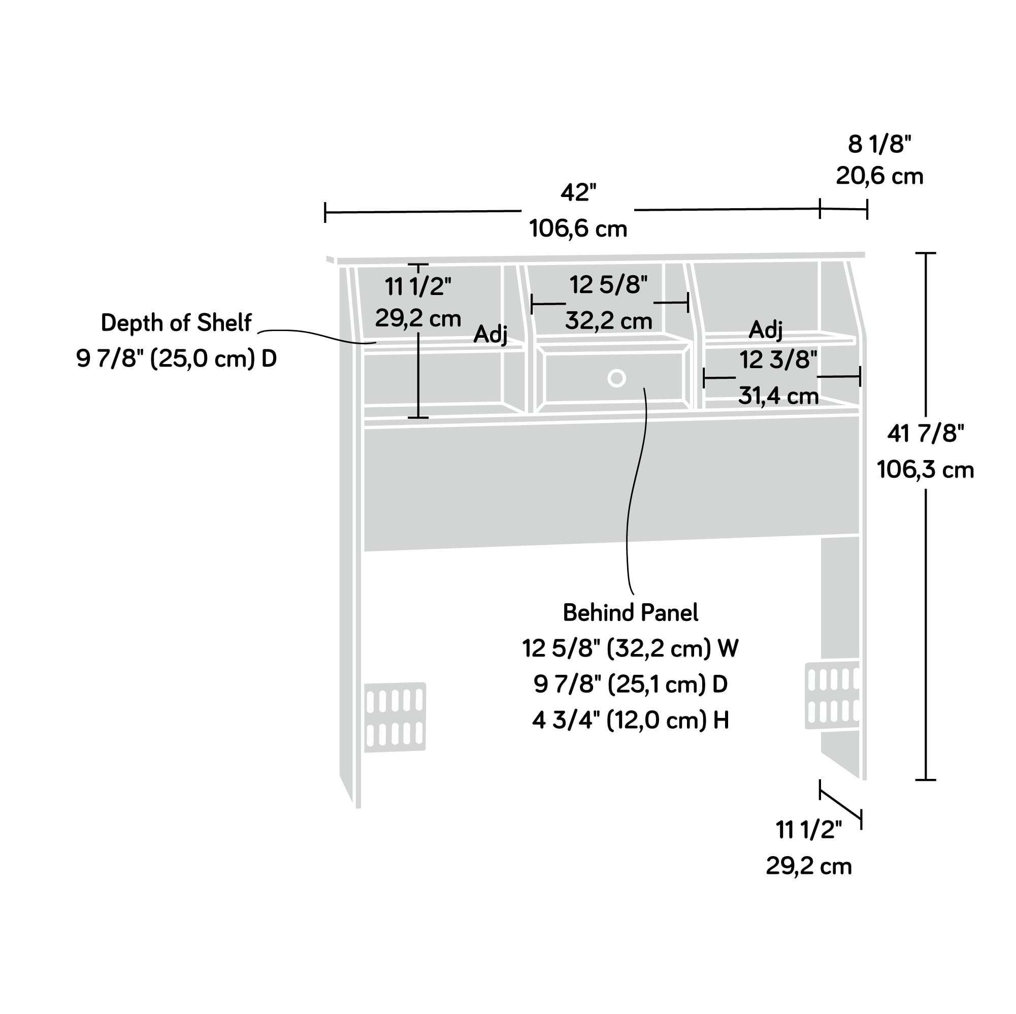 Assembled Dimensions: L: 41.97″ x W: 11.50″ x H: 41.85″ Attaches to a twin size bed frame for stability Spacious display area for alarm clock and books& features two adjustable shelves for flexible storage options Hidden storage behind flip-up drawer front because everyone needs a place to hide their clutter and chaos Enclosed back panel cut-outs allow a convenient path for cables and cords Soft White finish Model #: 411905 Box Dimensions: L: 47.75″ x W: 13.13″ x H: 6.06″ For additional questions or any issues, please contact the manufacturer at 1-800-523-3987. Be sure to check out the Sauder Shoal Creek collection for more great items!
