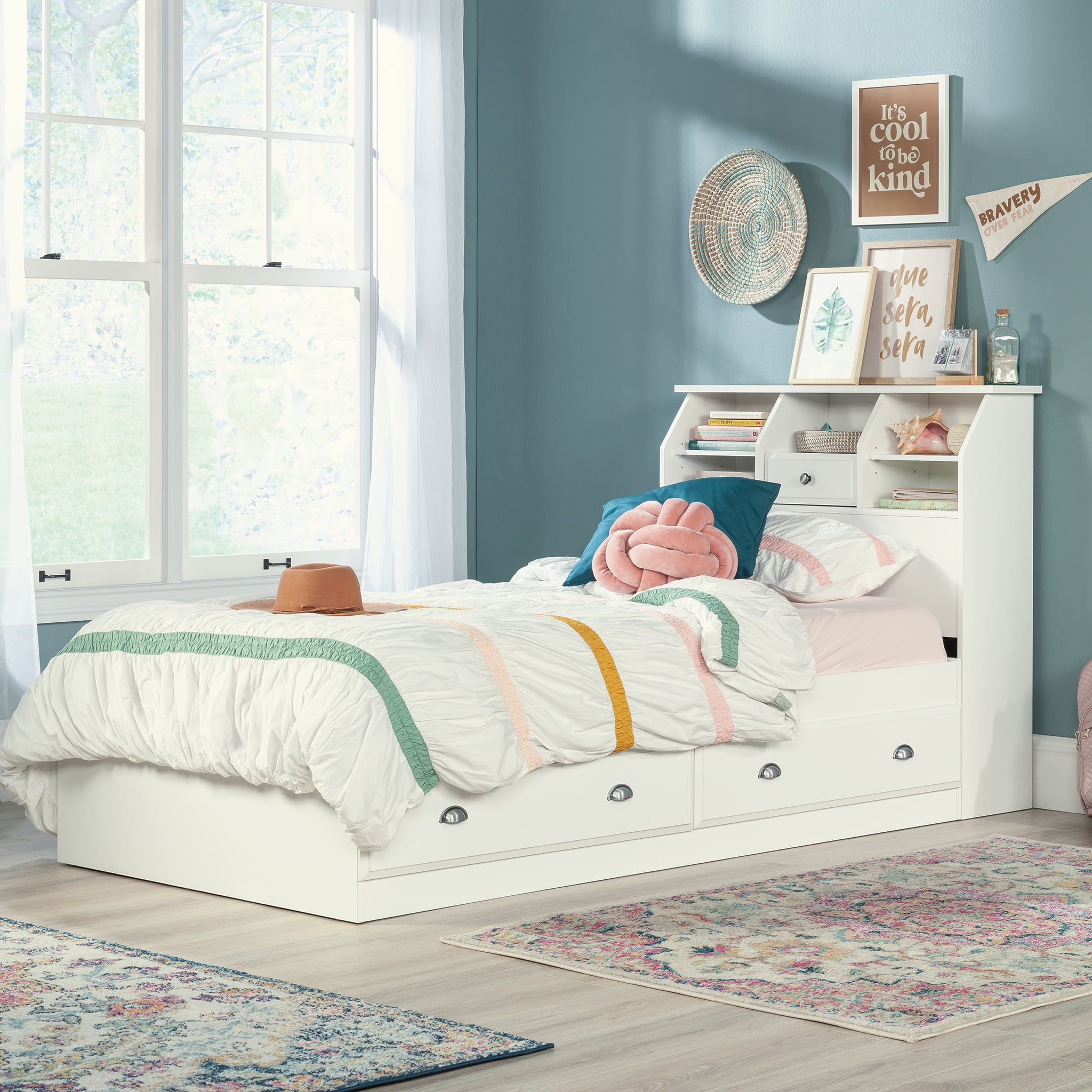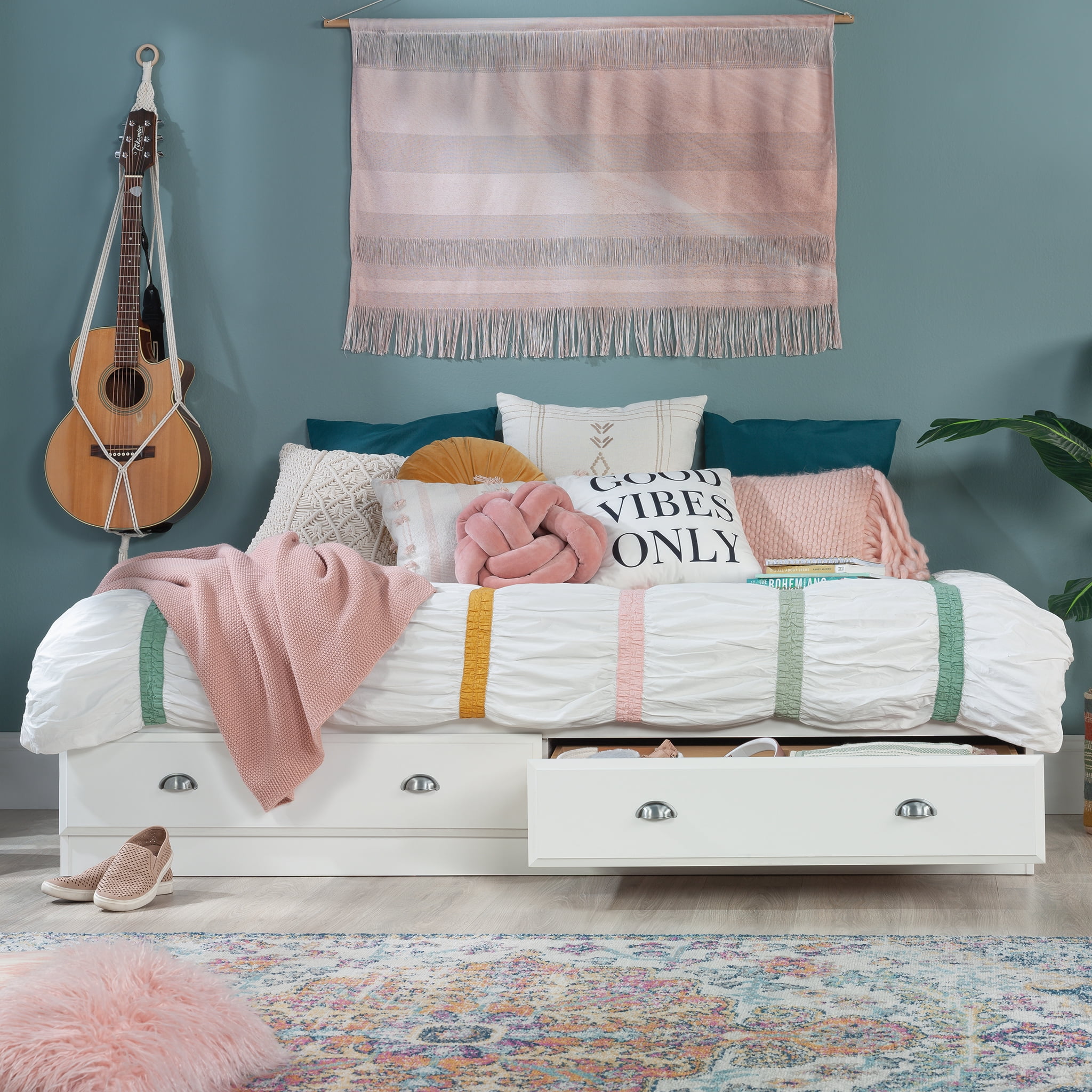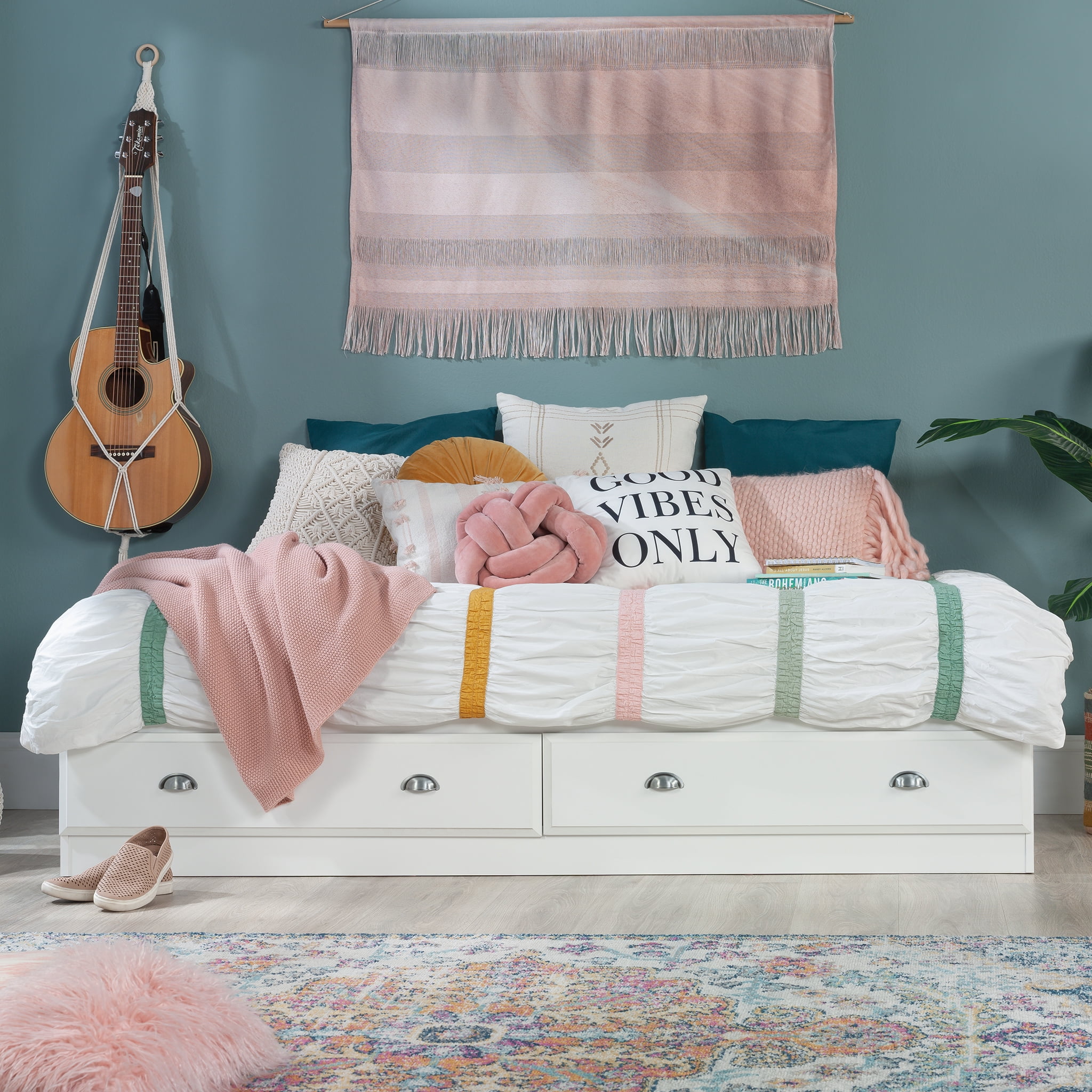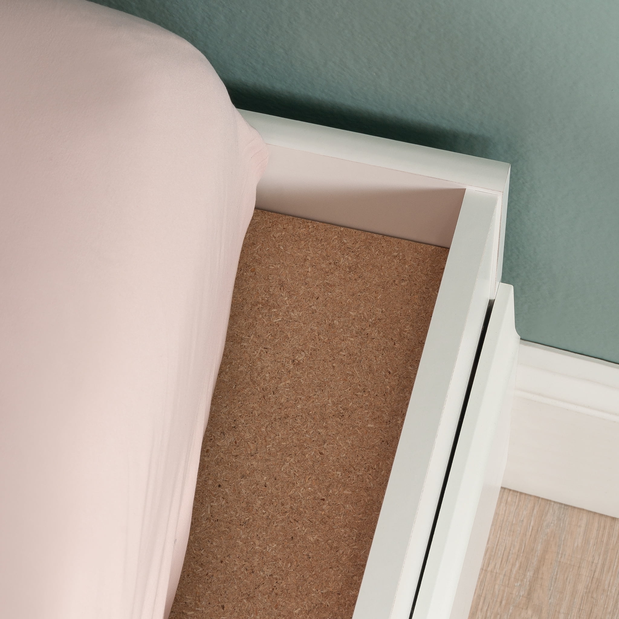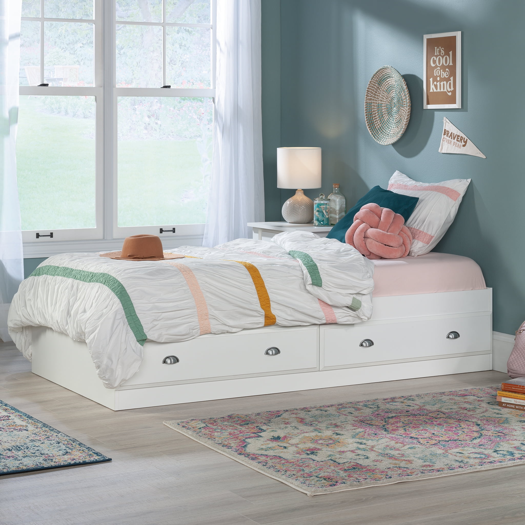 Add timeless style to your bedroom with this mate’s bed from the Shoal Creek collection. This twin bed with drawers is not only the perfect place to sleep or relax, but it also makes a handy space to store blankets and toys in the convenient under bed storage. Two drawers feature metal runners and safety stops and removable dividers for versatile storage so your socks, shirts, pants, and more are always organized and easy to find. Add this twin mates bed to the kids’ room, guest room, or anywhere you need somewhere to lay your head. Use it as a day bed—perfect for reading or doing a crossword puzzle. Finished in a classy Soft White, this twin storage bed adds style and functionality to your bedroom. We hope you like what you see. Sauder designers travel the world and bring back the best and latest in style, finish, and color trends. This inspiring world travel is evident in the cutting edge and innovative furniture solutions we offer to you!
