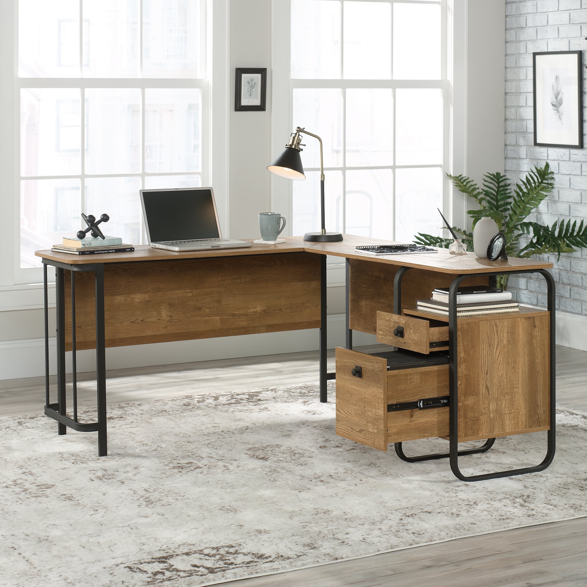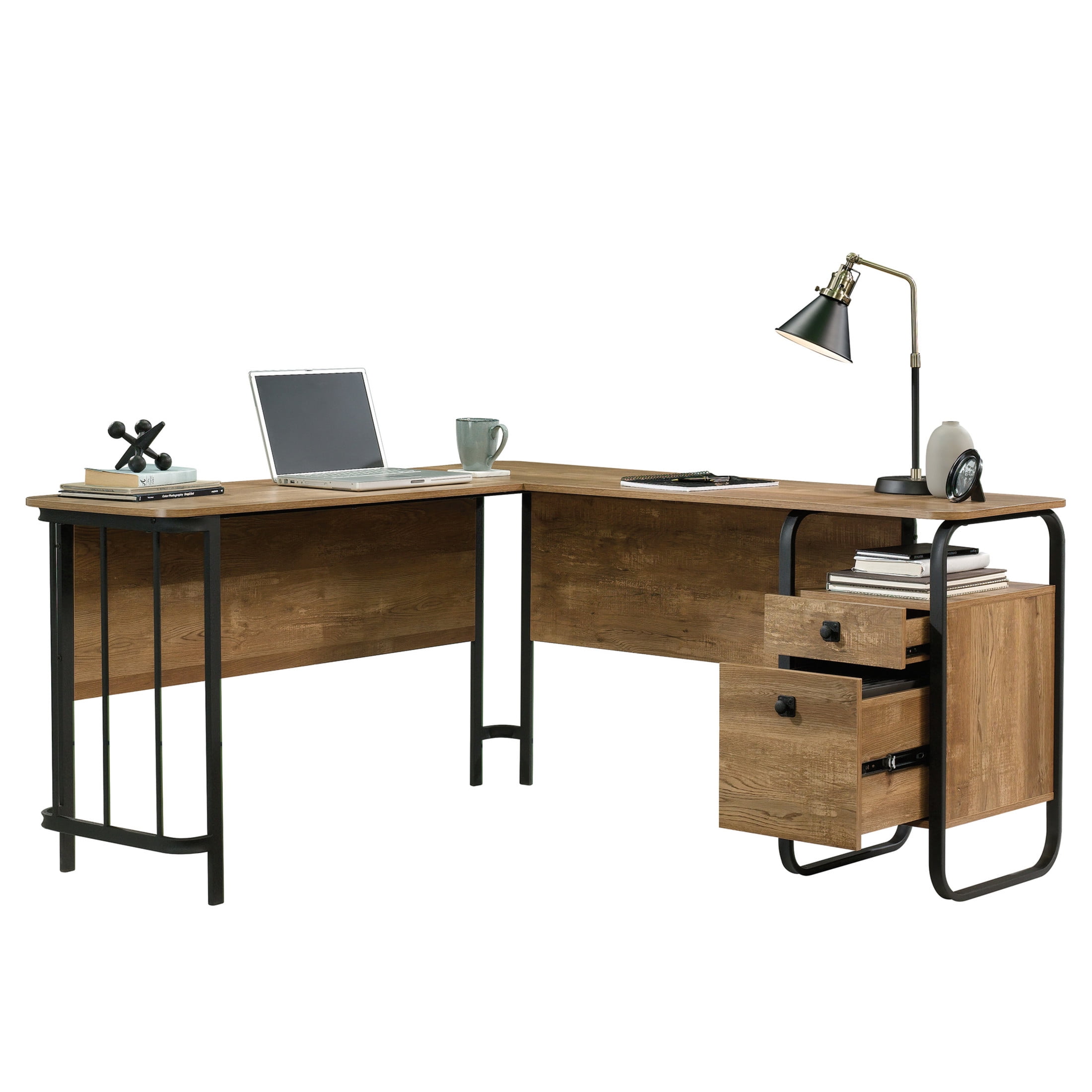 Find the motivation to tackle all your big projects when you add the rustic-inspired style and functional design of the L-shaped desk from the Station House collection. This home office desk offers a spacious top surface with ample room for your office essentials like notepads, a table lamp, laptop, and hot cup of coffee. The small storage drawer opens and closes on smooth metal runners for easy-access storage of all your miscellaneous supplies. The lower drawer with full extension slides can organize letter-size hanging files. Need more? This small office desk also includes a cubbyhole area to conveniently store papers and binders. Other features include two desktop grommets for cord management. Attractive from every angle, this L-shaped desk with storage is finished on all sides for versatile placement. Finished in Etched Oak and detailed with a textured, powder-coated metal frame, this industrial L-shaped desk will inspire you to work. We hope you like what you see. Our designers travel the world and bring back the best and latest in style, finish, and color trends. This inspiring world travel is evident in the cutting edge and innovative furniture solutions we offer to you! Other affordable furnishings from the collection (sold separately) are available to complete the look. For assistance after the purchase, you can to reach out to our award-winning and friendly Midwest based customer service. They are ready to help you every step of the way with any questions you might have about the product. Please contact us at 1-800-523-3987.