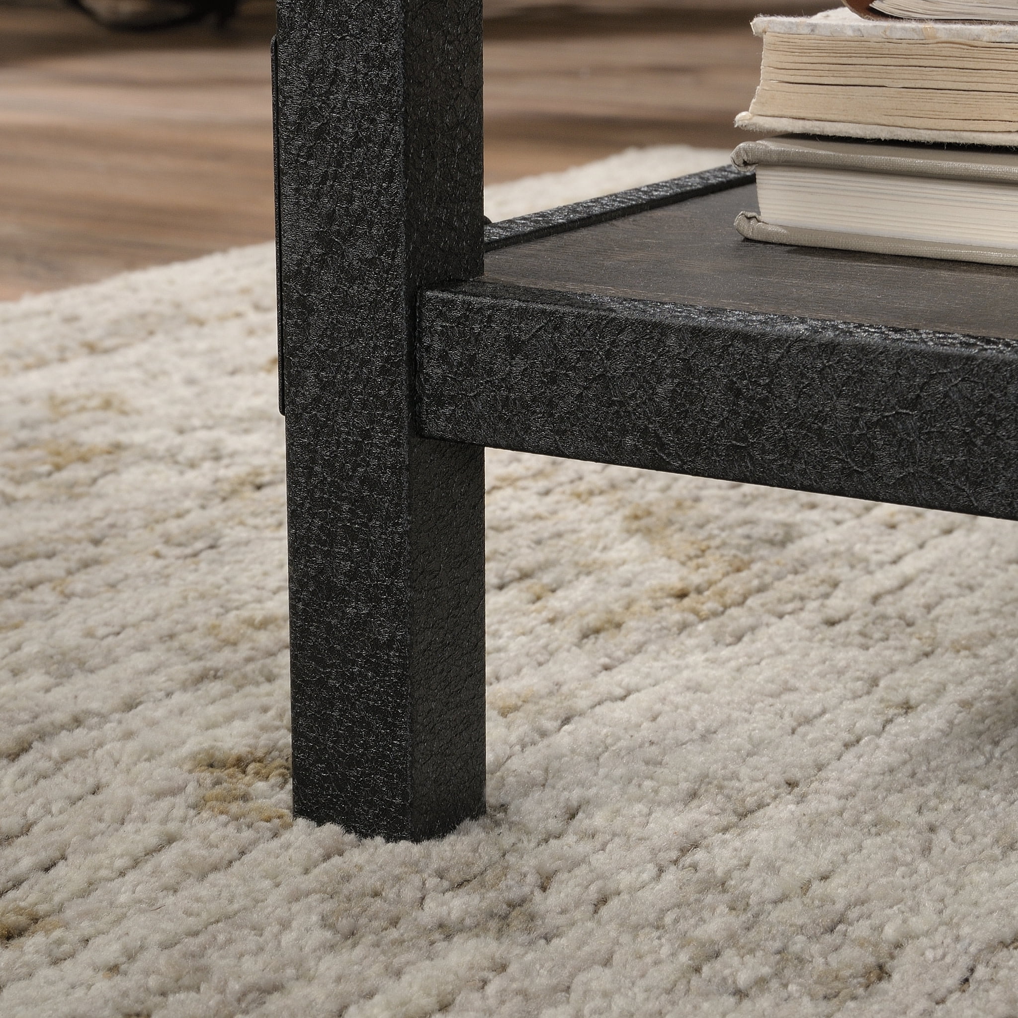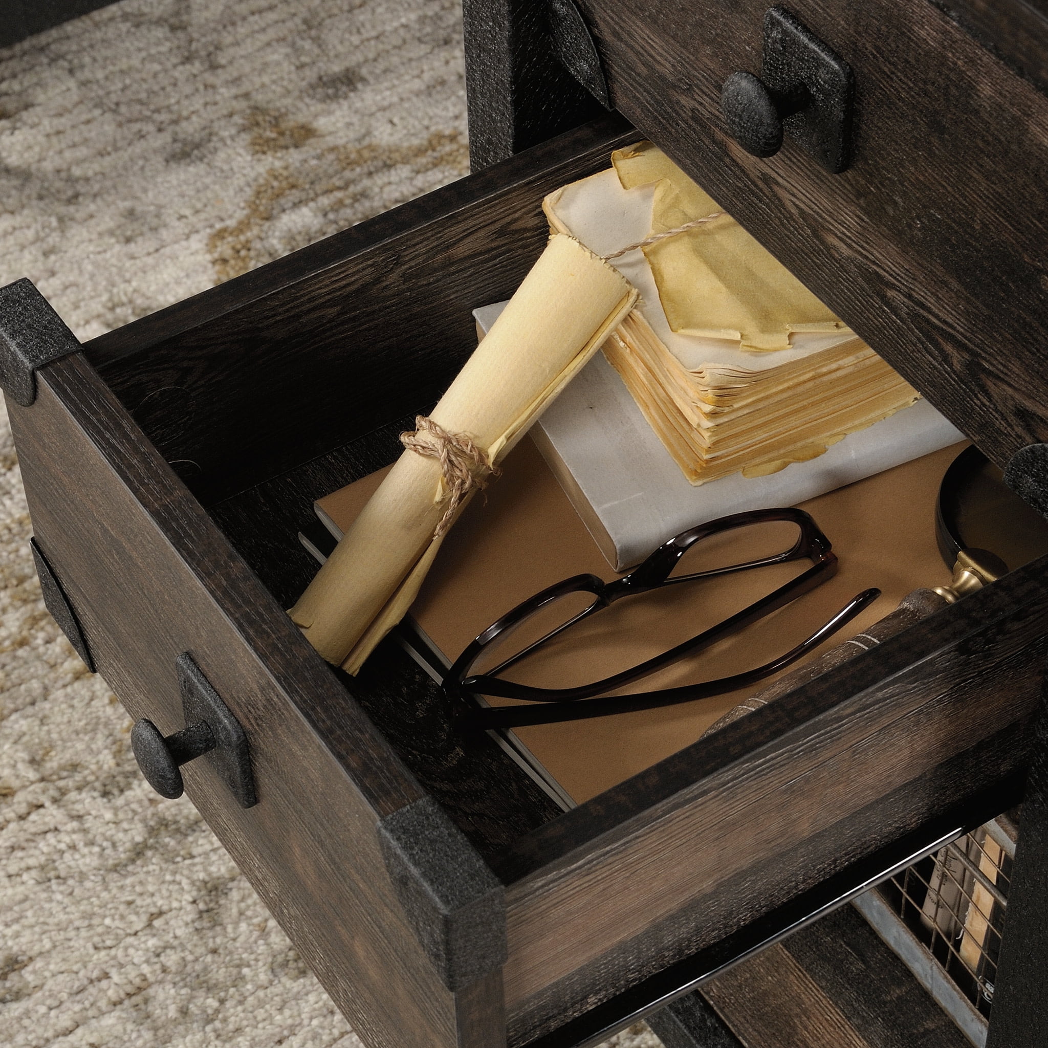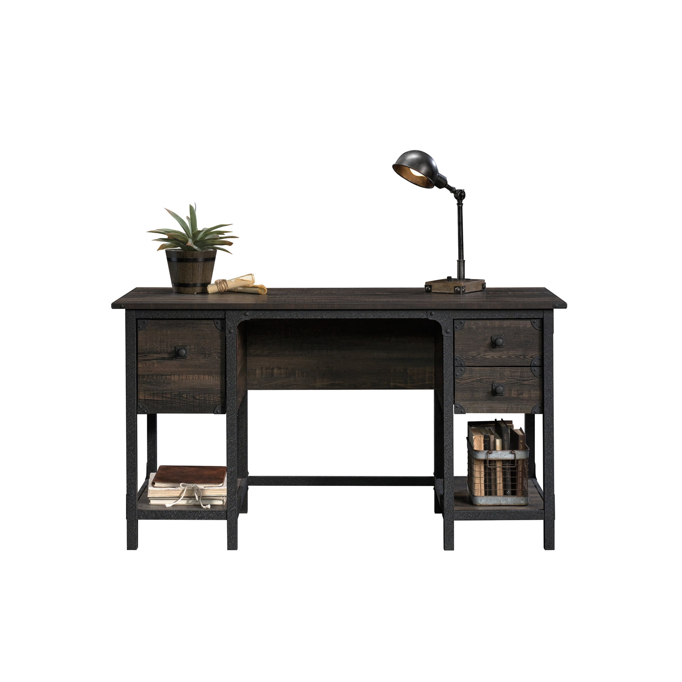 Who said you can’t have style in the workplace? Give your home office or workspace the internationally inspired update it deserves with this small computer desk from the Steel River collection. This computer desk with storage has a top surface that provides you with ample room for all your must-have desk supplies like your laptop, collection of notepads, your cup of coffee and even an accent lamp. This home office desk features two storage drawers with metal runners and safety stops for pens, charging cords, or sticky notes. A third drawer with full extension slides accommodates letter-size hanging files so you can keep all your important papers organized. Don’t need hanging files? That’s alright. These convenient drawers also make a great place for easy access storage of miscellaneous office supplies like folders, your stapler, and your hidden stash of candy — we know what keeps you motivated. This computer desk with drawers also features two lower open shelves on each side for additional storage of items like stacks of books, organizing bins and maybe even a couple home décor items. This desk is finished on all sides for versatile placement in any room of your home: It looks great from any angle! Finished in Carbon Oak and detailed with a textured, powder coated metal frame and corner accents, this beautiful industrial style wood home office desk is just what your home has always needed.