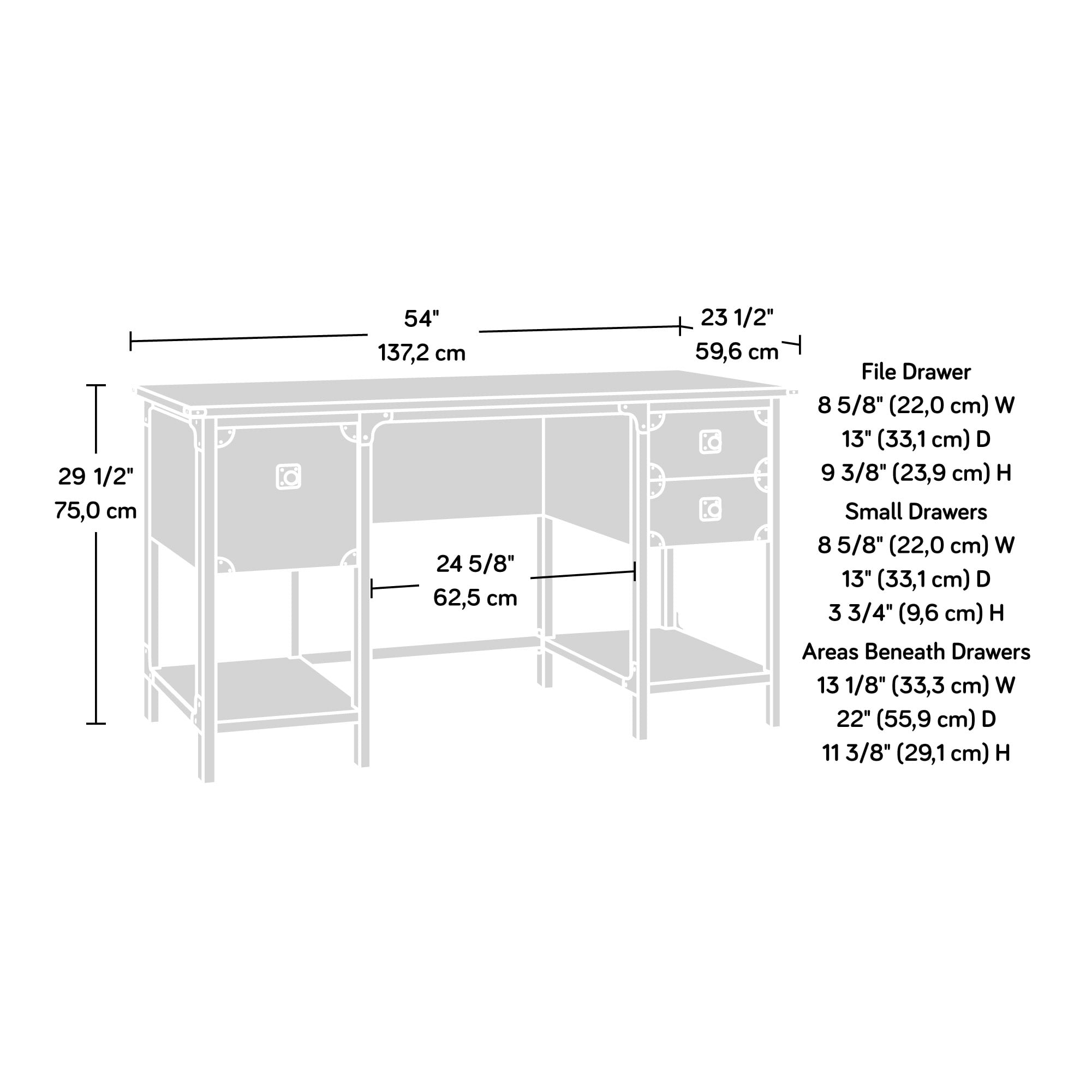 Assembled Dimensions: 54.02″ L x 23.47″ W x 29.53″ H File drawer with full extension slides holds letter-size hanging files Two storage drawers for office supplies feature metal runners and safety stops Two lower shelves for additional storage of books, binders, or home decor Detailed with a textured, powder coated metal frame and corner accents Finished on all sides for versatile placement in any room of your home Finished in Carbon Oak Model #: 427652 Box Dimensions: 63.80″ L x 27.97″ W x 5.25″ H For additional questions or any issues, please contact the manufacturer at 1-800-523-3987. Be sure to check out the Sauder Steel River collection for more great items!