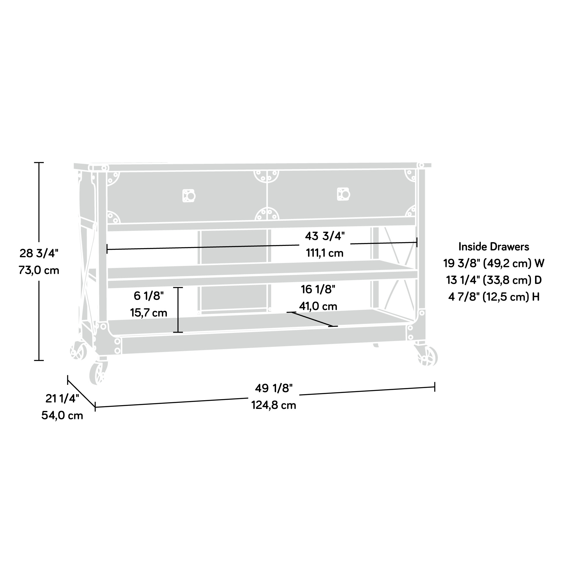 Assembled Dimensions: 49.13″ L x 21.26″ W x 28.74″ H Accommodates up to a 55″ TV weighing 70 lbs or less for optimal viewing pleasure Two drawers feature metal runners and safety stops to keep you and your family safe Open shelving for storage and display of audio/video equipment or your favorite home dcor Textured, powder coated metal frame and corner accents Finished on all sides for versatile placement anywhere in your home Decorative, fixed casters Carbon Oak finish Model #: 423913 Box Dimensions: 57.28″ L x 22.7″ W x 6.5″ H For additional questions or any issues, please contact the manufacturer at 1-800-523-3987. Be sure to check out the Sauder Steel River collection for more great items!