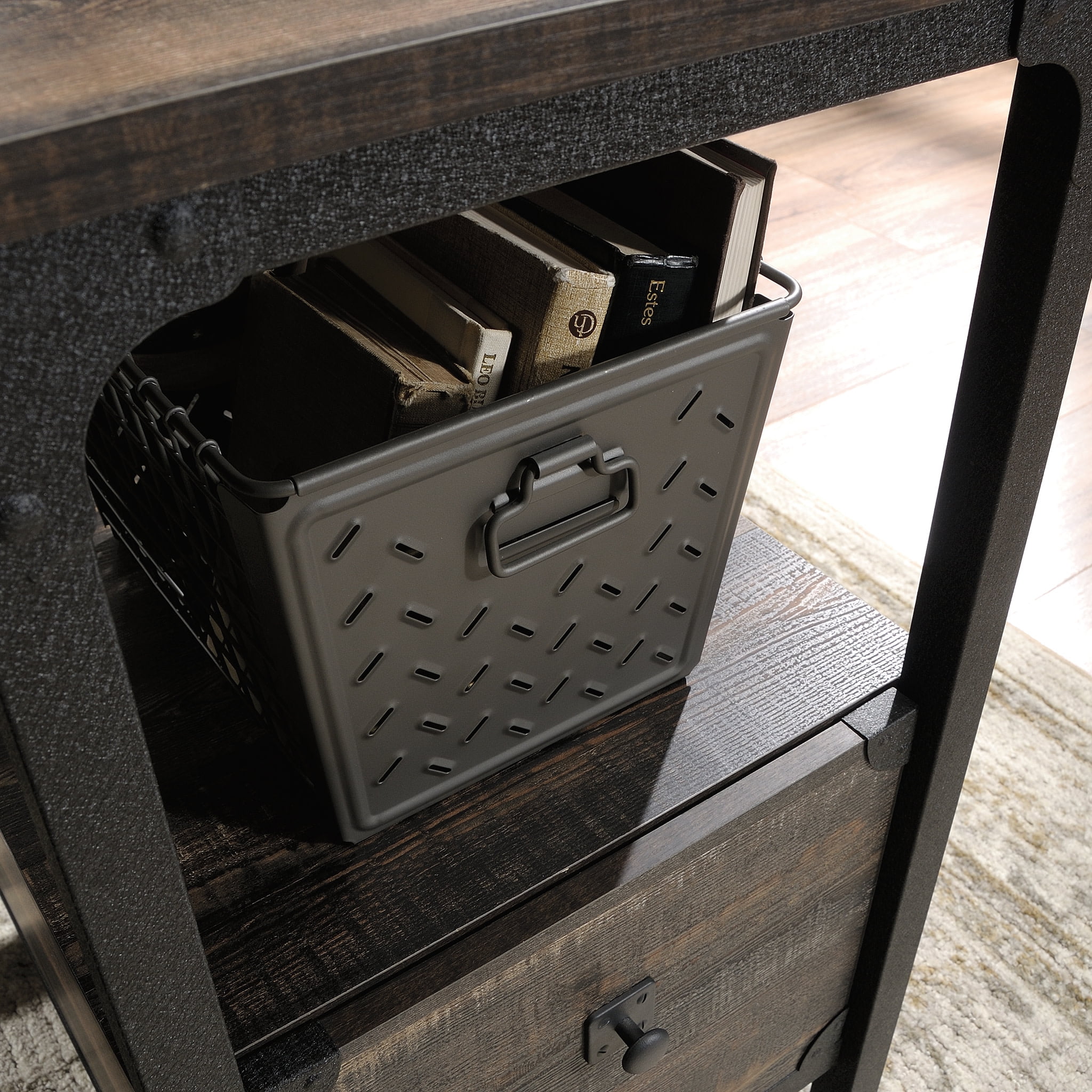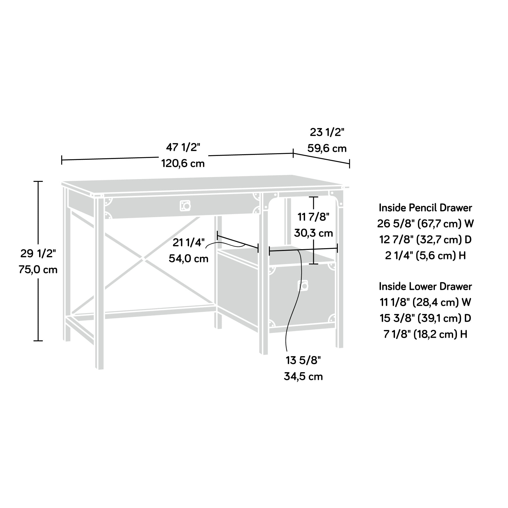 Assembled Dimensions: 47.48″ L x 23.47″ W x 29.53″ H Two drawers feature metal runners and safety stops to keep you and your family safe Open shelf for storage of office supplies Finished on all sides for versatile placement anywhere in your home Textured, powder coated metal frame and corner accents Rear crossbars for stability Carbon Oak finish Model #: 423912 Box Dimensions: 52.36″ L x 26.38″ W x 6.69″ H For additional questions or any issues, please contact the manufacturer at 1-800-523-3987. Be sure to check out the Sauder Steel River collection for more great items!