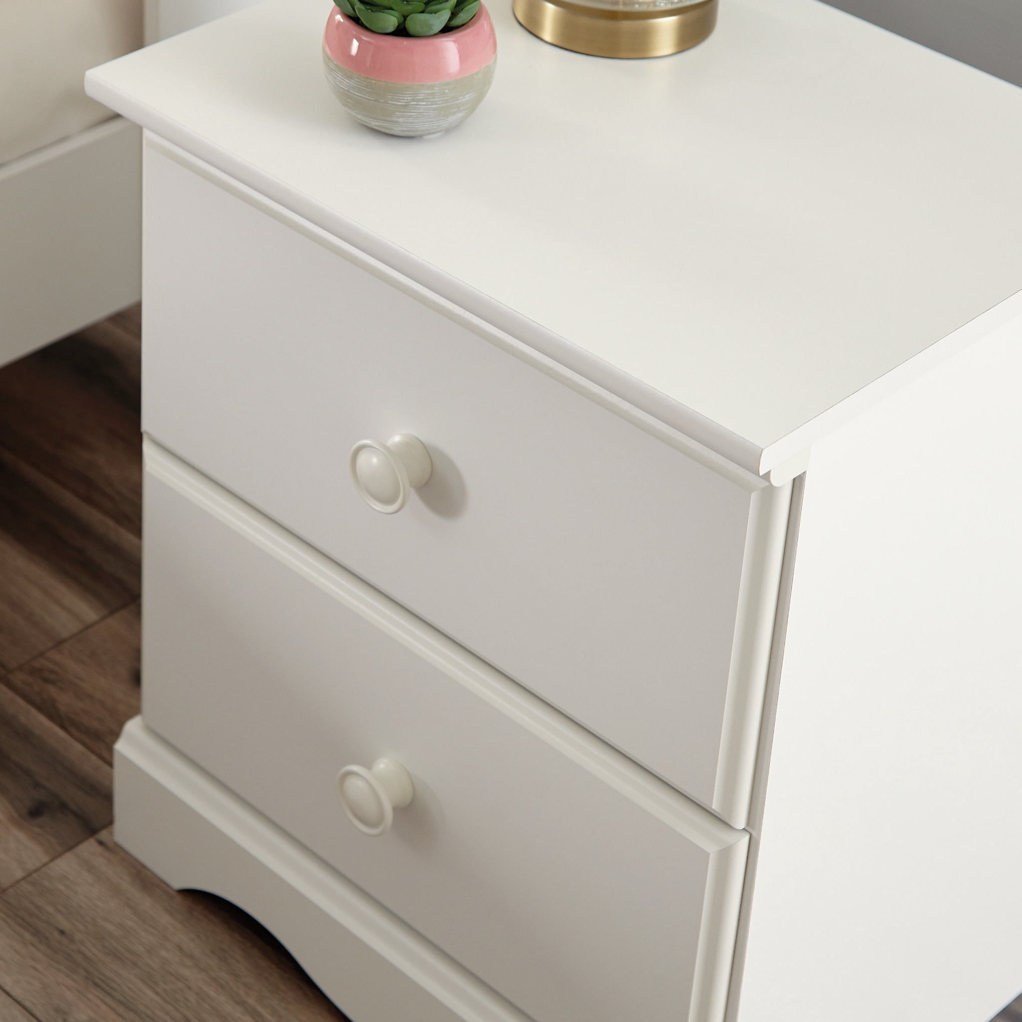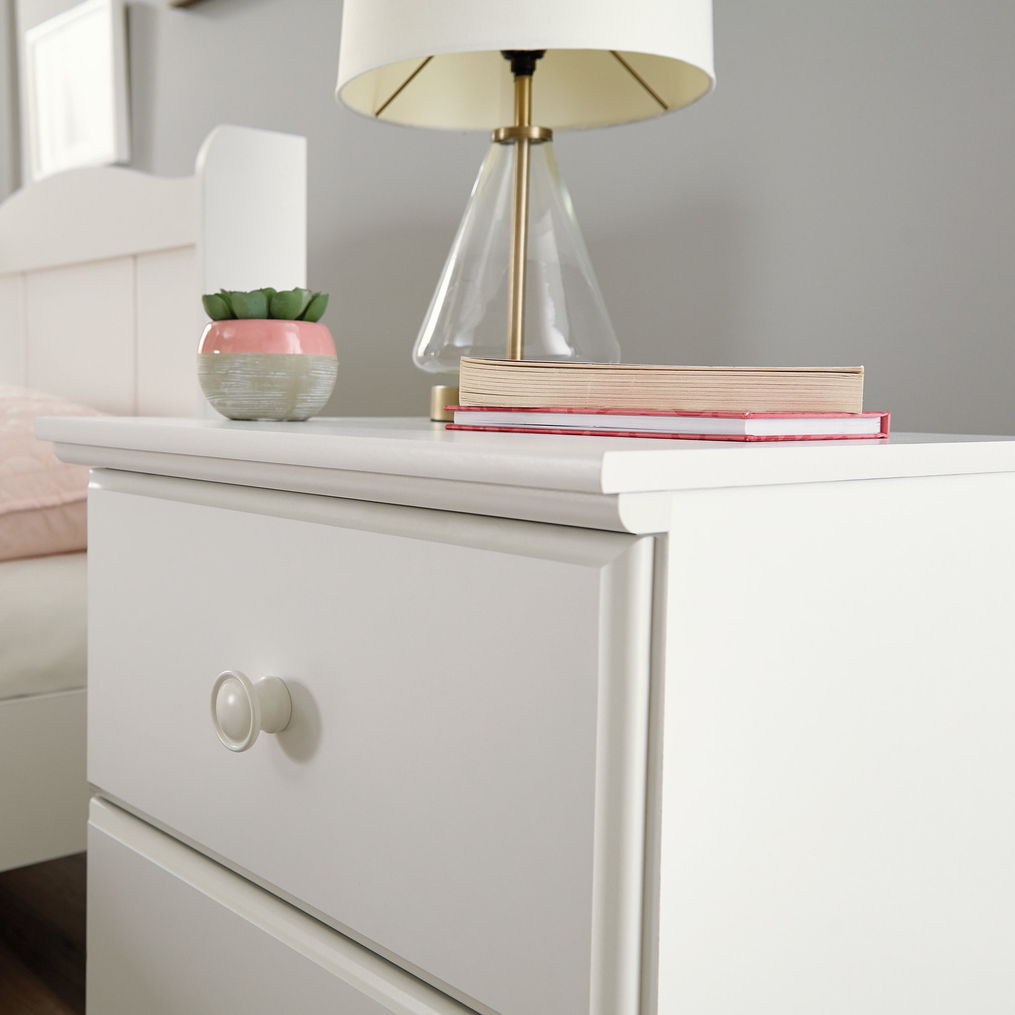 With a delicate, Soft White finish that works in a kids room, spare bedroom, or nearly any room, this 2-drawer nightstand from the Storybook collection will lift the curse on your decor with its innocent elegance. This nightstand with 2 drawers offers ample room to store those items that you need to keep within reach as you sleep, with plenty of space for your favorite book, an alarm clock, photo, lamp, writing pad, and more. This white nightstand features a classic design that will blend well with most existing decor. A delicate, scalloped trim on the base adds a whimsical flair to this bedside table with drawers. The drawers also rest on metal runners with safety stops, for smooth and reliable access to your items within. Equipped with a T-lock drawer assembly system, this bedside table with storage will be assembled in no time, and ready to bring a happy ending to any room in your home.