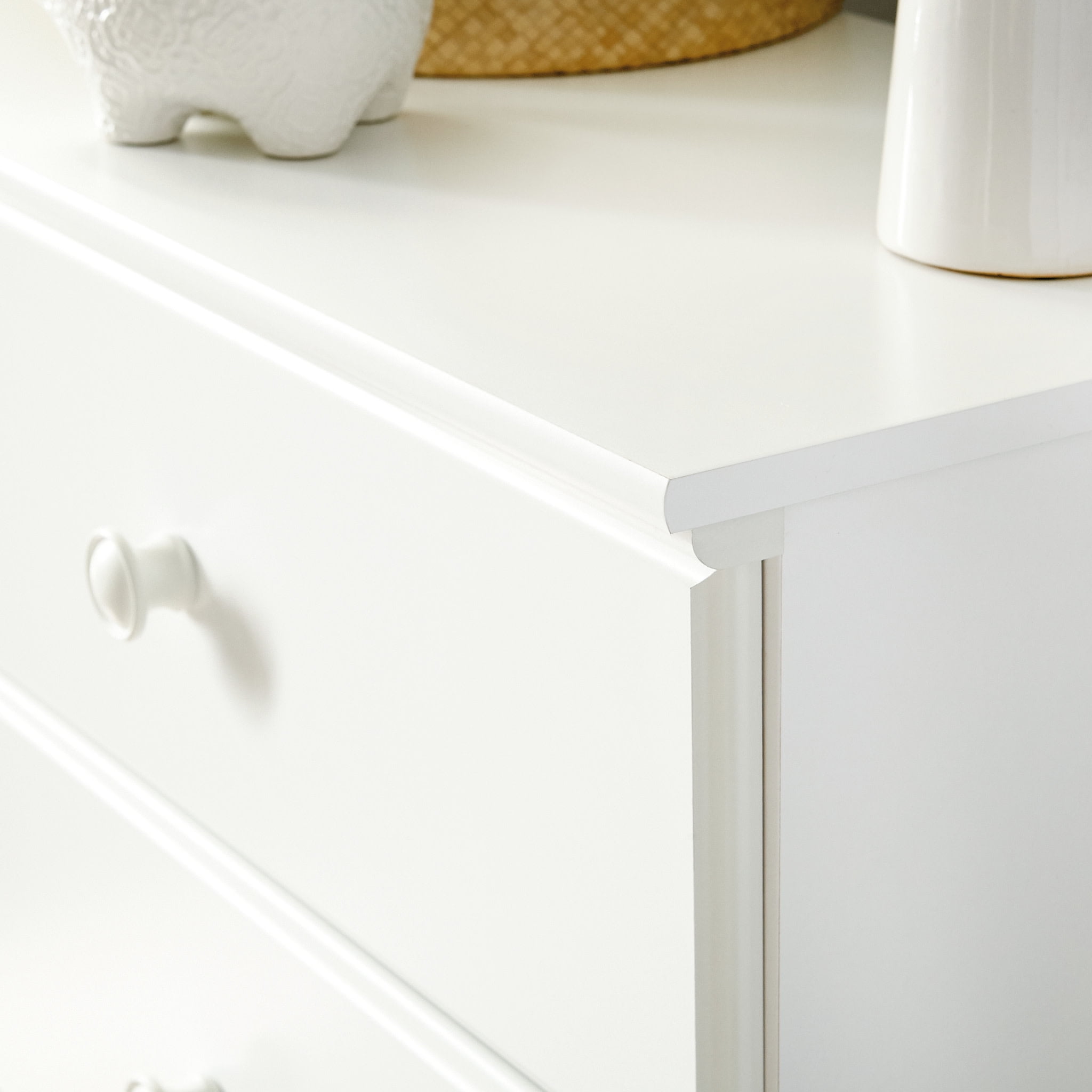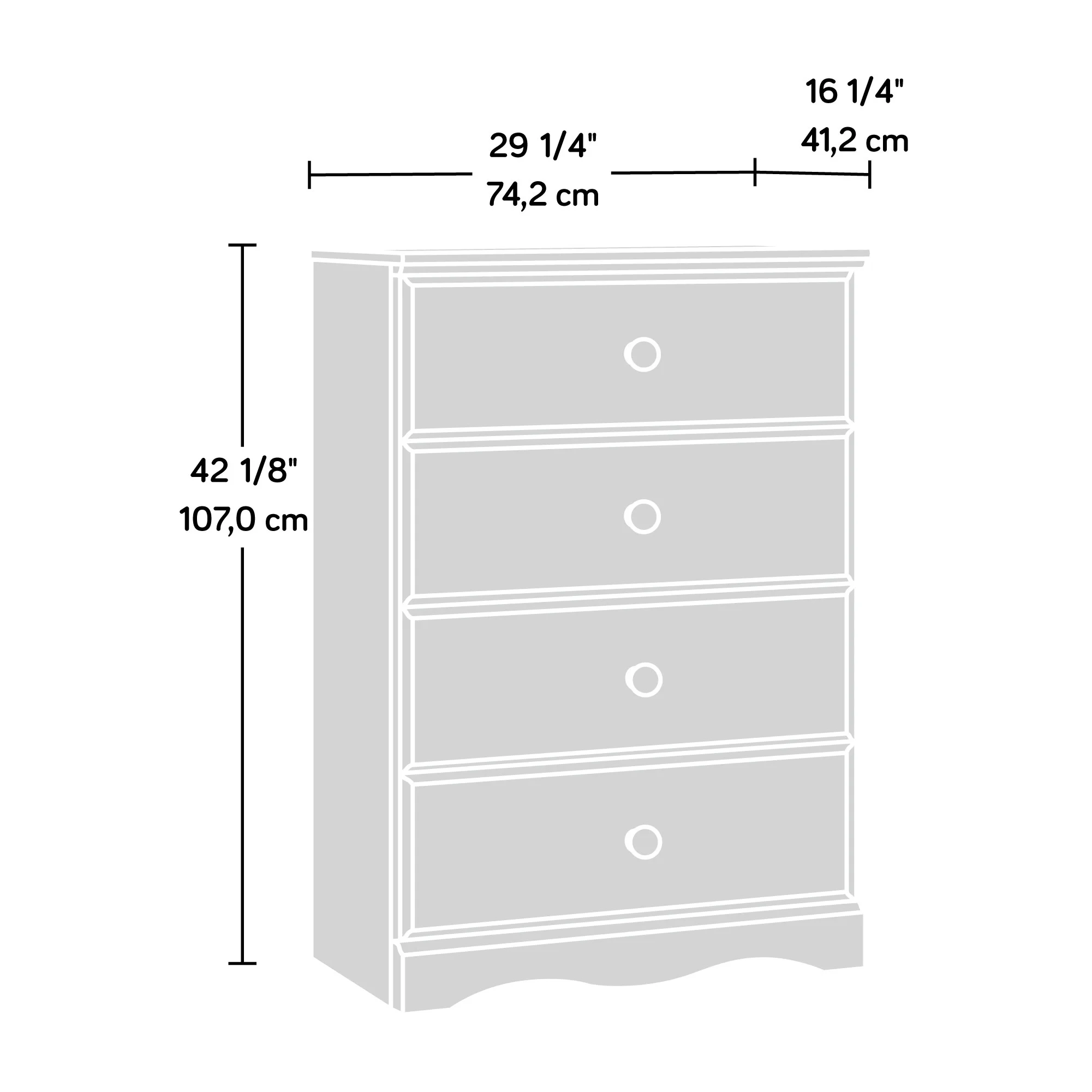 Assembled Dimensions: 29.21″ L x 16.22″ W x 42.13″ H Spacious drawer storage Curved details and solid wood knobs Constructed with metal runners and safety stops for easy and smooth drawer access Soft White finish Model #: 416407 Box Dimensions: 47.19″ L x 16.81″ W x 6.69″ H For additional questions or any issues, please contact the manufacturer at 1-800-523-3987. Be sure to check out the Sauder Storybook collection for more great items!