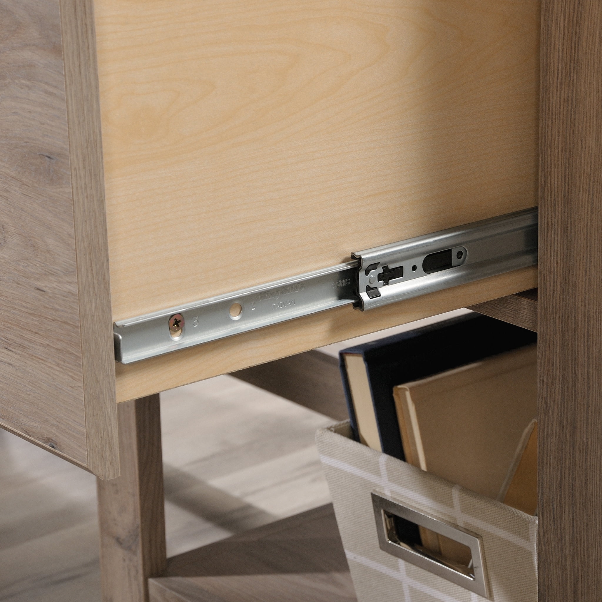 Assembled Dimensions: 58.66″ L x 66.46″ W x 29.02″ H File drawer with full extension slides holds letter-size hanging files to help keep you organized Lower shelf for additional storage Finished on all sides for versatile placement anywhere in your home Cord management includes two desktop grommets which provide a convenient path for cord management Strong and lightweight panel construction Details include tapered feet and chamfered edges Quick and easy assembly with patented T-lock drawer system because we know your time is valuable Laurel Oak finish Model #: 425014 Box Dimensions: 66.31″ L x 20.94″ W x 5.75″ H For additional questions or any issues, please contact the manufacturer at 1-800-523-3987. Be sure to check out the Sauder Summit Station collection for more great items!