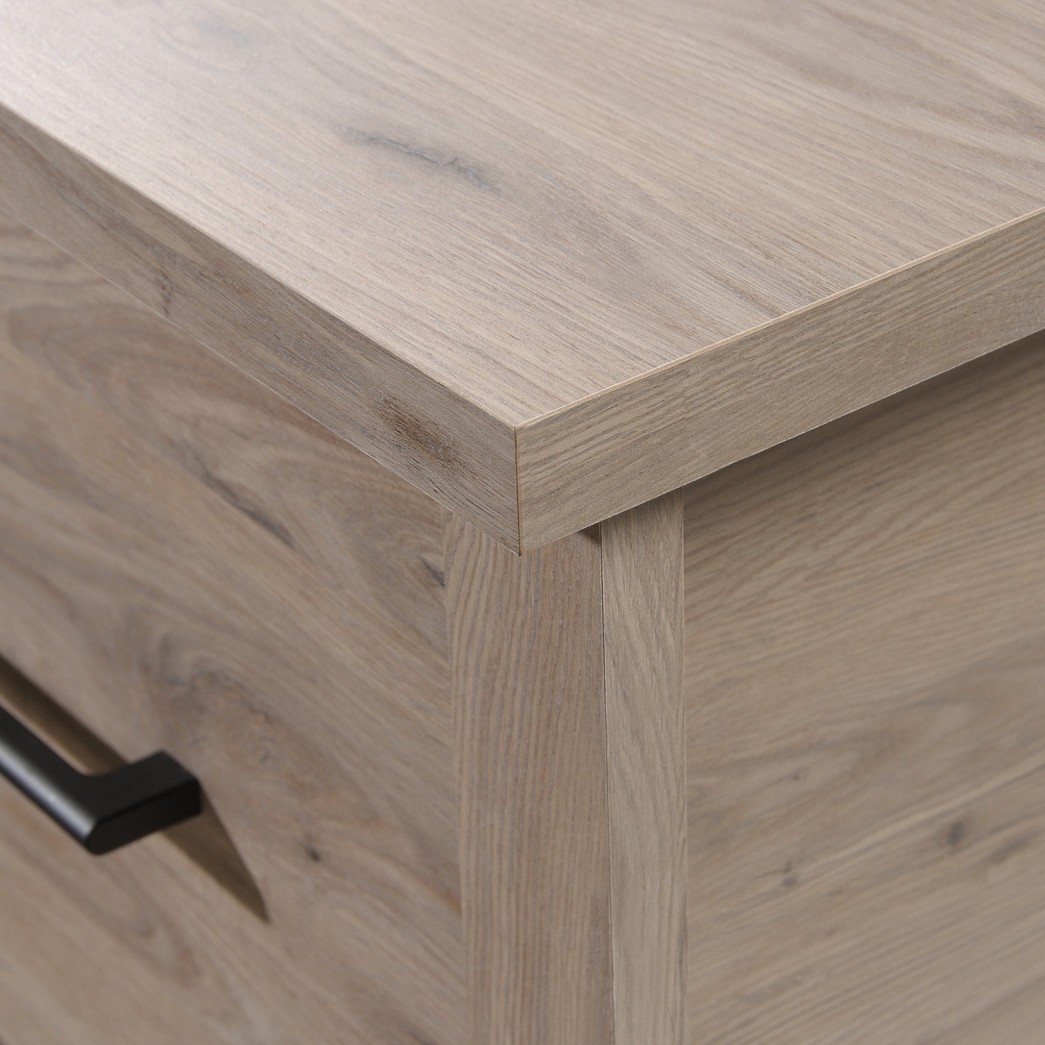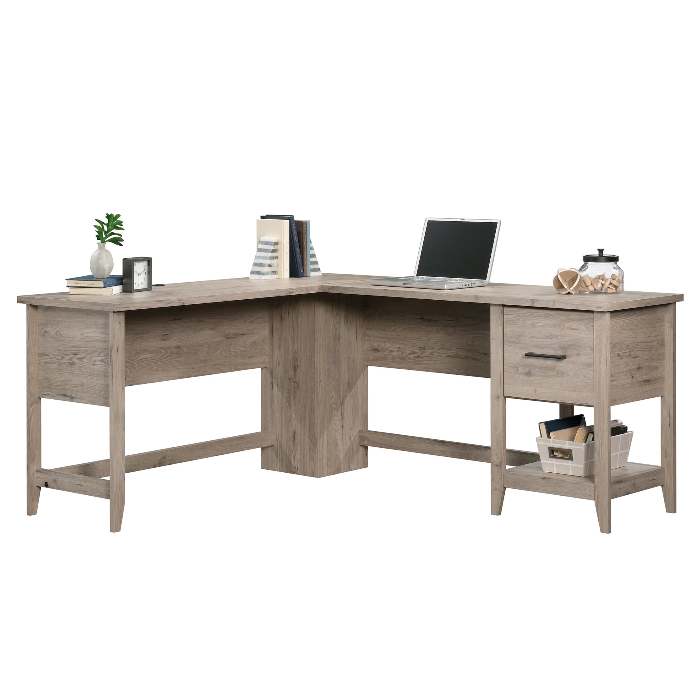 Find the motivation you need to tackle all your big projects when you give your office space the charming style and functional design of the L-shaped desk from the Summit Station collection. This home office desk offers a spacious top surface that provides you with all the room you need for office essentials like your laptop, stacks of folders, notepads and home décor items too. This L-shaped computer desk features a file drawer with full extension slides to hold letter-size hanging files so you can keep all your important documents organized. The lower shelf provides you with additional storage space for miscellaneous office items. Other features include two desktop grommets so you can conveniently keep wires out of the way. This small office desk is finished on all sides for versatile placement and features a strong, lightweight panel construction for easy moving. Finished in Laurel Oak and detailed with tapered feet and chamfered edges, this good-looking desk will have you feeling ready to work.
