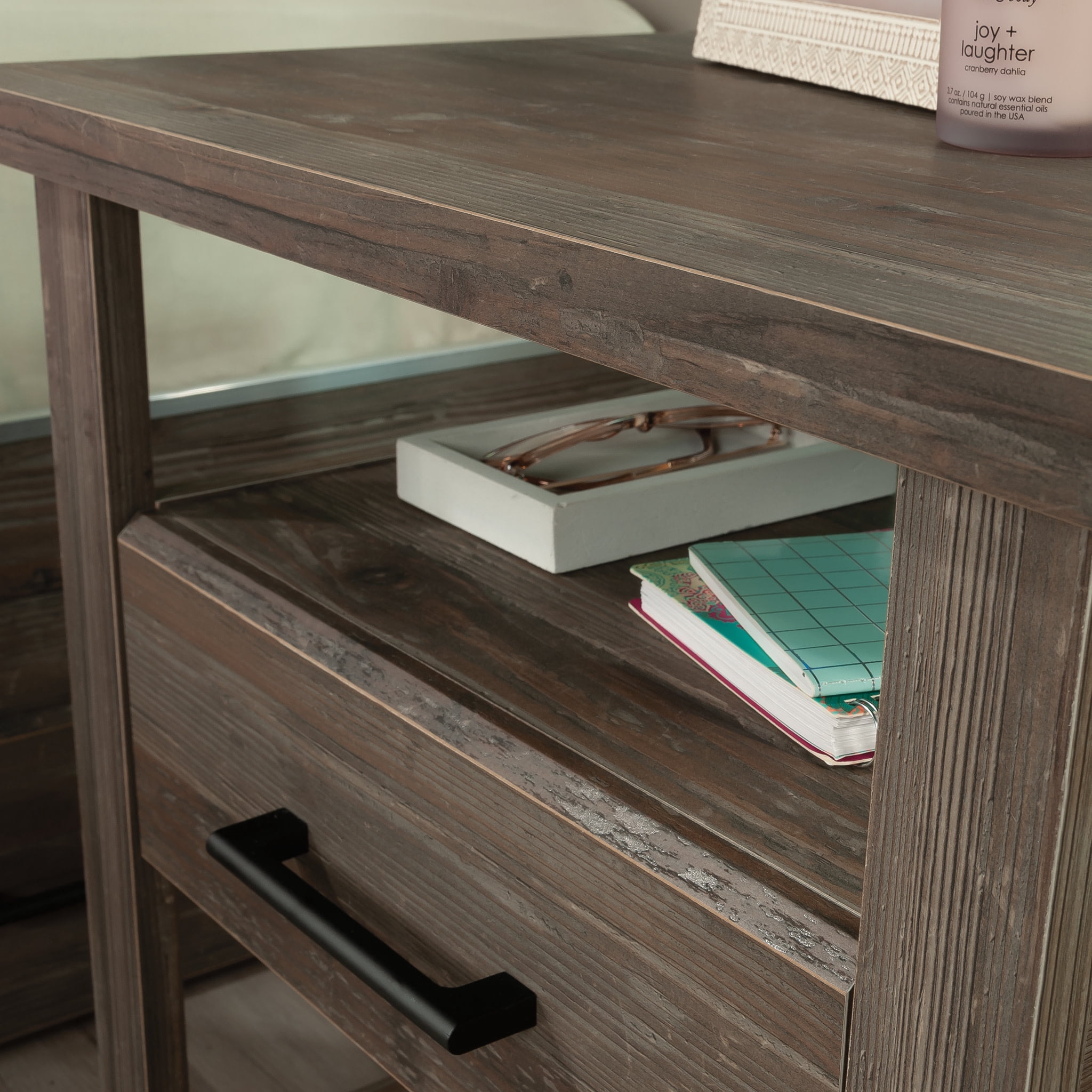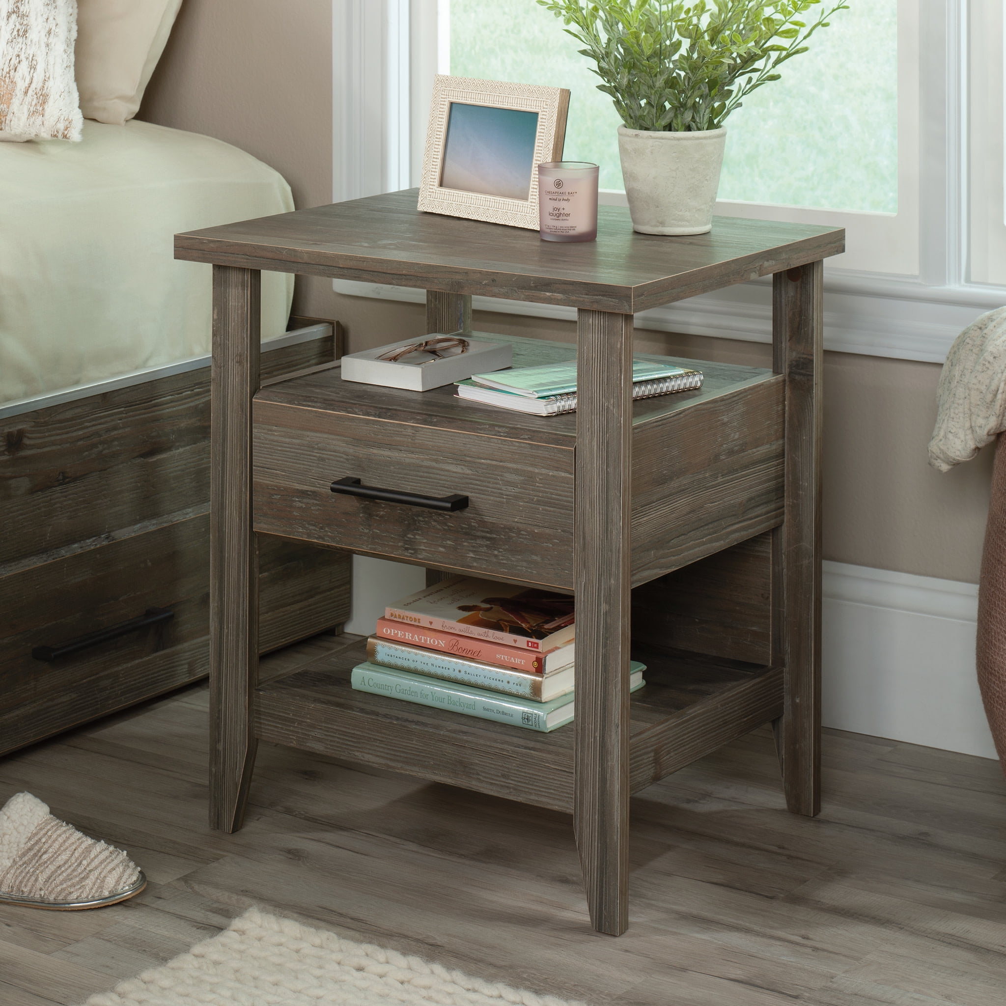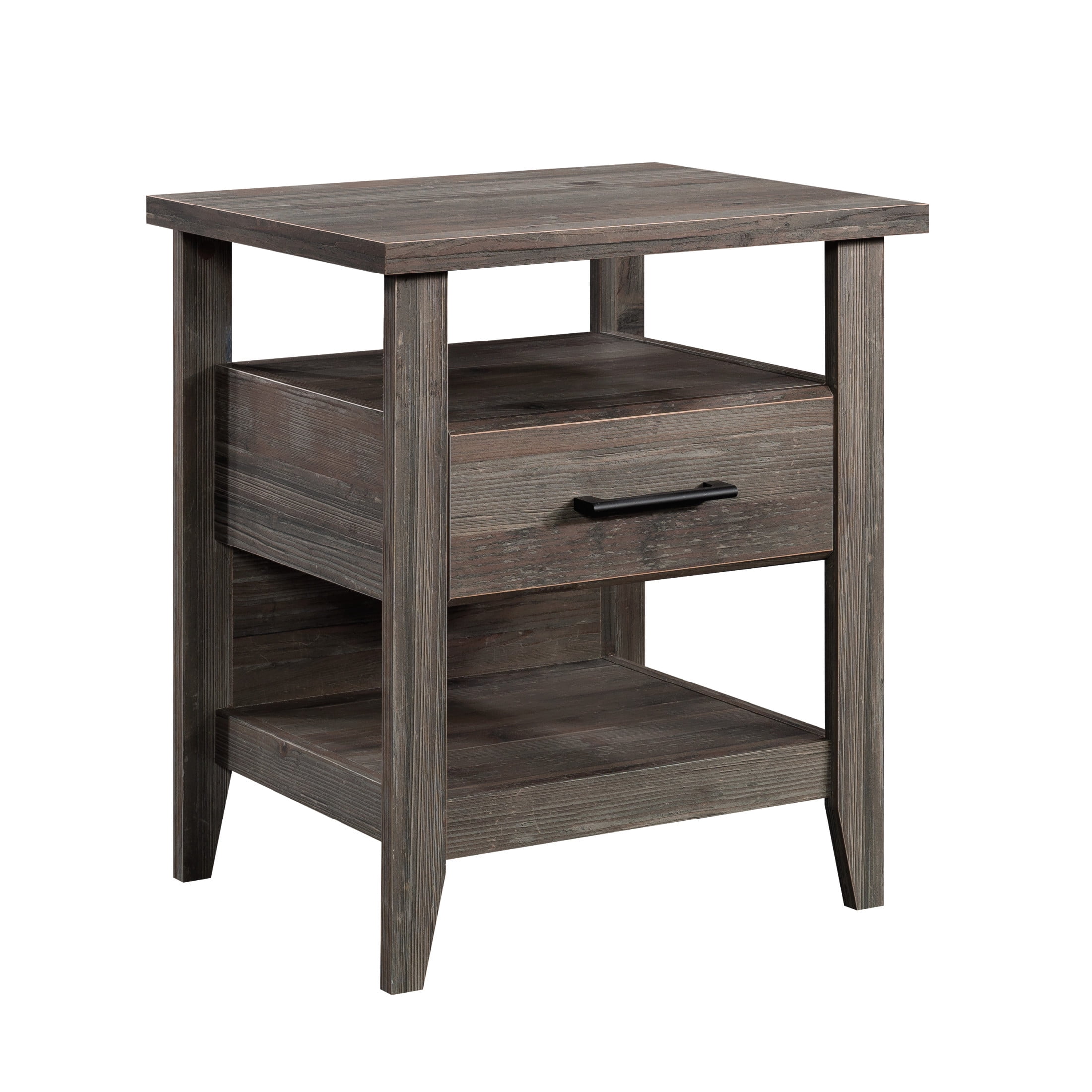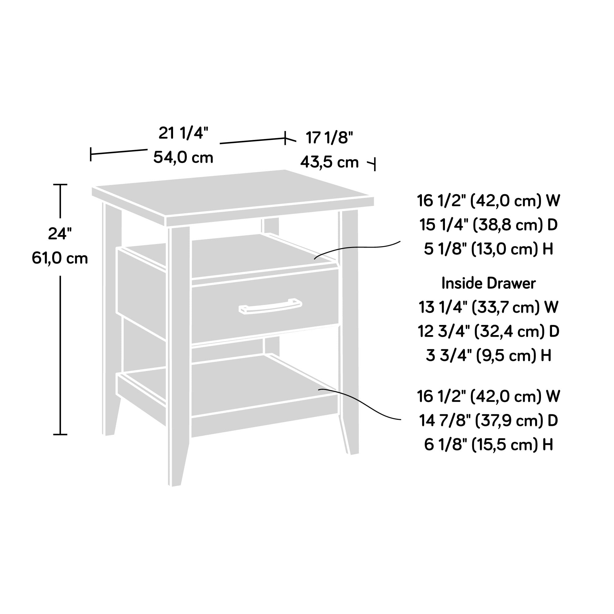 Complete the look of your bedroom with the simplistic charm and universal appeal of this bedside table with drawer from the Summit Station collection. The spacious top surface of this nightstand with drawer provides you with the perfect amount of space for all your bedside needs an accent lamp, a glass of water, an alarm clock, and a place to charge your smartphone. This nightstand with shelves features a convenient storage drawer that opens and closes on smooth metal runners and is ideal for easy access storage for items like your reading glasses and the TV remote. Two open shelves provide you with additional space for storage and display of any other miscellaneous around home essentials. This nightstand with open storage is finished on all sides for versatile placementit looks good no matter where is stands. Finished in Pebble Pine with tapered feet and chamfered edges, this bedside table with shelves gives your home the style and functionality youve been wanting.