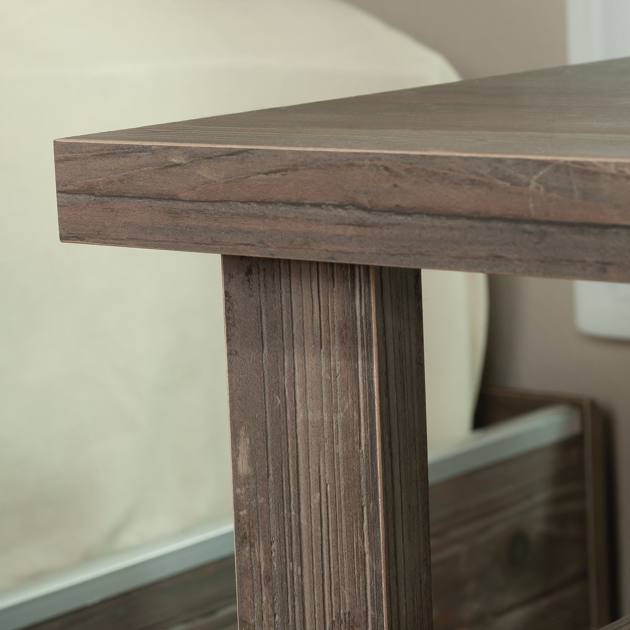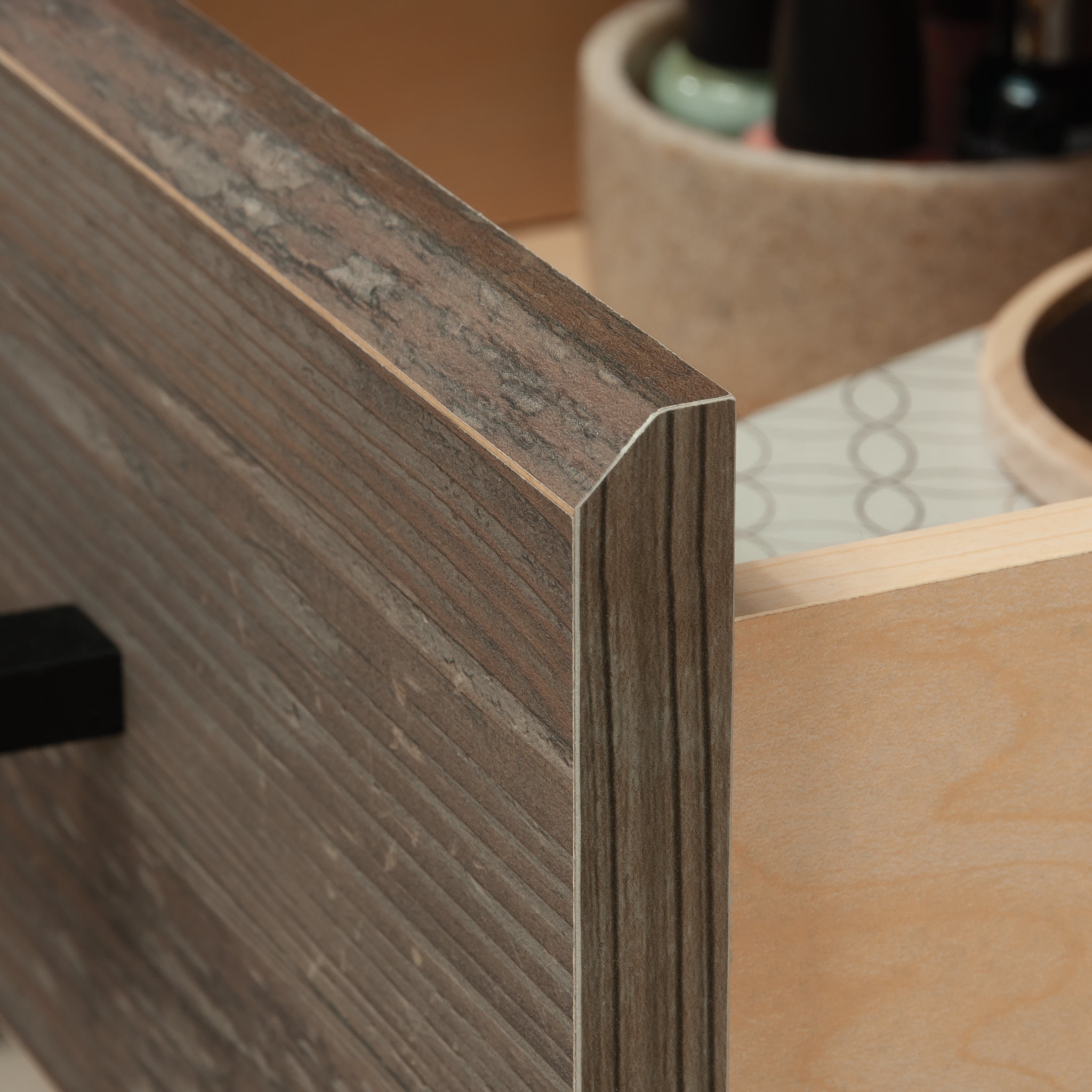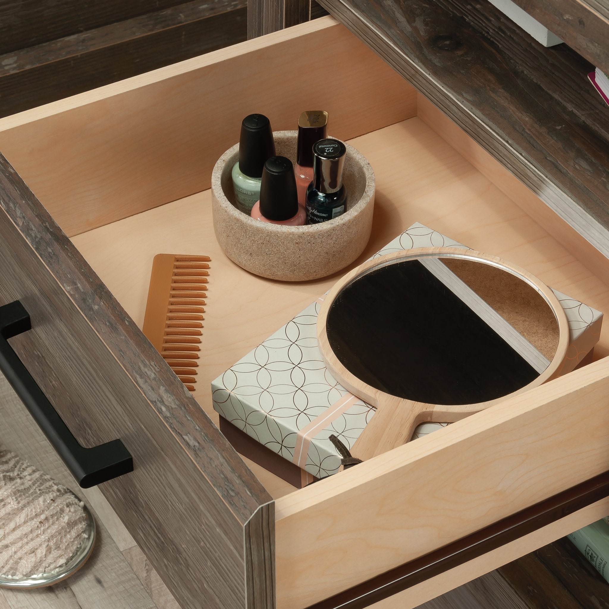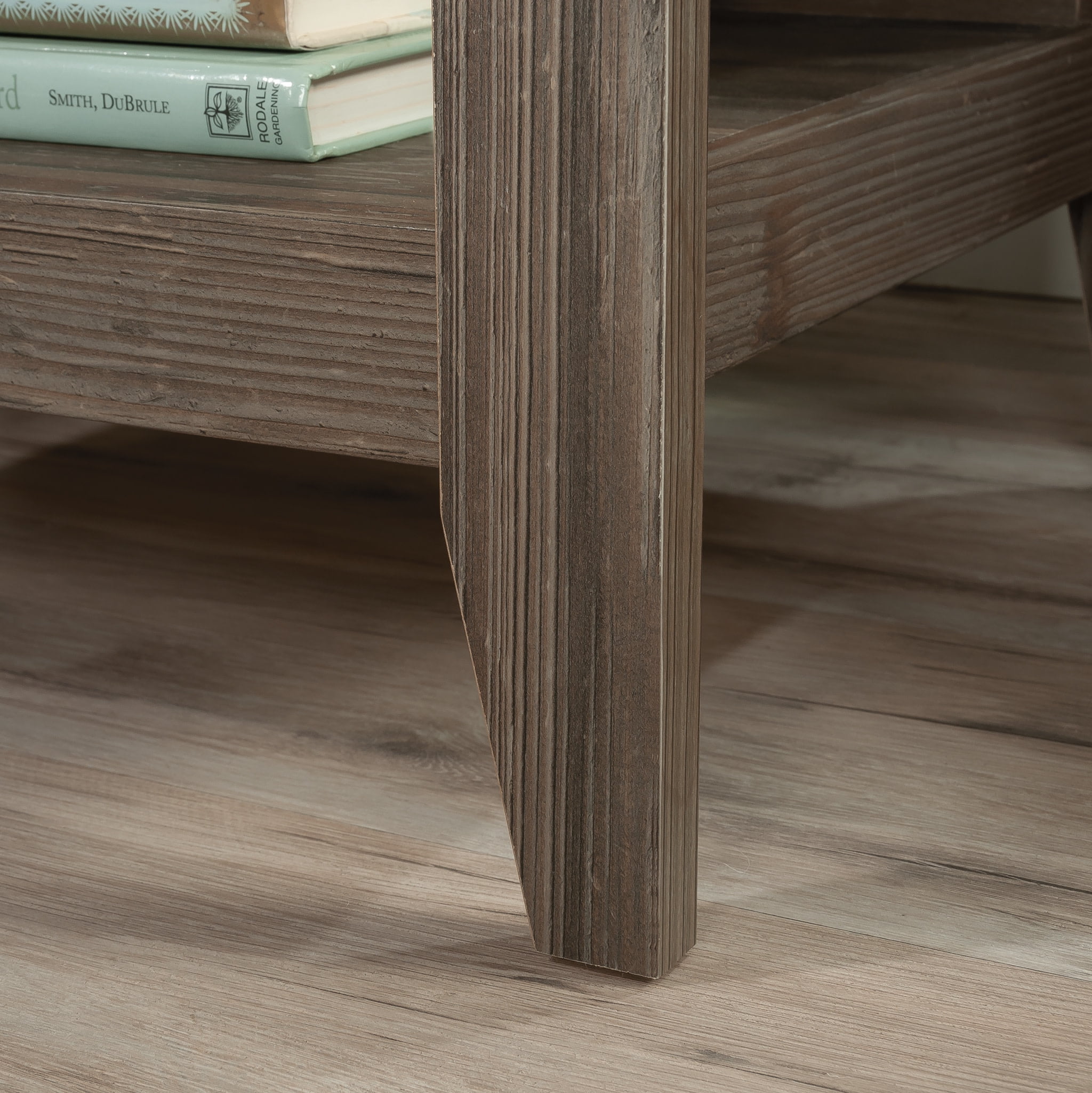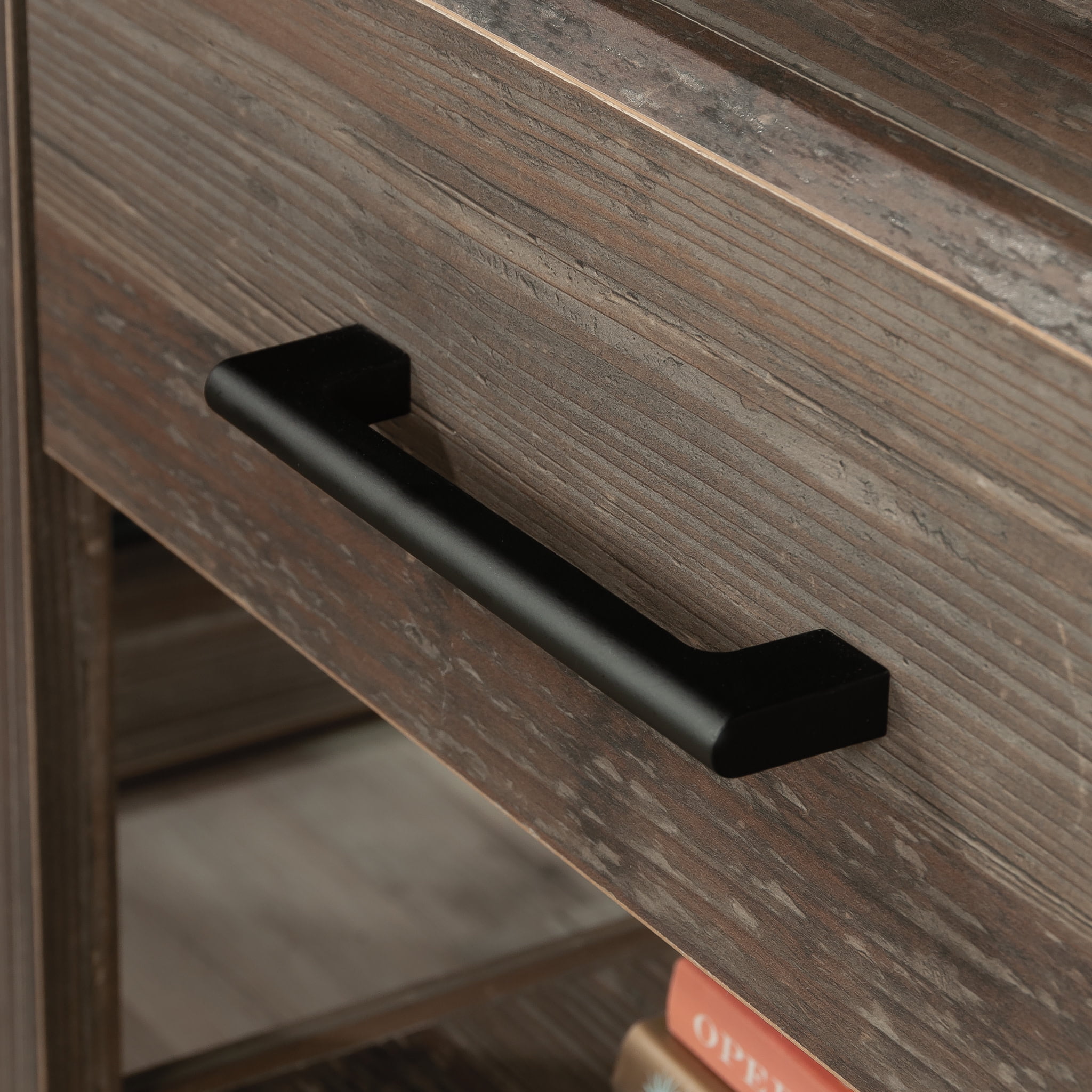 Complete the look of your bedroom with the simplistic charm and universal appeal of this bedside table with drawer from the Summit Station collection. The spacious top surface of this nightstand with drawer provides you with the perfect amount of space for all your bedside needs an accent lamp, a glass of water, an alarm clock, and a place to charge your smartphone. This nightstand with shelves features a convenient storage drawer that opens and closes on smooth metal runners and is ideal for easy access storage for items like your reading glasses and the TV remote. Two open shelves provide you with additional space for storage and display of any other miscellaneous around home essentials. This nightstand with open storage is finished on all sides for versatile placementit looks good no matter where is stands. Finished in Pebble Pine with tapered feet and chamfered edges, this bedside table with shelves gives your home the style and functionality youve been wanting.