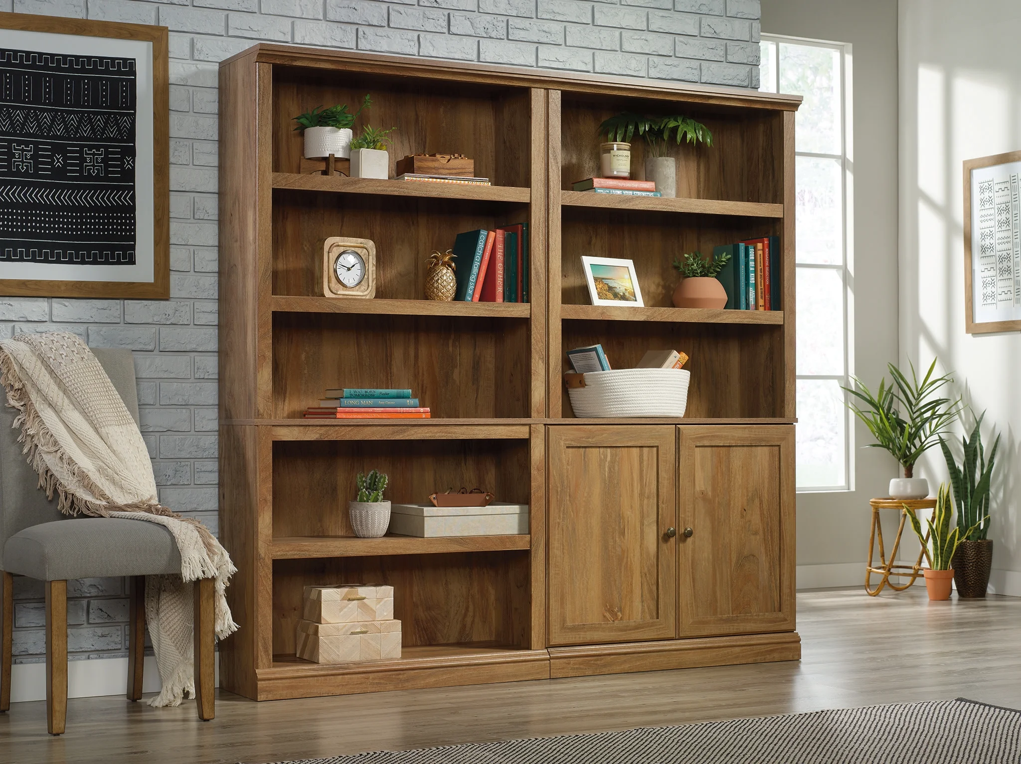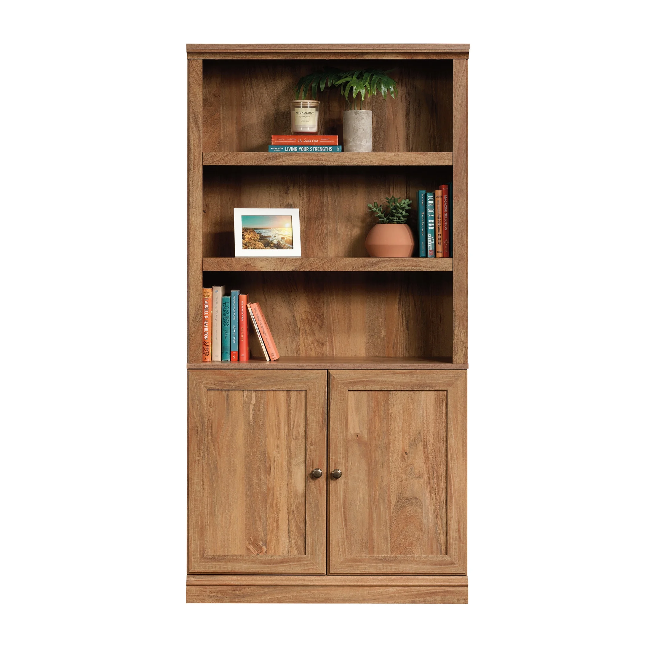 Get storage that makes a statement with this 3-shelf bookcase from the Sauder Select collection. This bookcase with doors features three large shelves with space to store and display items like your collectibles, favorite books, decorative plants, and framed photos of your family and friends. The hidden storage area behind the doors includes a spacious shelf to store items like magazines, storage bins, and items you prefer to keep hidden and out of the way. This transitional bookcase includes three adjustable shelves that can move to store items of all shapes and sizes so you never have to worry about this piece not being able to adjust to your needs and style. Its beautiful style and versatile design make this display bookshelf a great addition to any room. Finished in Sindoori Mango, this stunning wood bookcase with doors is sure to stand out in your home. We hope you like what you see. Our designers travel the world and bring back the best and latest in style, finish, and color trends. This inspiring world travel is evident in the cutting edge and innovative furniture solutions we offer to you! Other affordable furnishings from the collection (sold separately) are available to complete the look. For assistance after the purchase, you can to reach out to our award-winning and friendly Midwest based customer service. They are ready to help you every step of the way with any questions you might have about the product. Please contact us at 1-800-523-3987.