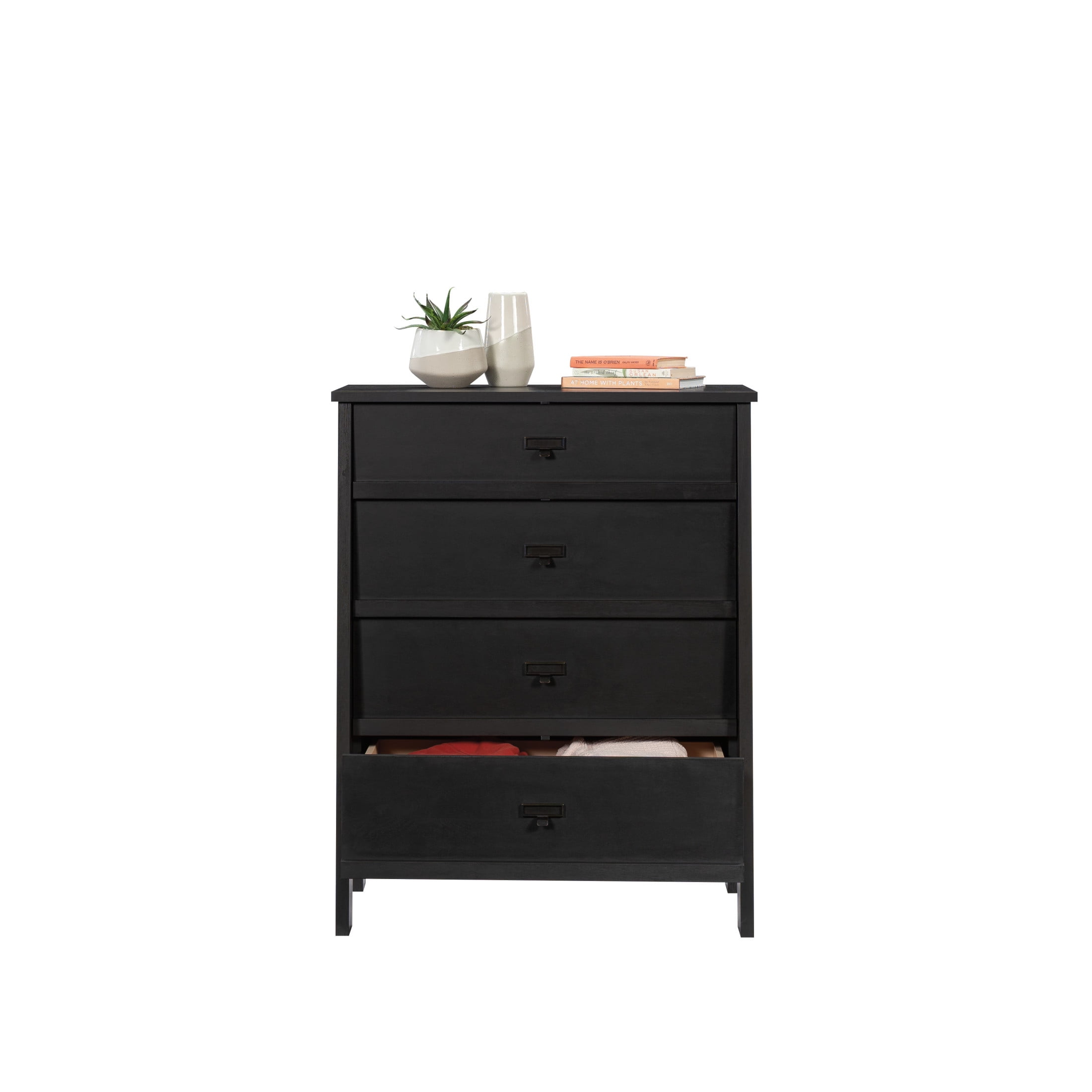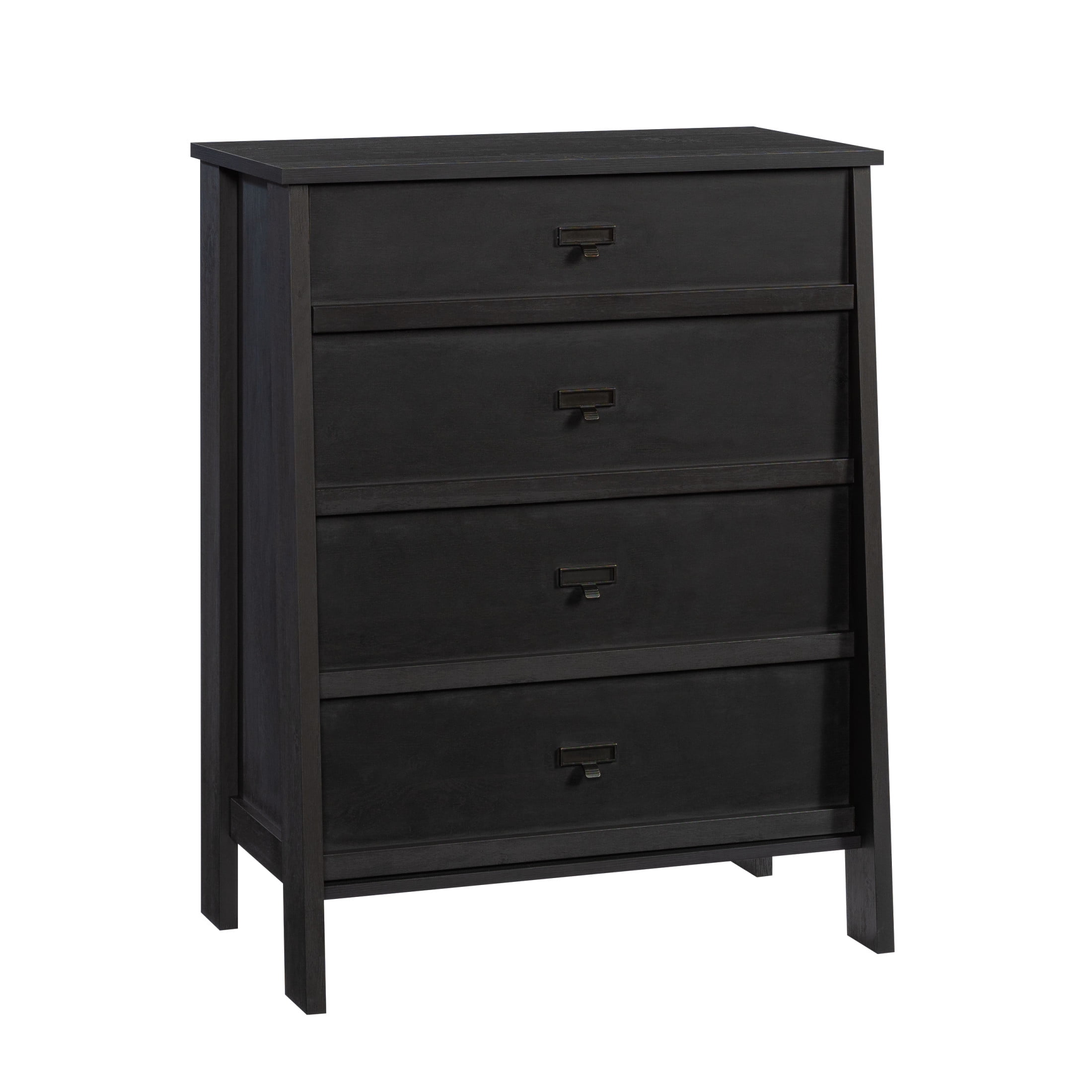 Add some much-needed storage to your bedroom with this 4-drawer chest from the Trestle collection. This bedroom chest of drawers features four large drawers that open and close on smooth metal runners and safety stops. These spacious drawers are ideal for easy access storage to all your favorite wardrobe options your collection of sweaters, stacks of slacks, blouses and you cant forget about your abundance of t-shirts. The three lower drawers of this 4-drawer dresser are extra deep to hold the bulkiest items. Use this dresser with drawers in the master bedroom, guest room, or around your home to hold linens, towels, and more. Assembly is a breeze with the T-lock drawer system. Finished in Raven Oak, this bedroom dresser gives your home the storage you have been looking for. We hope you like what you see. Our designers travel the world and bring back the best and latest in style, finish, and color trends. This inspiring world travel is evident in the cutting edge and innovative furniture solutions we offer to you! Other affordable furnishings from the collection (sold separately) are available to complete the look. For assistance after the purchase, you can to reach out to our award-winning and friendly Midwest based customer service. They are ready to help you every step of the way with any questions you might have about the product. Please contact us at 1-800-523-3987.