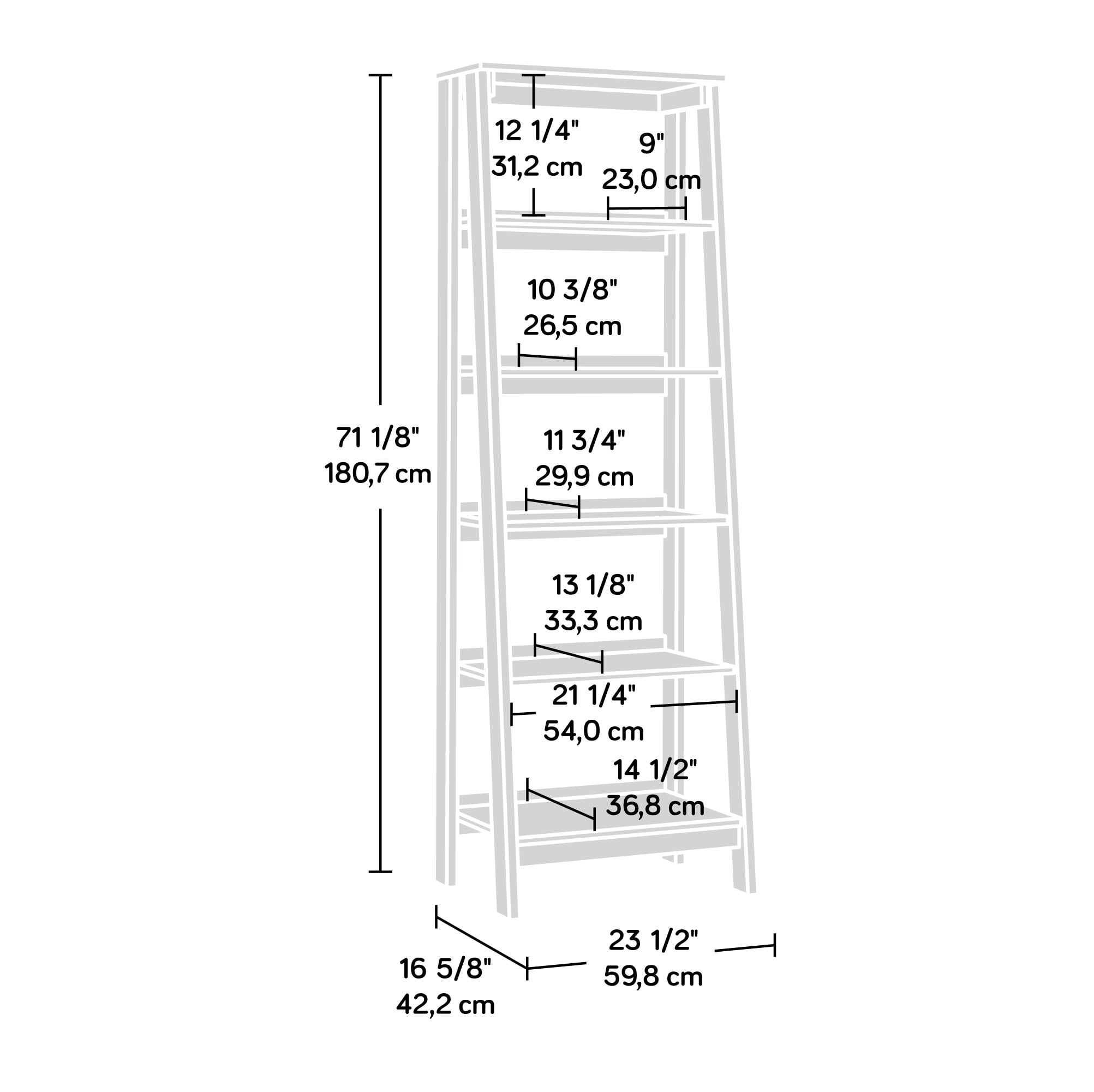 Bring style and storage to your home with this 5-shelf bookcase from the Trestle® collection. Find the perfect place for your awards, books, home décor, organizing bins, and more on the five open storage shelves of this tall bookcase. This living room bookcase is finished on all sides for versatile placement, meaning it will look polished and complete from any angle. Use this tall bookshelf in the bedroom, office, living room, den, or hallway. It is adaptable enough to fit anywhere you need additional open storage space. Finished on all sides in Jamocha Wood®, this versatile ladder bookcase makes a great addition to any room in your home. We hope you like what you see. Sauder designers travel the world and bring back the best and latest in style, finish, and color trends. This inspiring world travel is evident in the cutting edge and innovative furniture solutions we offer to you!Features: Five open storage shelves for your favorite home décor. Holds books, photos, collectibles, and more. Finished on all sides for versatile placement anywhere in your home. Bookcase is designed to lean against wall Finished on all sides for versatile placement Manufactured domesticallySpecifications: Product Dimensions: 71.15″ H x 23.55″ W x 16.62″ D Product Weight: 60 lbs Weight Capacity: 40 lbs