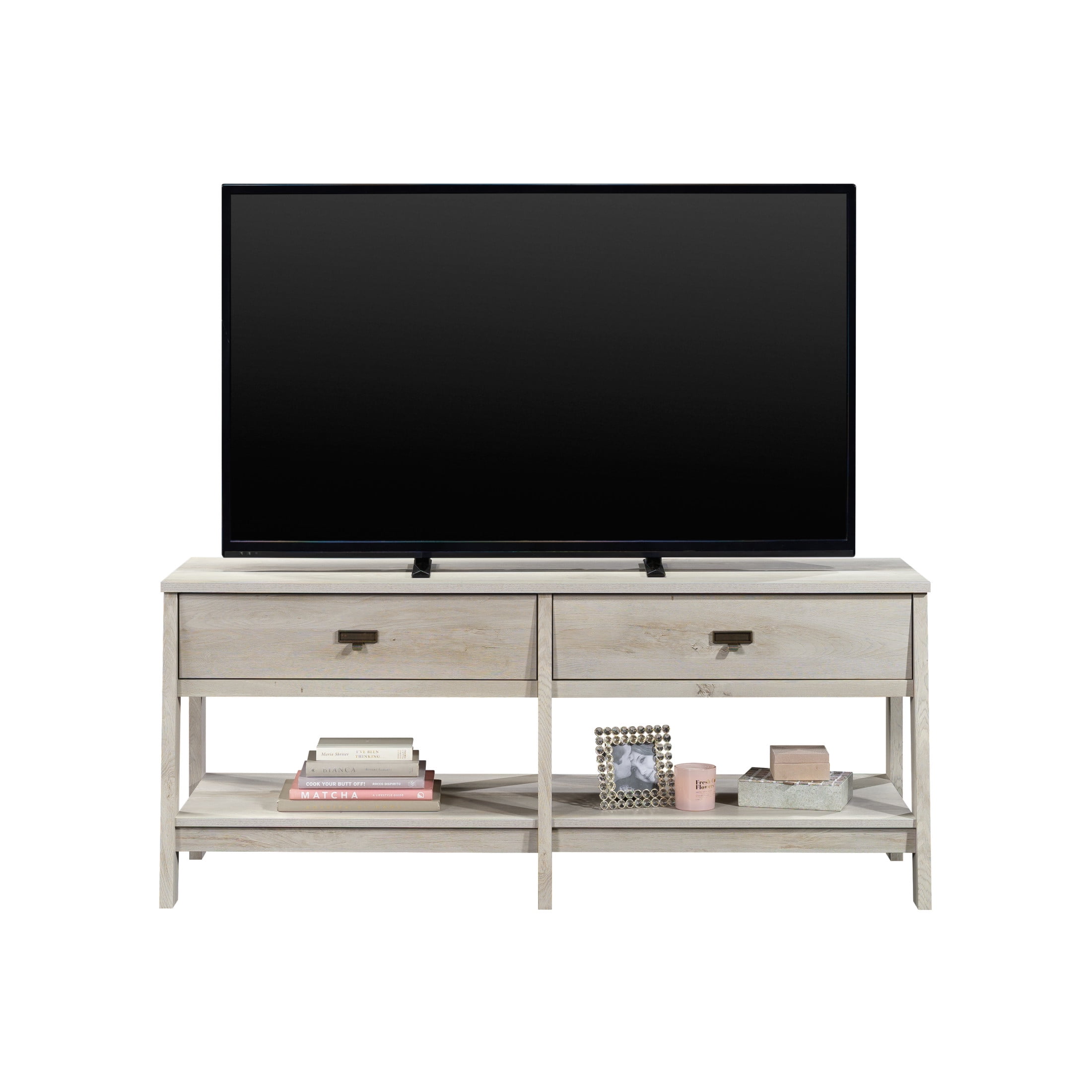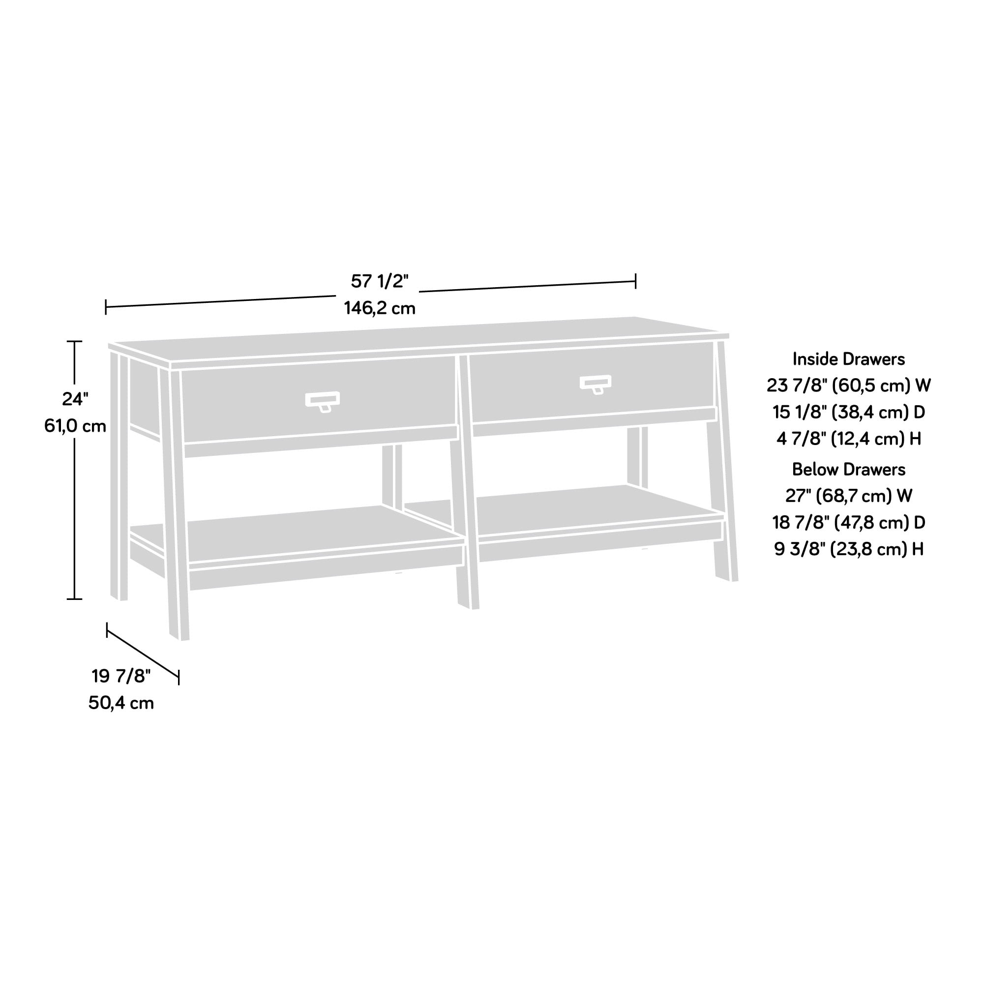 Assembled Dimensions: 57.56″ L x 19.84″ W x 24.02″ H Accommodates up to a 60″ TV weighing 70 lbs or less Two drawers feature metal runners and safety stops for remotes, DVDs, and more Open shelving for storage and display of audio/video equipment Quick and easy assembly with T-lock drawer system Chalked Chestnut finish Model #: 428841 Box Dimensions: 63.5″ L x 19.5″ W x 4.25″ H For additional questions or any issues, please contact the manufacturer at 1-800-523-3987. Be sure to check out the Sauder Trestle collection for more great items!