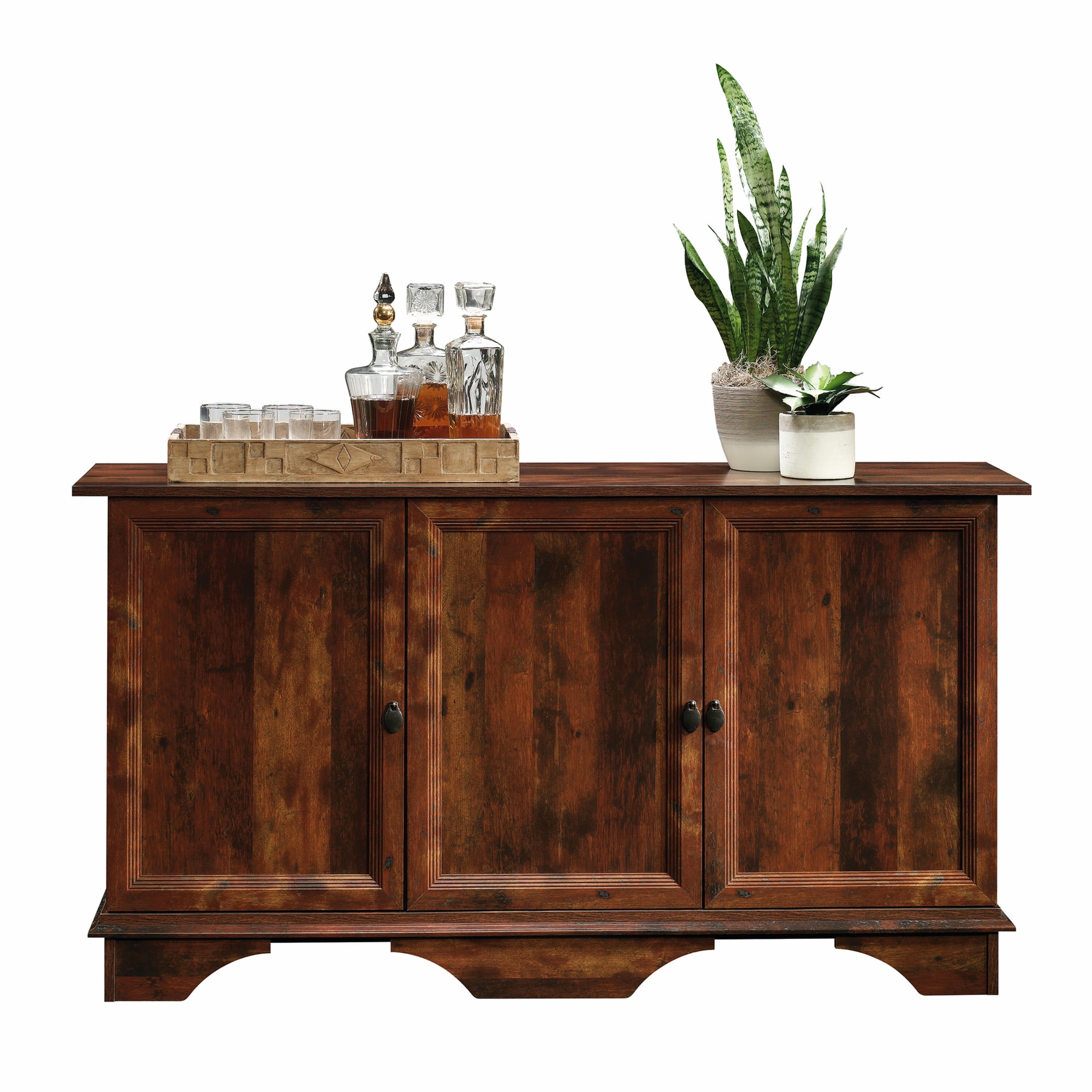 Looking to add some storage to your life? Stash your stuff in style with this storage cabinet from the Viabella collection. Find room for all your goodies and treasures! This storage cabinet with doors features an adjustable shelf behind each door so you can stock it full of books, dishes, bins, games, and more. The adjustable shelves allow you to customize your storage space to accommodate your specific needs. How perfect! This storage credenza can be used in the dining room as a bar cart, the entryway as a stylish accent piece, or the guest room for extra storage space. The unique look of this cabinet is sure to catch the eye of any guest and will beautify any space in your home. Finished in a stylish Curado Cherry, this console will add some flavor to any room. We hope you like what you see. Sauder designers travel the world and bring back the best and latest in style, finish, and color trends. This inspiring world travel is evident in the cutting edge and innovative furniture solutions we offer to you!