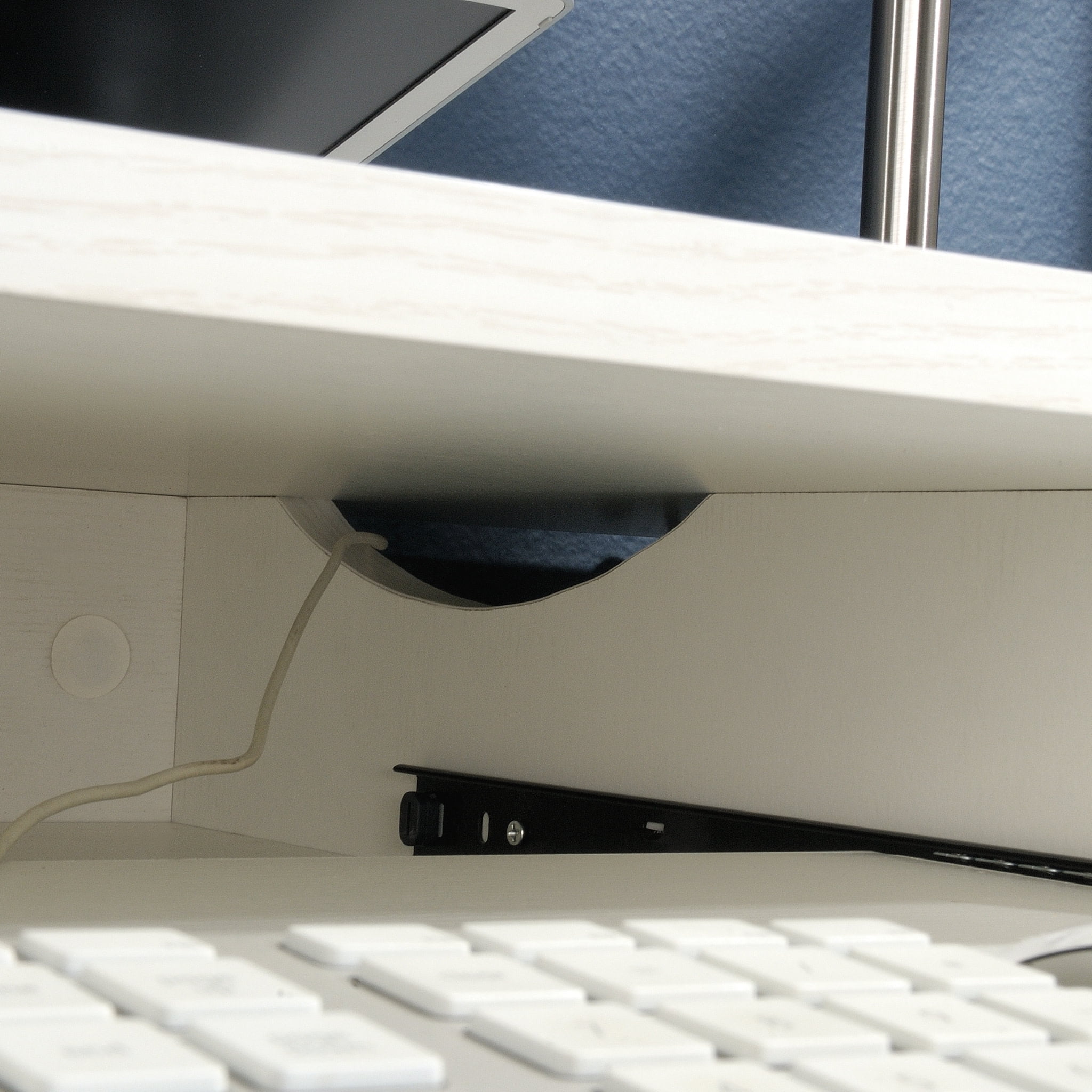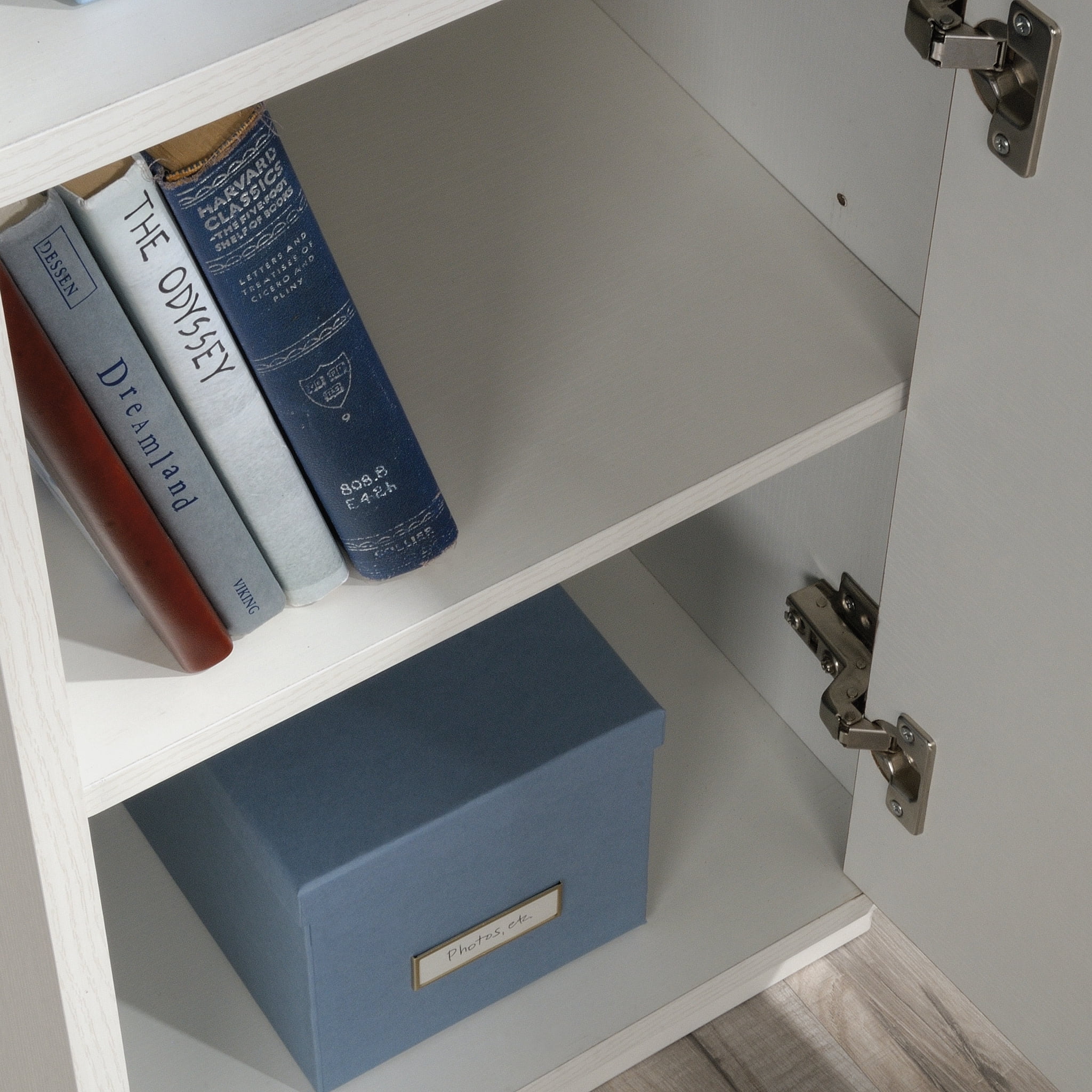 Assembled Dimensions: 47.64″ L x 23.62″ W x 30.16″ H Flip-down front reveals slide-out keyboard/mouse shelf with metal runners and safety stops Storage area behind door holds vertical CPU tower and has an adjustable shelf for flexible storage options Open storage shelf above door for office supplies Accented with metal corner brackets and handles Finished on all sides for versatile placement anywhere in your home Pearl Oak” finish with Blaze Acacia accents Model #: 425845 Box Dimensions: 52.76″ L x 26.75″ W x 5.91″ H For additional questions or any issues, please contact the manufacturer at 1-800-523-3987. Be sure to check out the Sauder Vista Key collection for more great items!