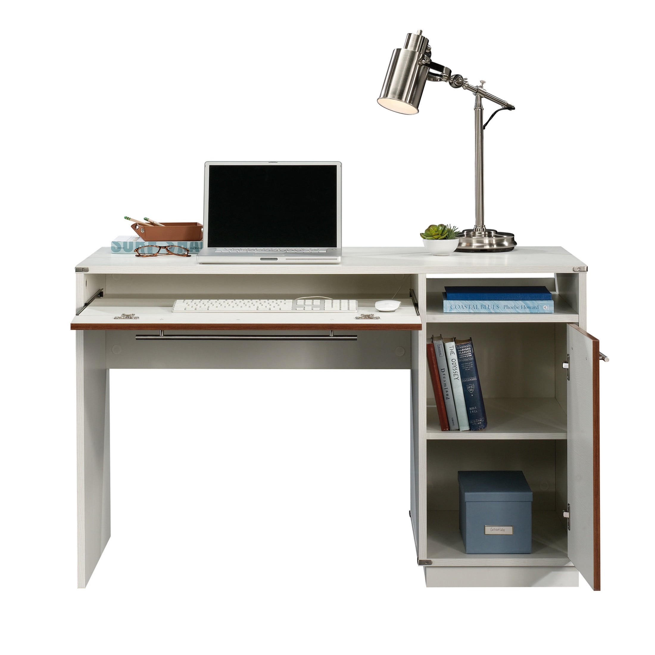 Your office space deserves to look as stylish as the rest of your home. Add a touch of coastal-inspired style and design to your home office with this computer desk from the Vista Key collection. This home computer desk offers a spacious top surface with room for all your desk essentials like folders, notepads, laptop, and your hot cup of coffee. The PC desks flip-down front reveals a slide-out shelf that opens and closes on smooth metal runners to set your keyboard and mouse. You can place your vertical CPU tower in the hidden storage area behind the desks door, which also includes an adjustable shelf. This shelf can be moved to different heights to store items of all shapes and sizes. Plus, the open storage shelf above the door provides easy-access storage for supplies like envelopes and stapler. Attractive from every angle, this modern computer desk is finished on all sides for versatile placement and is detailed with metal corner brackets and handles. Finished in Pearl Oak with Blaze Acacia accents, this stunning computer desk with storage will have your home office looking sharp.