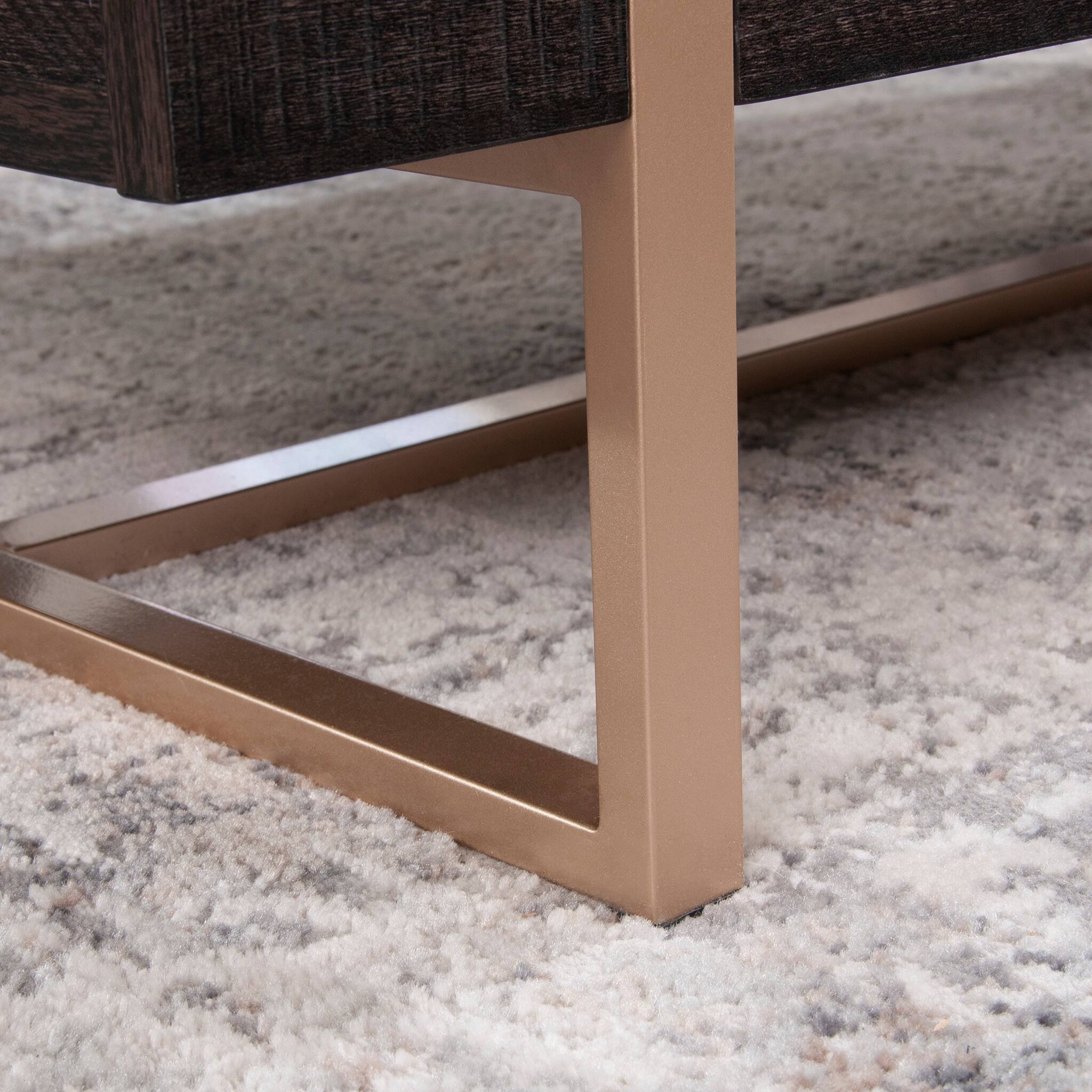 Never have you encountered a captivating lift-top coffee table like this one, from the Walter Heights collection. This modern lift top coffee table effortlessly combines style and versatility, making it a perfect addition to any living room. With a simple rising motion, the top of this lift top coffee table with storage transforms into a versatile work surface, ideal for enjoying meals, working on laptops, or engaging in creative projects. Beneath the lift-top, hidden storage awaits, allowing you to keep your living space clutter-free and organized. Crafted with a blend of wood and metal, this coffee table with lift-top is dressed in the smooth, dark Blade Walnut finish that radiates warmth and elegance. The powder-coated metal frame, finished in a luxurious champagne gold, adds a touch of sophistication to its overall design. Finished on all sides, this wood and metal coffee table offers versatile placement options, allowing it to complement any room arrangement. Embrace the fusion of practicality and style with this statement piece that will elevate any living space to new heights of contemporary charm.