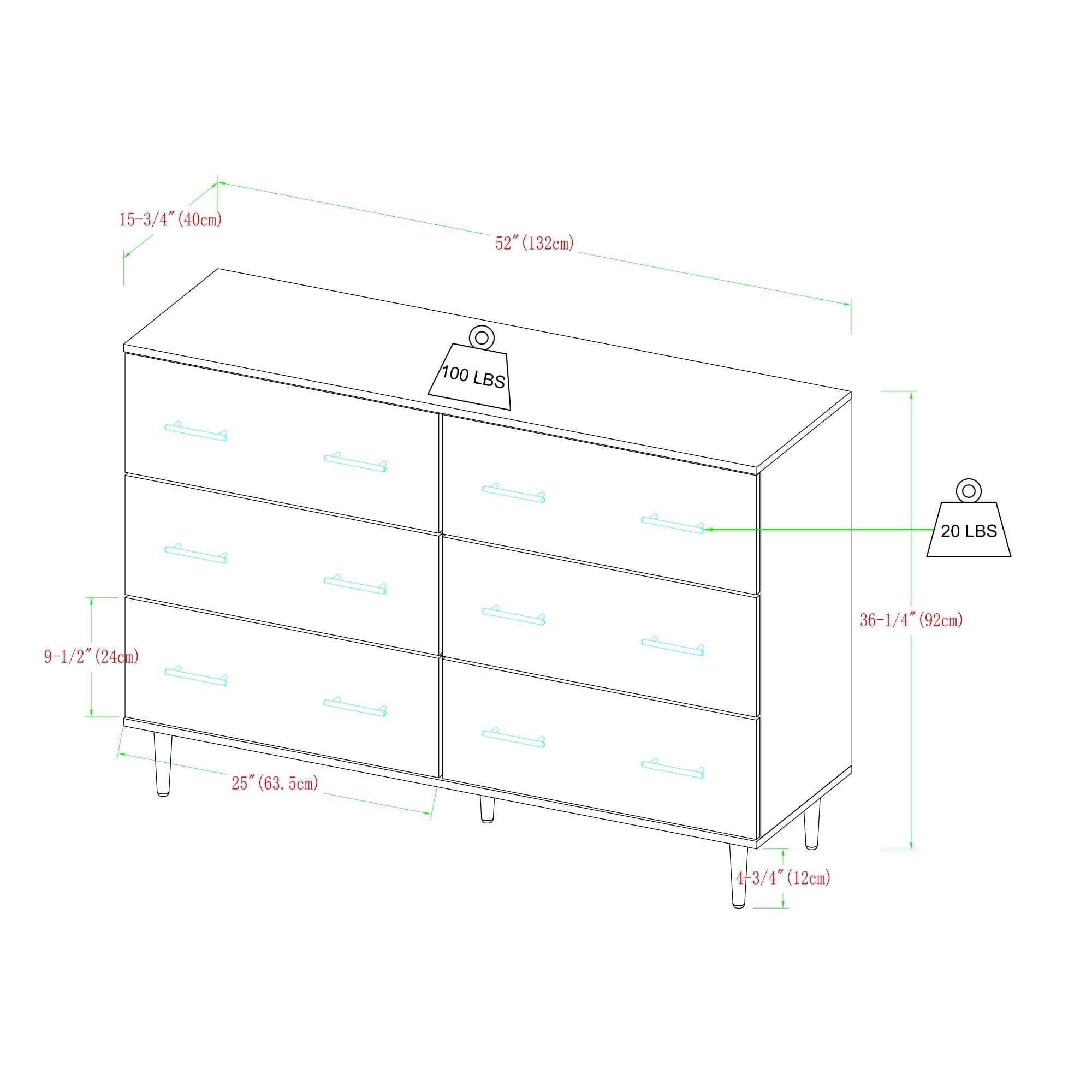 Packaged Dimensions: 9” H x 60” L x 19” W Assembled Dimensions: 36″ H x 52″ L x 16″ W Materials: High-grade MDF, durable laminate, and powder-coated metal Assembly: Some assembly required Modern dresser Rustic oak and white finish Two-tone Metal legs and handles 6 drawers Anti-tip hardware 5 legs for extra balance