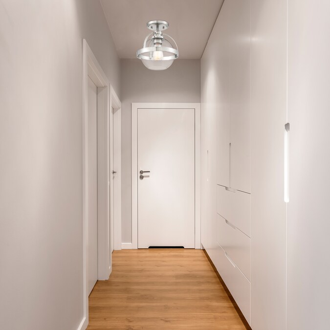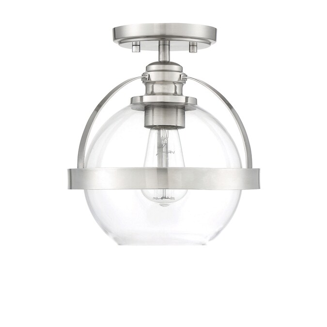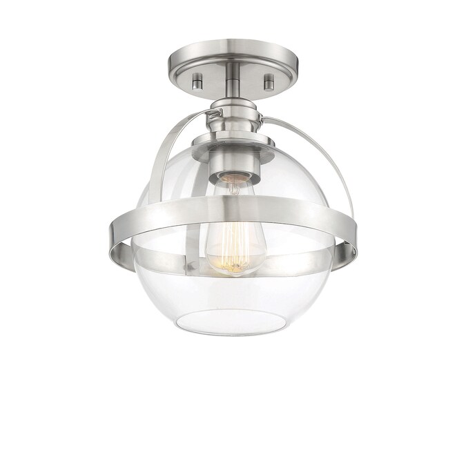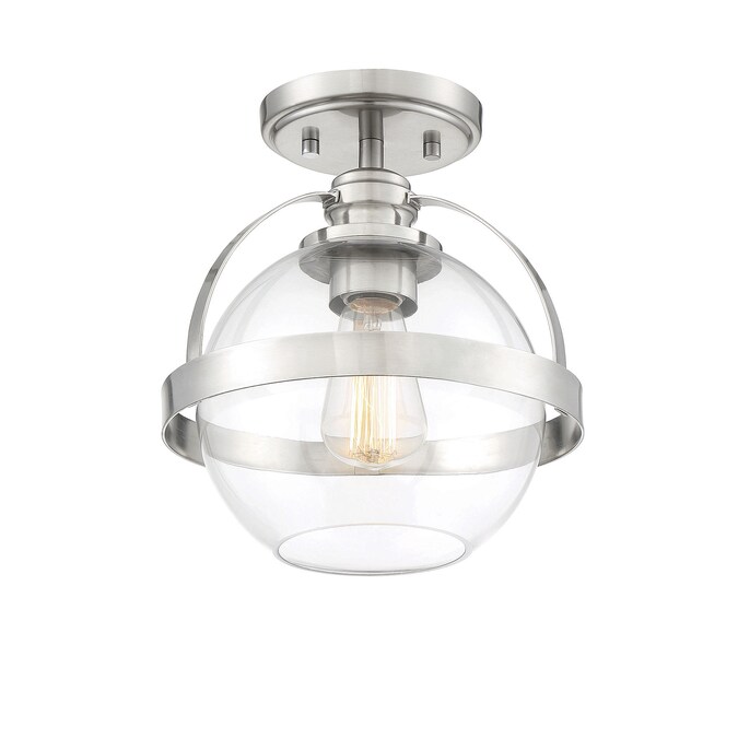 This Savoy House Pendleton 1-light ceiling semi-flush mount is a smart way to pep up the illumination and style in any room, including small spaces that might otherwise have lackluster light. It showcases a large orb of clear glass that is open at the bottom, allowing for more direct light and making it easy to replace the bulb. Metal bands bisect the shade and help hold it to the fixture’s base. Try using this fixture in laundry rooms, closets, hallways or entryways, though truly the possibilities are endless. Finished in satin nickel. This fixture is 9.38″ wide and 9.75″ tall. Uses a standard size bulb of up to 60 watts (not included).
