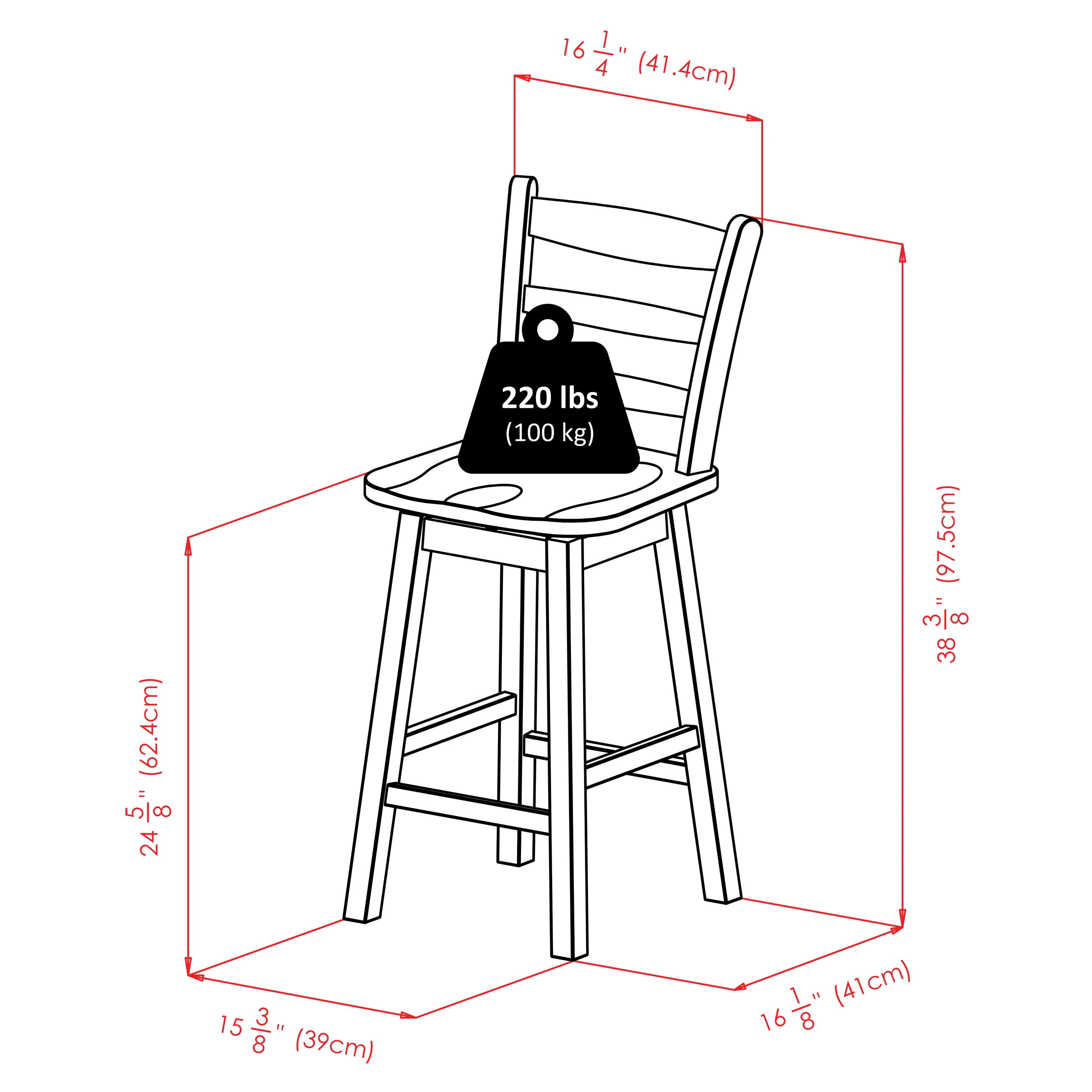 Seat swivels 360 degrees Ladder back support 2 sets of crossbars for support and footrests Made of Solid Wood Static weight capacity 220 lbs. Assembly required Ships in 1 box