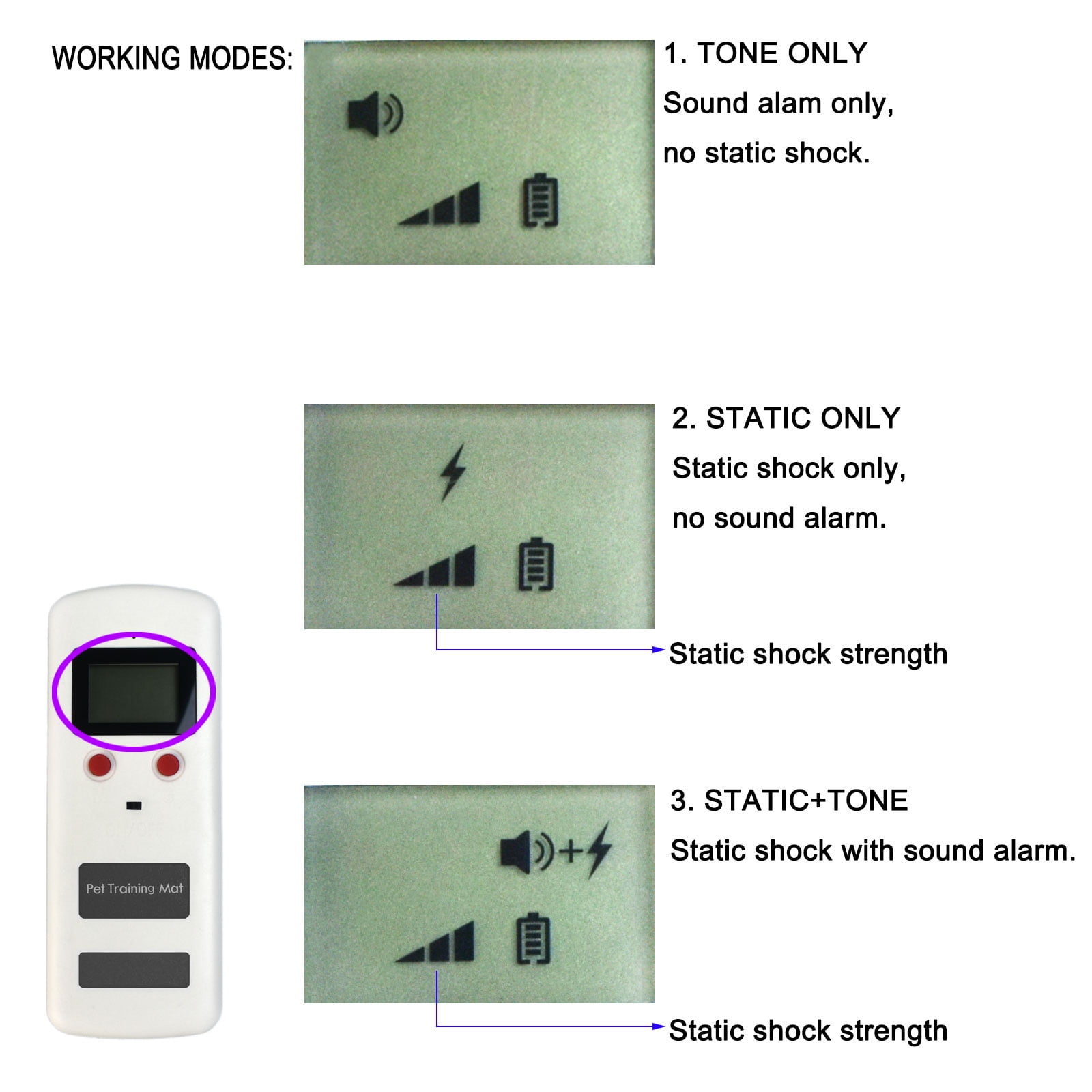 The pet training mat can help you train your cats and dogs to stay away from some areas, such as sofa, bed, chair, baby activity area, kitchen counter, furniture and other areas that you want to protect. The upgrade pet shock mat with a LCD display, you can check the status very convenient, and it is easy also to switch the working mode and static strength with the buttons as you like. Strength: LOW(1 bar), MIDDLE(2 bars), HIGH(3 bars). It is a low-voltage pet shock mat that can be safely used anywhere in the room. Train your pet safely and effectively away from certain areas. So you are not worried that the shock mat will harm them. The pet repellent mat provides 3 working modes (TONE, TONE+STATIC, STATIC). It can work with any size of cats or dogs. TONE: sound alarm, it is very safe that you can check the mat with your hand. TONE+STATIC: sound alarm + electric shock. STATIC: electric shock only, no sound. For static, there are 3 strength levels you can set The electric mat can be placed on your flat floor or sofa easily. It is convenient to place and roll up for storage. Made of transparent soft PVC material, it is durable and easy to clean with wet towels. NOTE: only when your pet paws or skin touching across 2 wires on the mat, the mat will work to your pet.