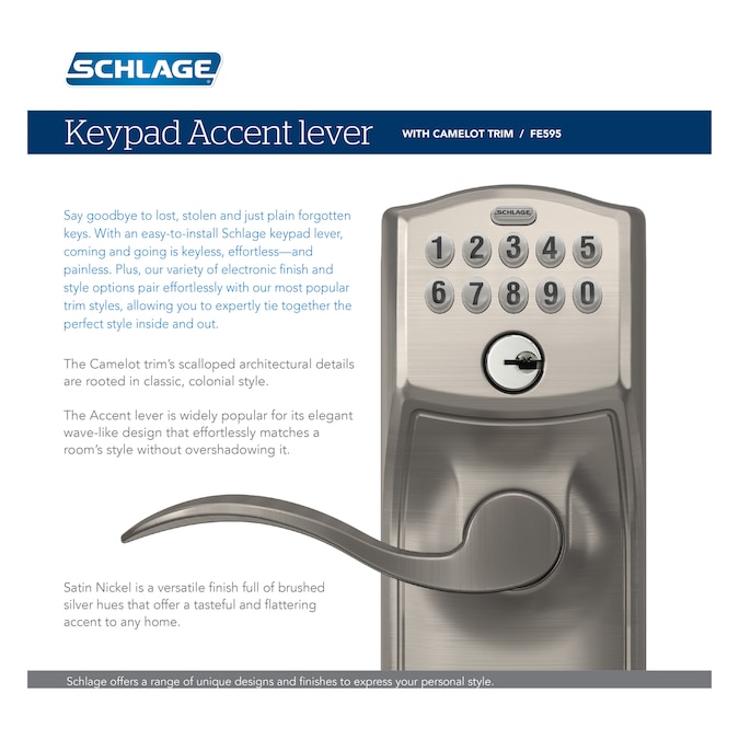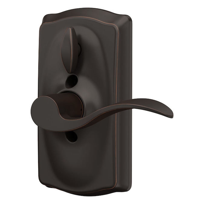 Keypad lever offers convenient keyless access. Accent lever design features subtle curves to compliment a wide range of styles from traditional to contemporary. The dark tones of aged bronze are contrasted by the warm, hand-finished bronze relieve.