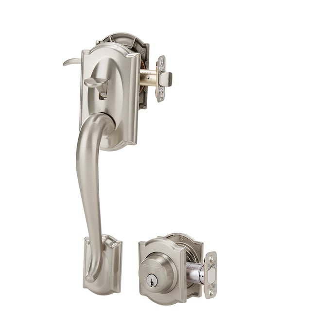 This Schlage handleset features a decorative deadbolt, matching exterior handleset grip and interior passage door knob or lever. Offering premium construction combined with a sleek design and industry-leading warranty, this is the perfect door handleset for your customized entryway. Trust your home to Schlage, makers of high-quality, innovative door hardware for over 100 years.