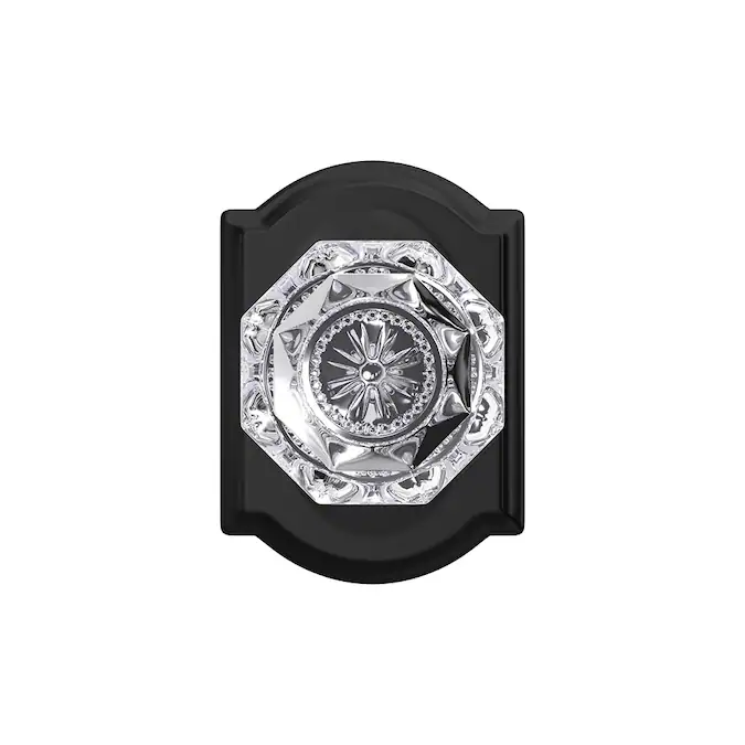 The Schlage Custom Alexandria non-turning glass knob with Camelot trim in matte black is uniquely designed with premium style in mind, featuring low profile trim and concealed screws for a more polished look. Schlage Custom non-turning hardware comes in pairs, making it perfect for French doors. Inspired by the Victorian era, the Alexandria glass knob is multi-faceted with classic detailing sparkling in the center, while the Camelot trim’s scalloped architectural details make any room charming and approachable. The striking appearance of the matte black finish creates an elegant look that’s sure to be noticed in any style setting.