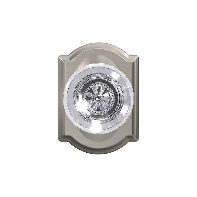The Schlage Custom Hobson Glass Knob with Camelot Trim Hall-Closet and Bed-Bath Lock in Satin Nickel is uniquely designed to work on both Hall-Closet and Bed-Bath doors. It’s easy to switch between locking and non-locking functions. Just insert or remove the locking pin from the pinhole on the interior side of the hardware. Schlage Custom hardware is also designed with premium style in mind, featuring low profile trim and concealed screws for a more polished look. The Hobson glass knob is the perfect high-end statement piece for styles ranging from traditional to eclectic transitional, while the Camelot trim’s scalloped architectural details make any room charming and approachable – especially when finished in our versatile Satin Nickel finish.