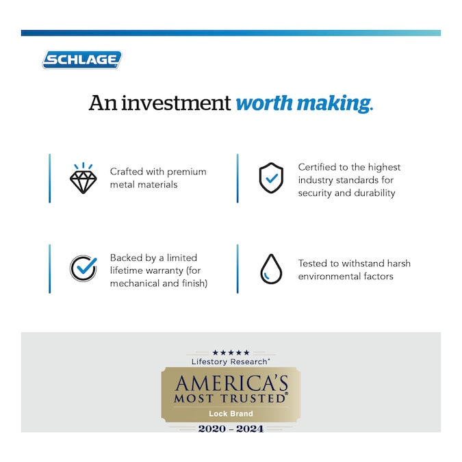 - TRUSTED WARRANTY: Schlage locks are backed by a limited lifetime mechanical and finish warranty; see Schlage warranty for full details
